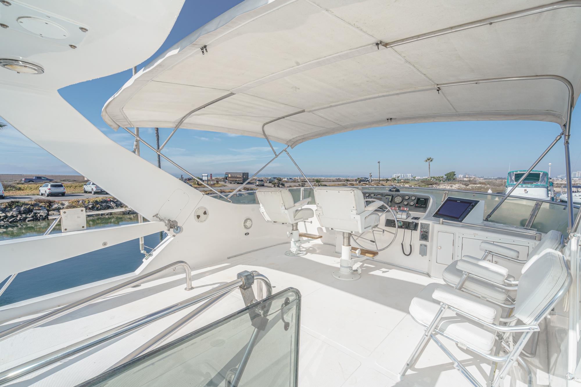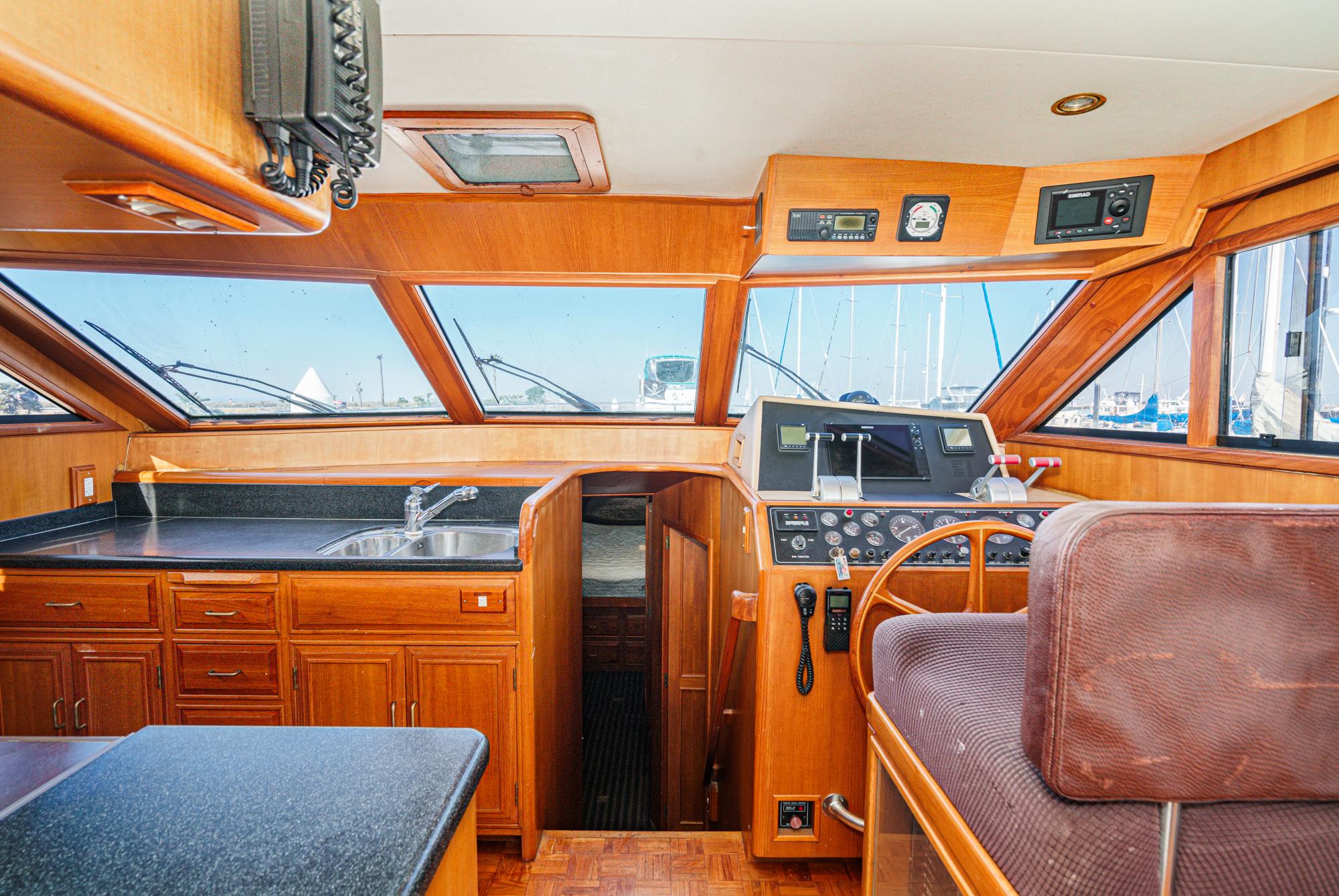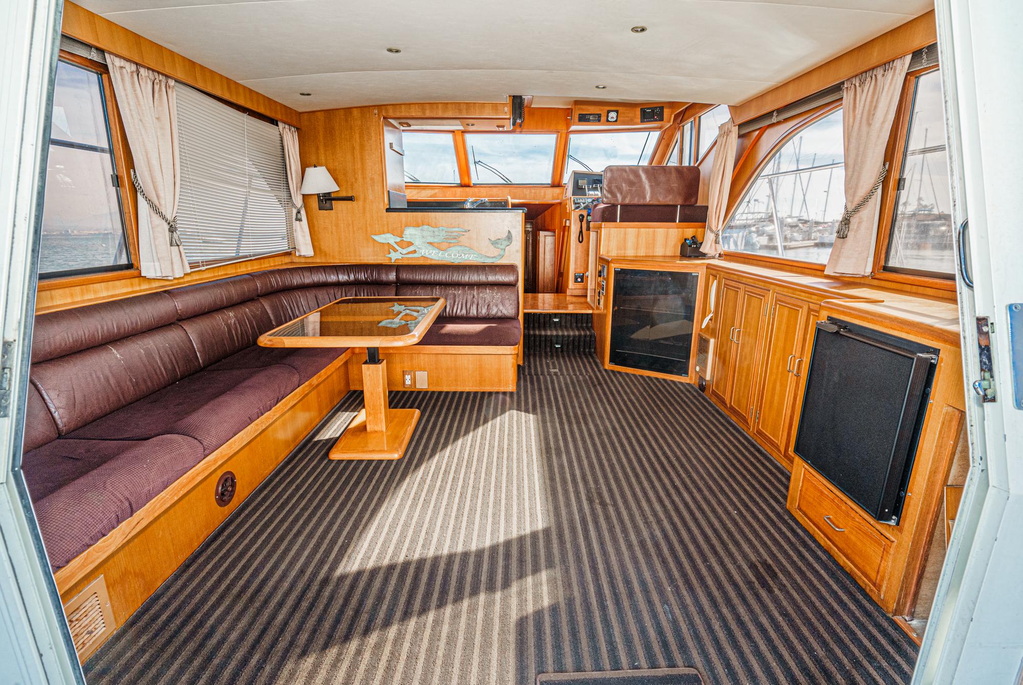Features mini-blinds, built-in settee with leather cushions, access to engine room (forward salon), hydraulic hi/lo table with glass top, raised steering seat w/ locker under, 12-volt round halogen ceiling lights, steering control station, electronic teak panel overhead, teak valance w/ tube light, hot water heat and electric heat w/ thermostats. Entertainment center has 24″ Samsung up and down TV with sound bar, sound system, deluxe teak storage lockers with shelving, U-line icemaker, Novia refrigerator and ice maker new in 2021,