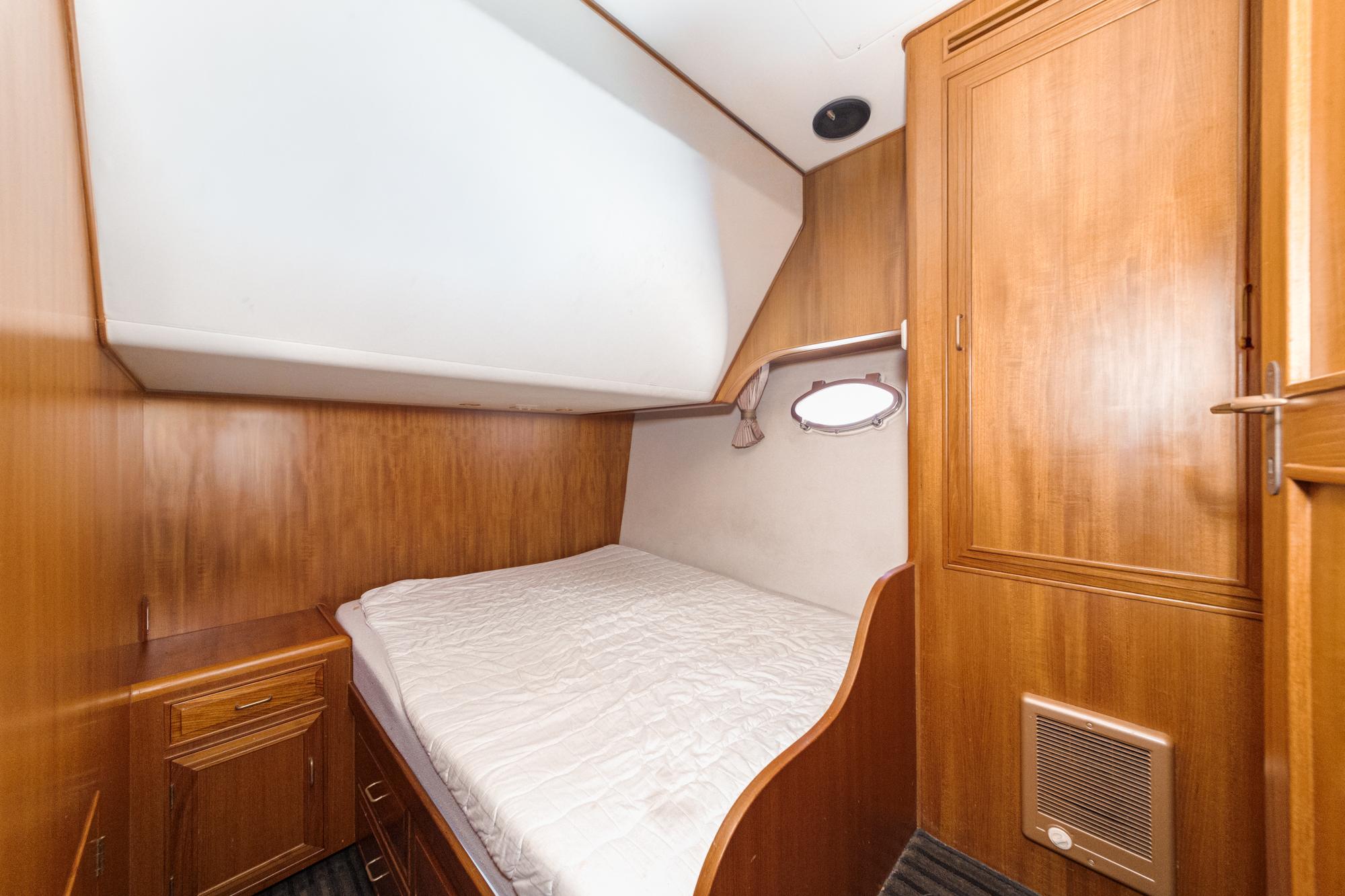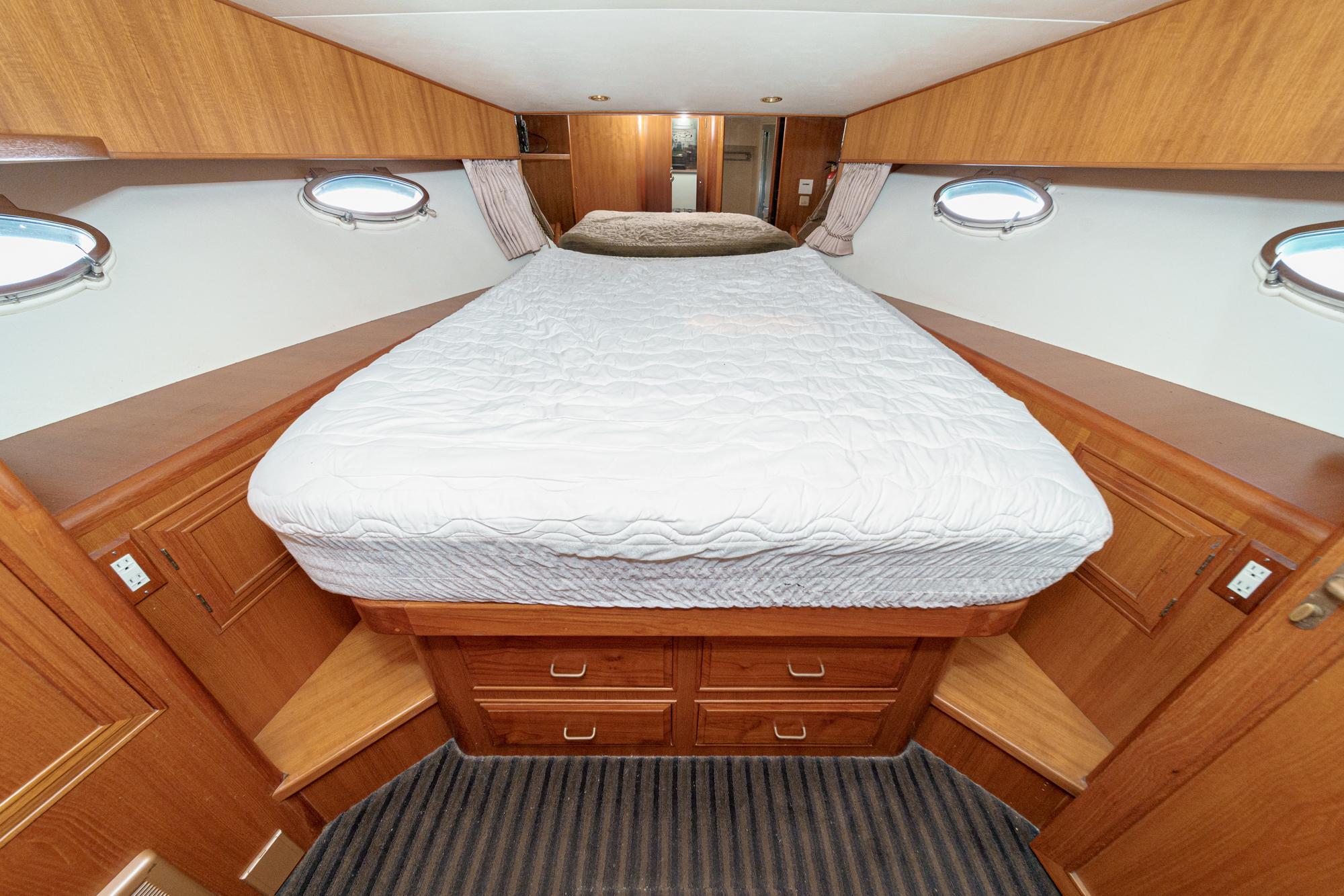 Features large double berth with premium memory foam with hinge fold, fitted mattress cover, large drawers under berth, private head with stall shower, four S/S portholes, skylight hatch with screen, soft vinyl hull sides, mirror on front bulkhead and door, full-height cedar-lined hanging locker with automatic lighting, tube light under bunk and behind valence, chain locker in forepeak, 12-volt halogen round ceiling lights, draperies, TV, sound system, Corian and Grohe fixtures, hot water heat w/ thermostats, electric heat w/ thermostats, Simrad multi-function readout, 21′ LGTV.