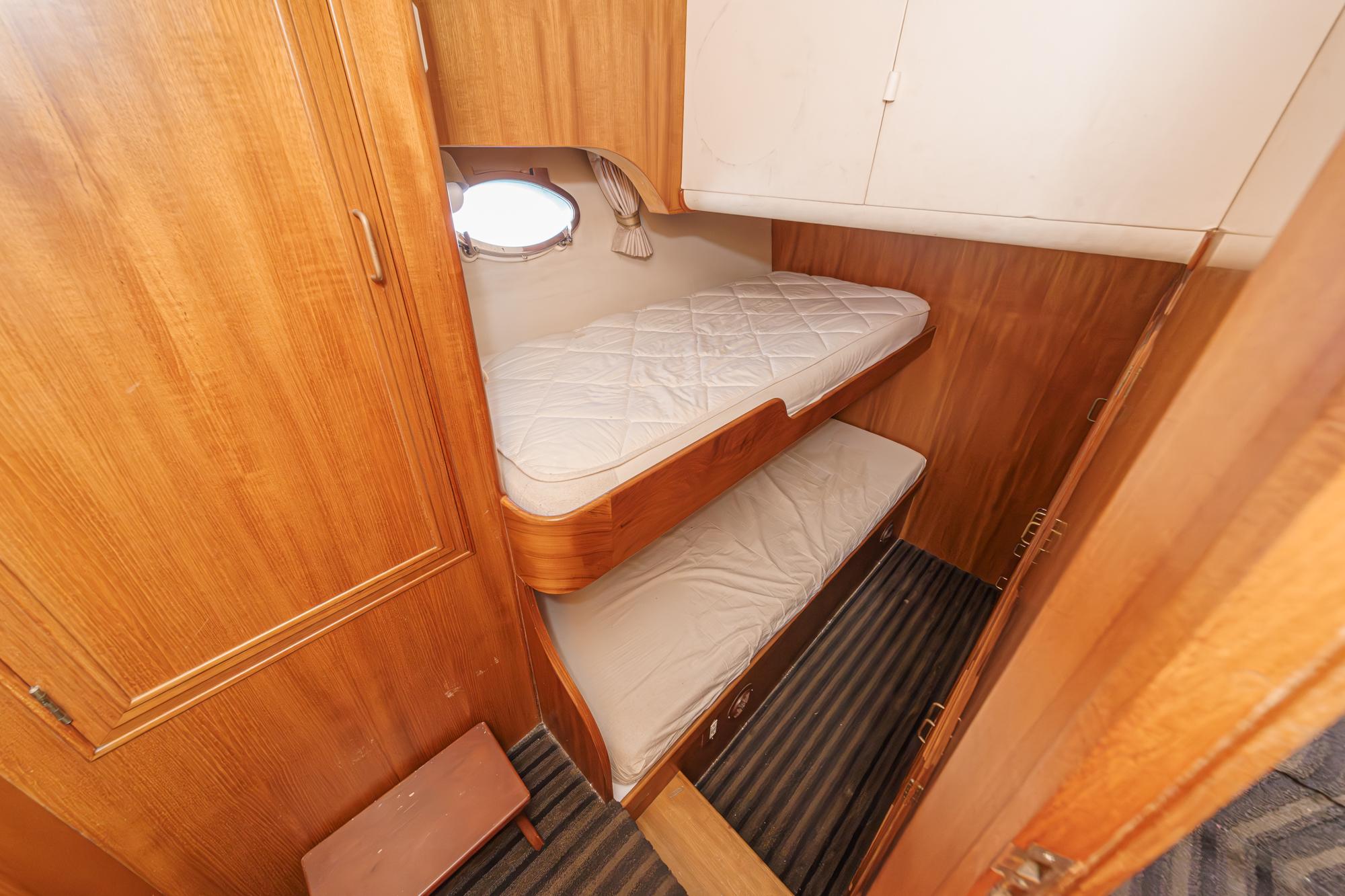 Features two single hi-lo berths, two oval portlights, 12-volt halogen round ceiling lights, two reading lights, soft vinyl on hull sides, cedar-lined hanging locker w/ auto lighting, washer/dryer combo, hot water heat w/ thermostat, sound system, drawers and lockers next to washer/dryer.