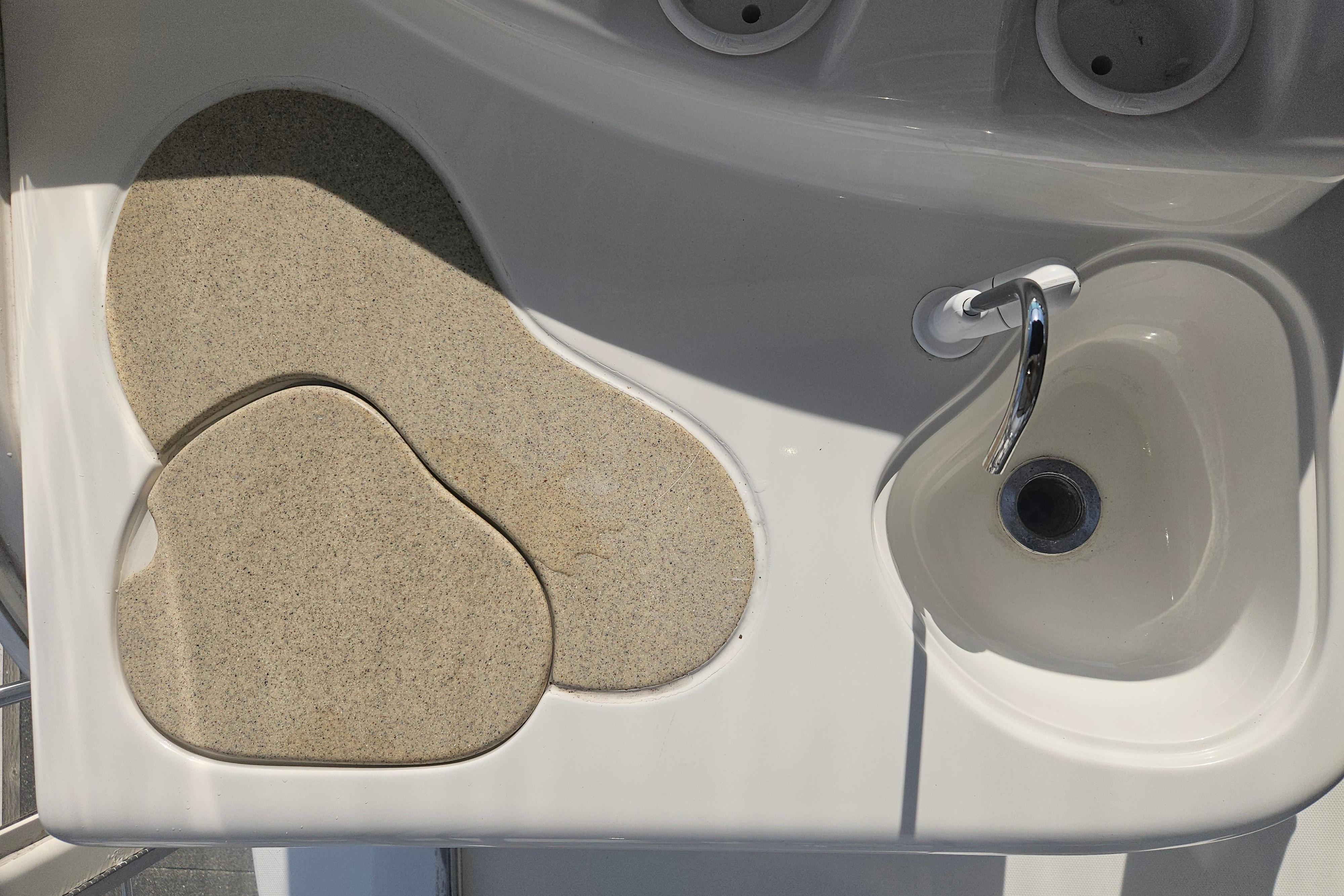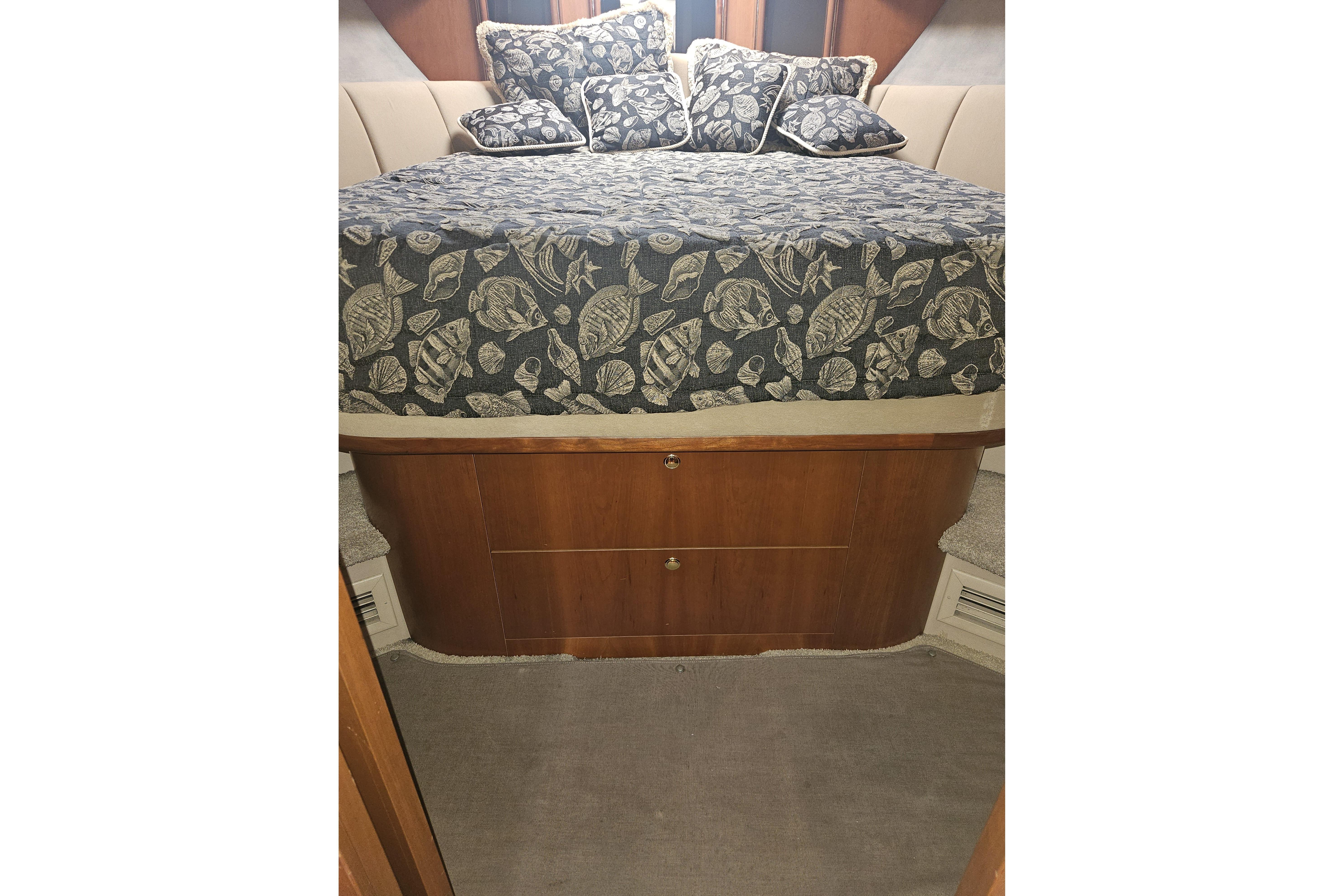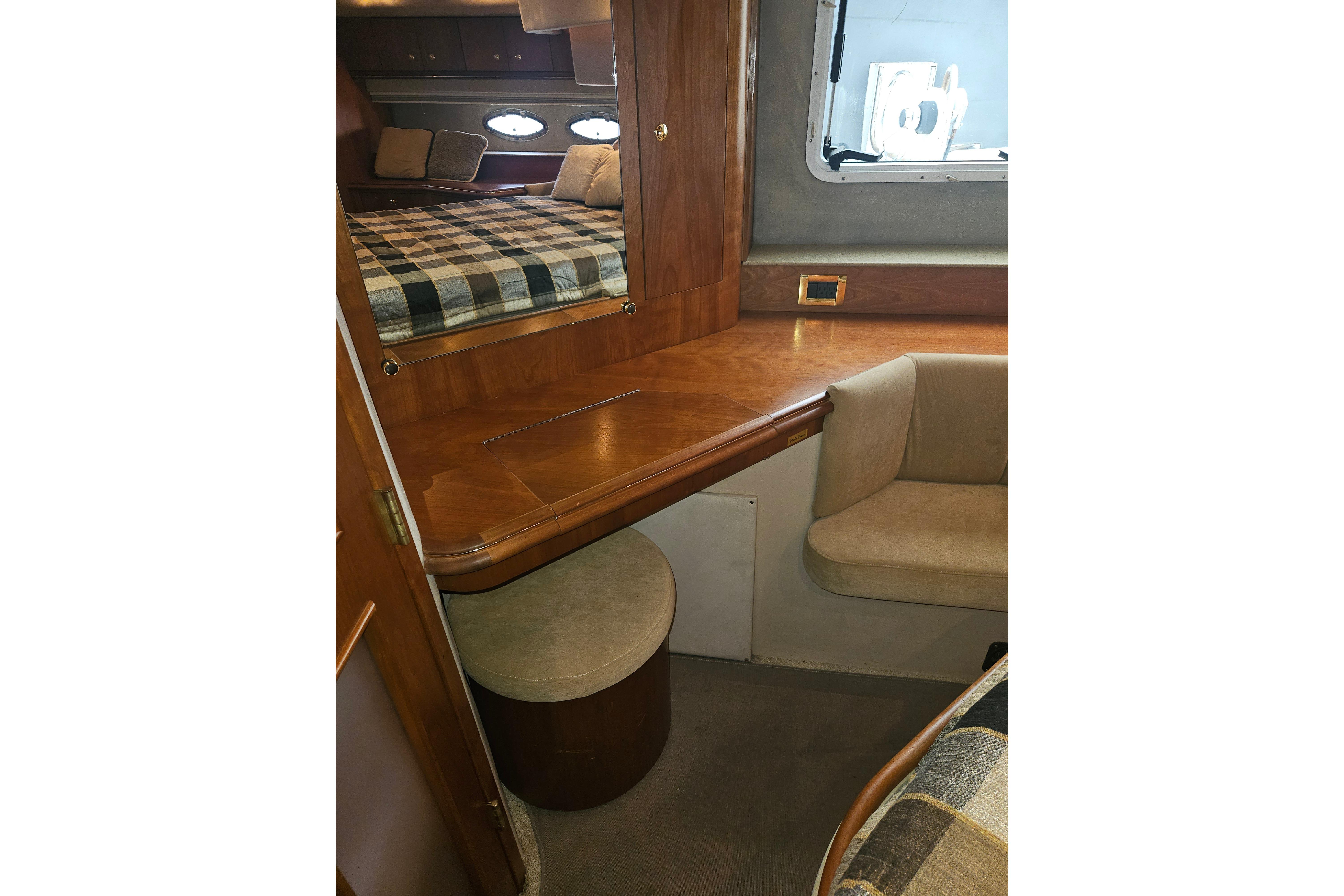 Below deck, the layout features three private staterooms and two heads, including a full-beam master suite aft with an ensuite head and bathtub—an exceptional feature in a yacht of this size. The forward VIP stateroom offers a comfortable island berth, while the mid-guest cabin provides flexible accommodations for family or friends.