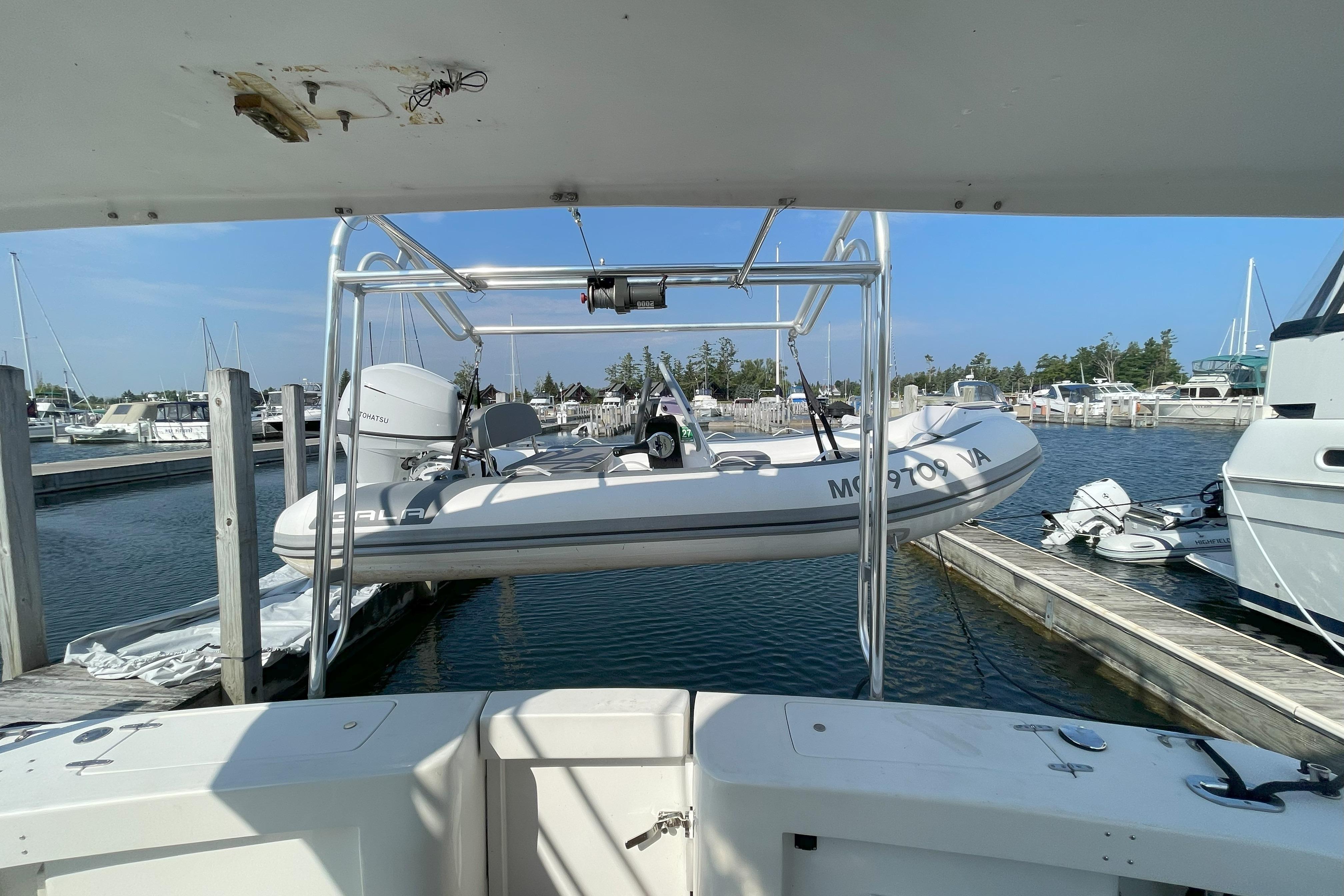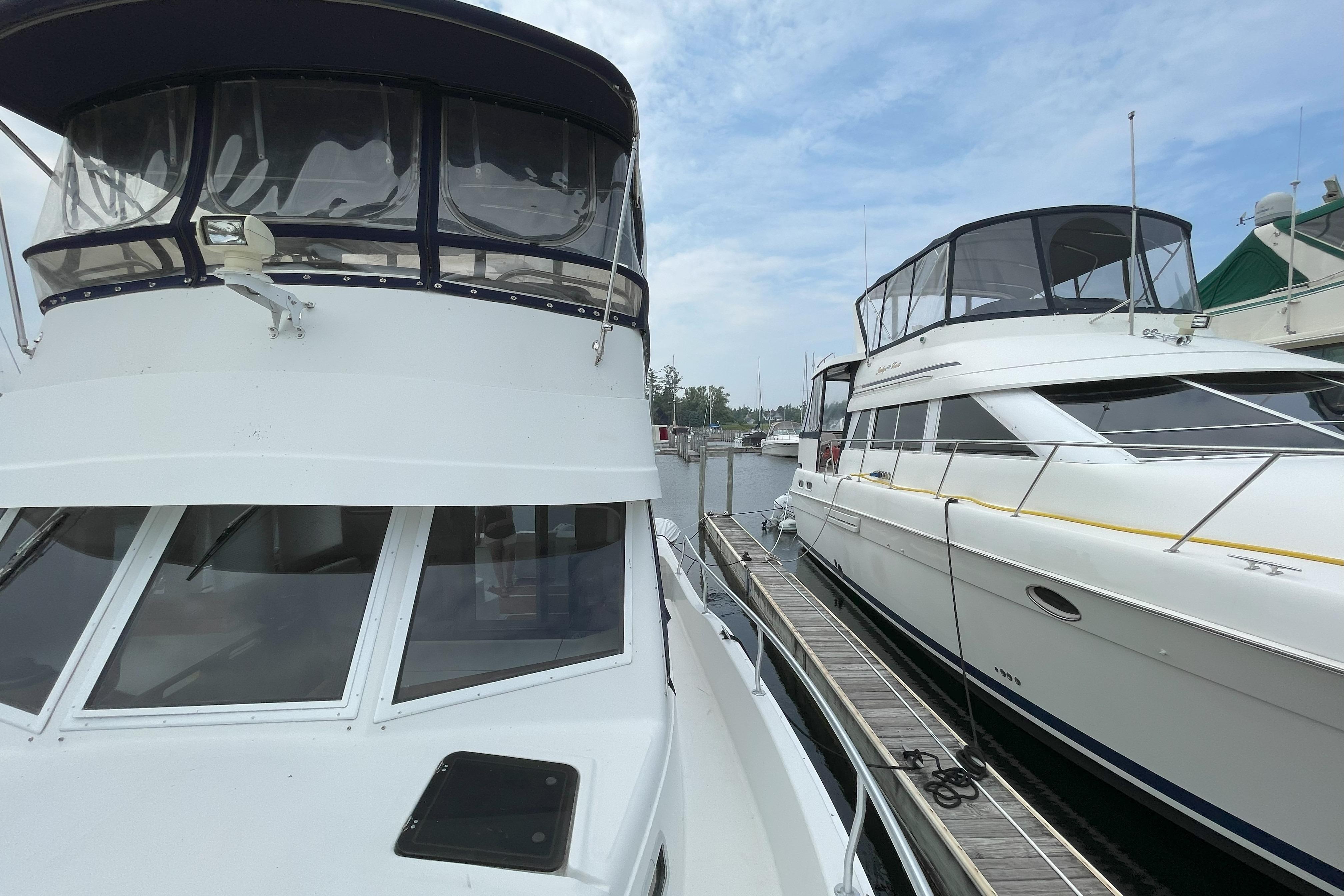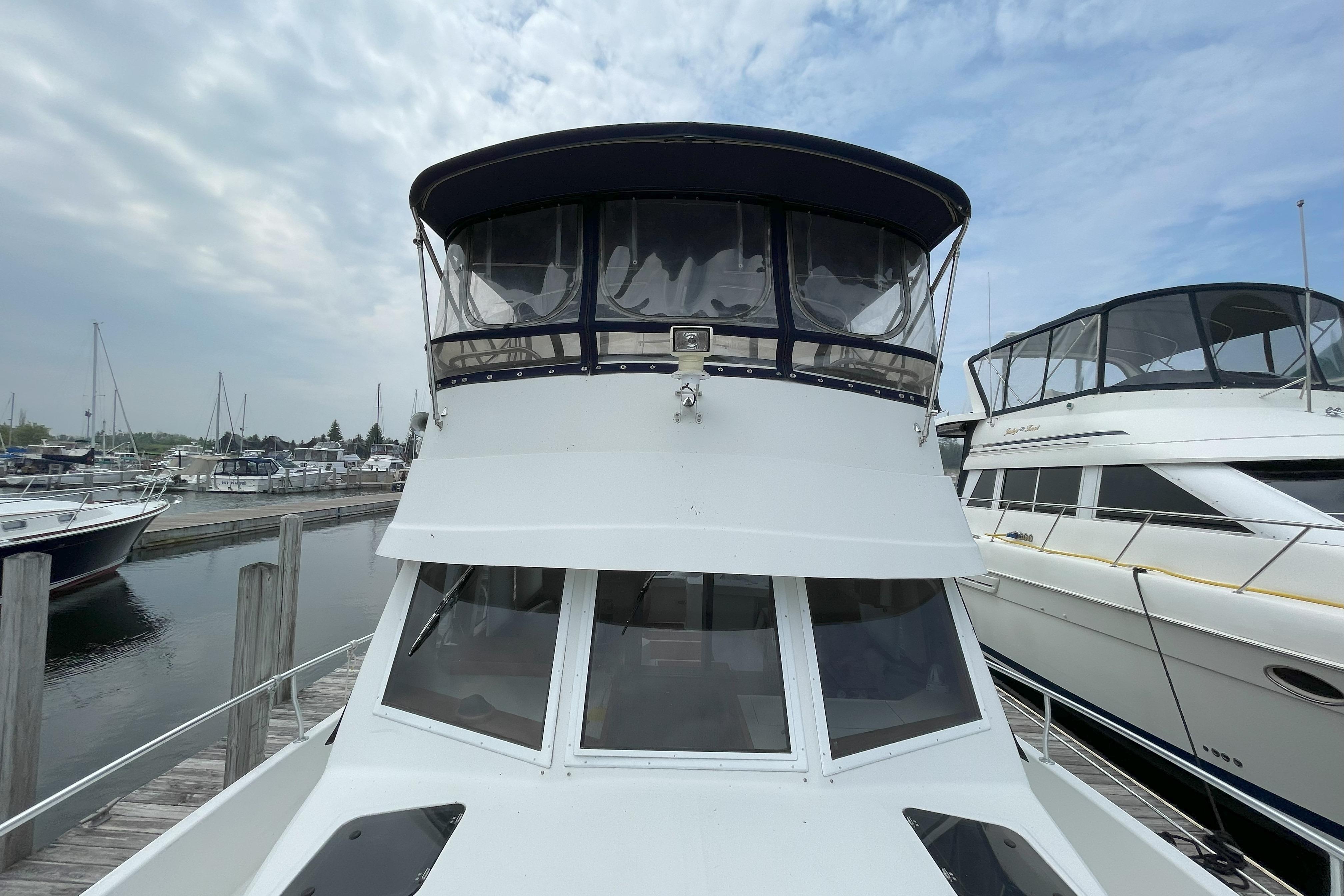 - Flybridge – Full helm station with seating for crew and guests, bimini cover and aluminum rails.