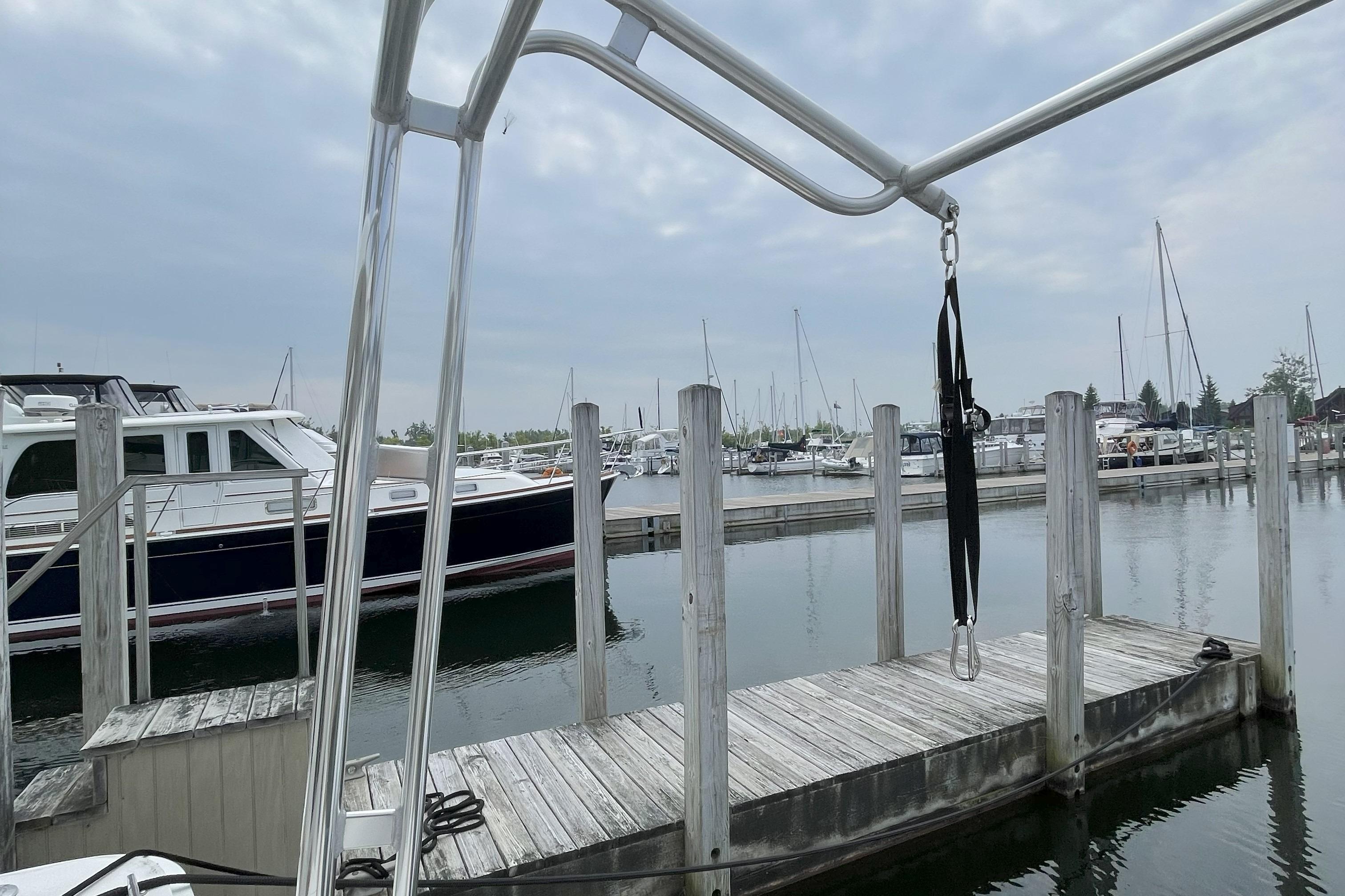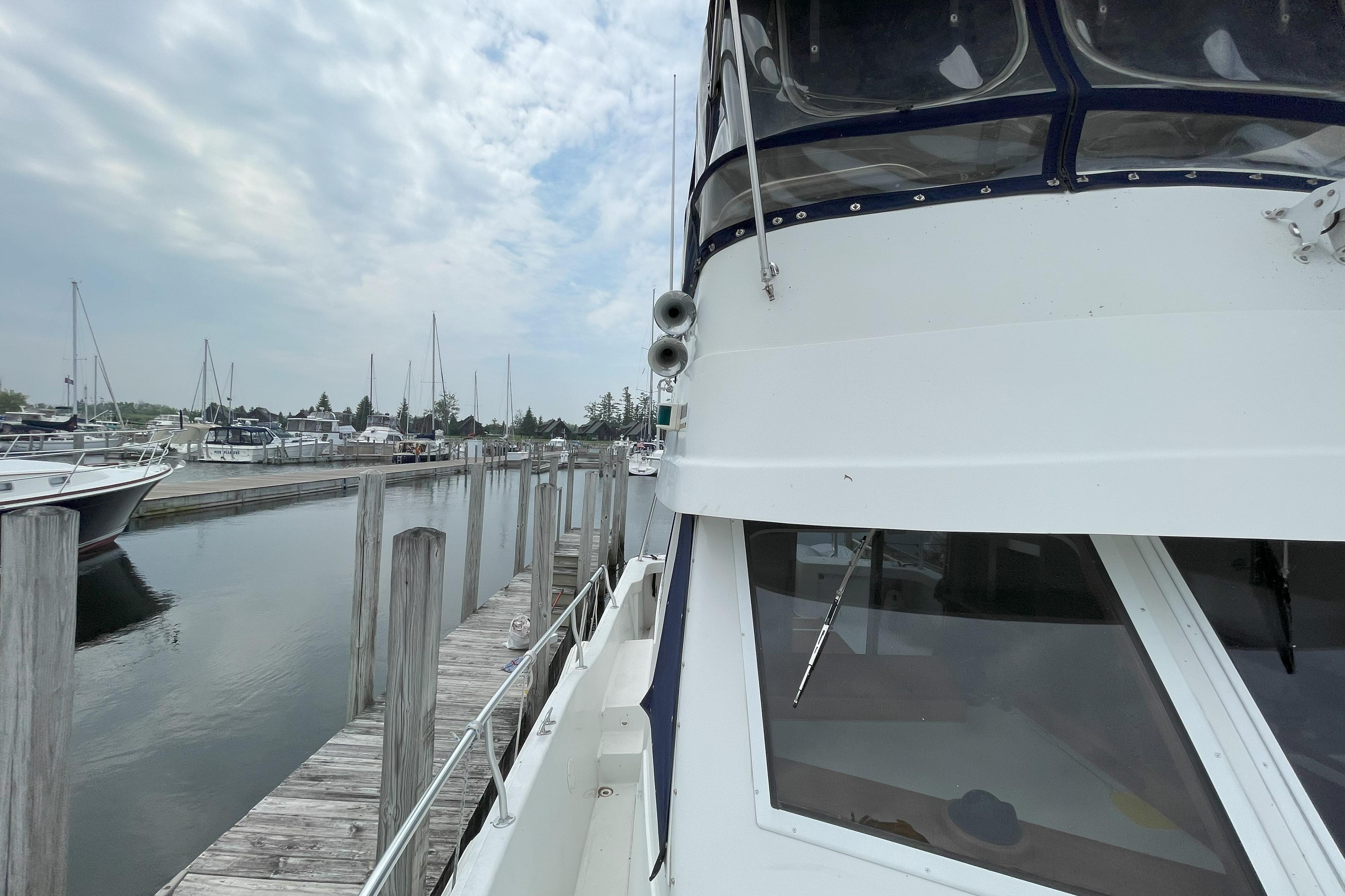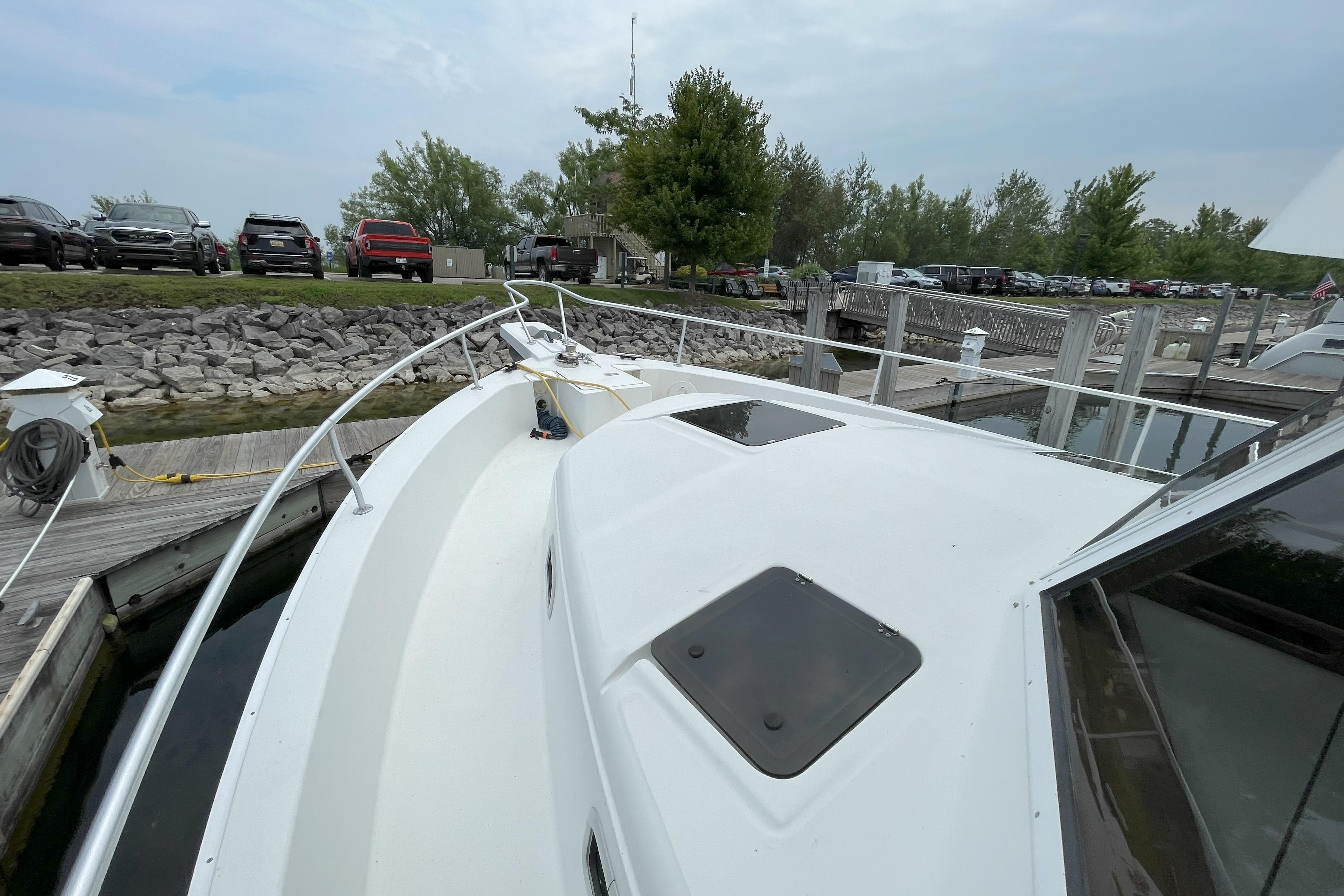 - Flybridge – Full helm station with seating for crew and guests, bimini cover and aluminum rails.