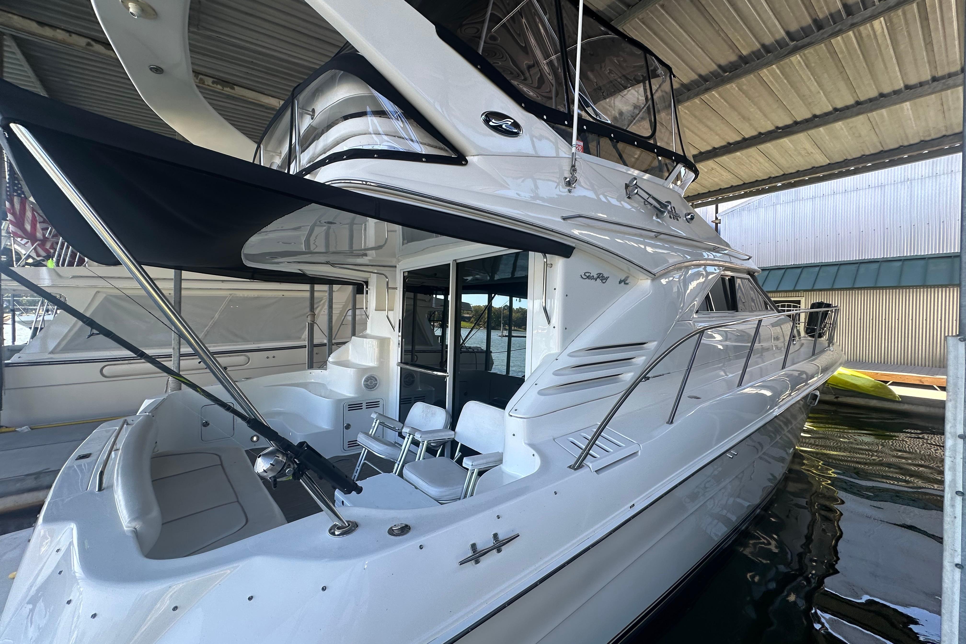 The Sea Ray 400 Sedan Bridge has individual options ranging from engine upgrades to a lower control station, and there’s also a choice between two complete bridge plans and cabin layouts. The gracious standard cabin layout of the 400 Sedan Bridge has two large staterooms, two head areas, and a spacious midlevel galley with a salon-level breakfast bar. The forward stateroom has a full-size bed, cedar-lined hanging locker, floor storage, private head and shower, and a standard entertainment center with a TV – VCR – radio combination. The two twin beds in the port stateroom easily convert to a king-size bed. There’s plenty of room for stowing personal articles in the hanging cedar-lined locker, built-in drawers, and floor storage. The guest head with shower is right next door. The magnificently finished galley has wood cabinetry, a flush-mounted three-burner electric stove, refrigerator with freezer, microwave, and coffee maker. The salon comes complete with an electric sleeper sofa, entertainment center with TV – VCR – radio combination, cocktail table, and a full dinette which can be replaced with an optional lower control station. An optional floor plan allows for a third stateroom to starboard with bunk beds, locker, and built-in storage drawers. Both plans feature deep-pile marine-grade carpet and two choices of granite-colored countertops and tables, with handcrafted wood trim throughout. Molded steps with a security hatch and gas-assisted latch provide safe access to the spectacular bridge, which offers a choice of two seating plans. The first allows for a starboard helm station with added room for electronics and custom slide and swivel helm seats. The second plan provides plenty of room for socializing with a portside helm station with dual companion seat plus spacious U-shaped bridge seating with a sunpad, filler cushions, and cocktail table. For good looks and easy maintenance, both designs include snap-in carpet liner, burl instrument panels, an aluminum framed venturi shield, fiberglass spoiler, Bimini top enclosure, new bridge aft enclosure, and a double sunpad aft of the seating area. The self-bailing fiberglass cockpit is equipped with a gas-assisted bilge service hatch, aft and side panel storage, fender storage tastefully concealed in the transom aft wall, even an ice maker. Here’s another Sea Ray touch – the battery on – off switch is in the cockpit instead of the engine room. Regardless of the layout, the Sea Ray 400 Sedan Bridge boasts a wealth of standard equipment, windlass, interior Sunbrella carpet runners, even a Clarion AM-FM digital cassette stereo with six-disc CD changer, amplifier, subwoofer, eight speakers, and a bridge remote control. A standard accessory package comes complete with ACR remote-controlled spotlight, oil changer system for the diesel options, telephone inlet, and even a dual outlet vacuum system.