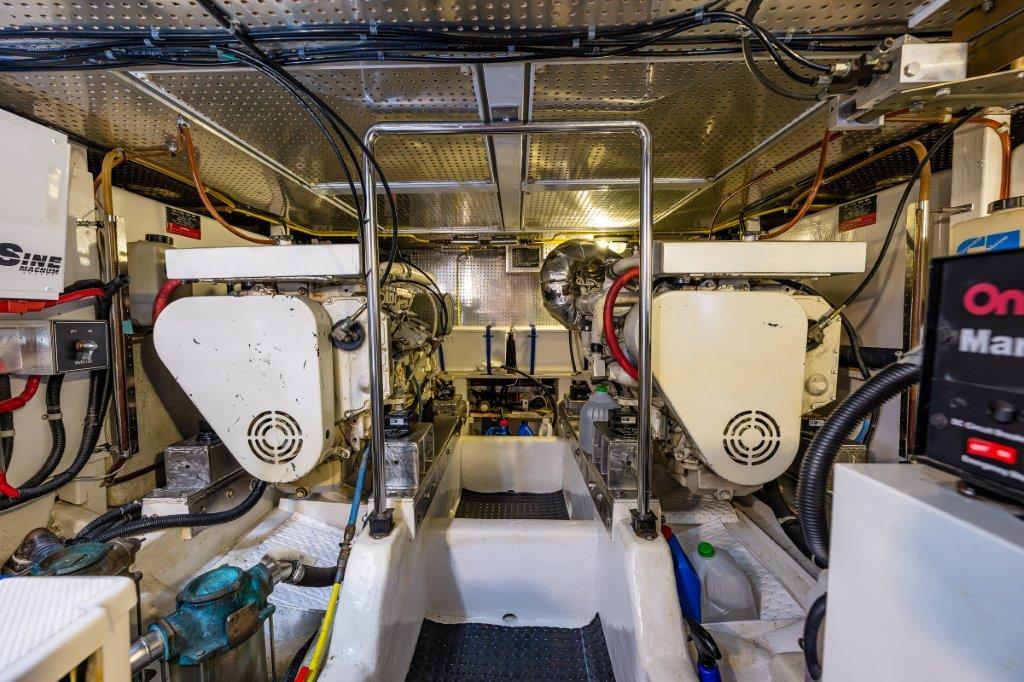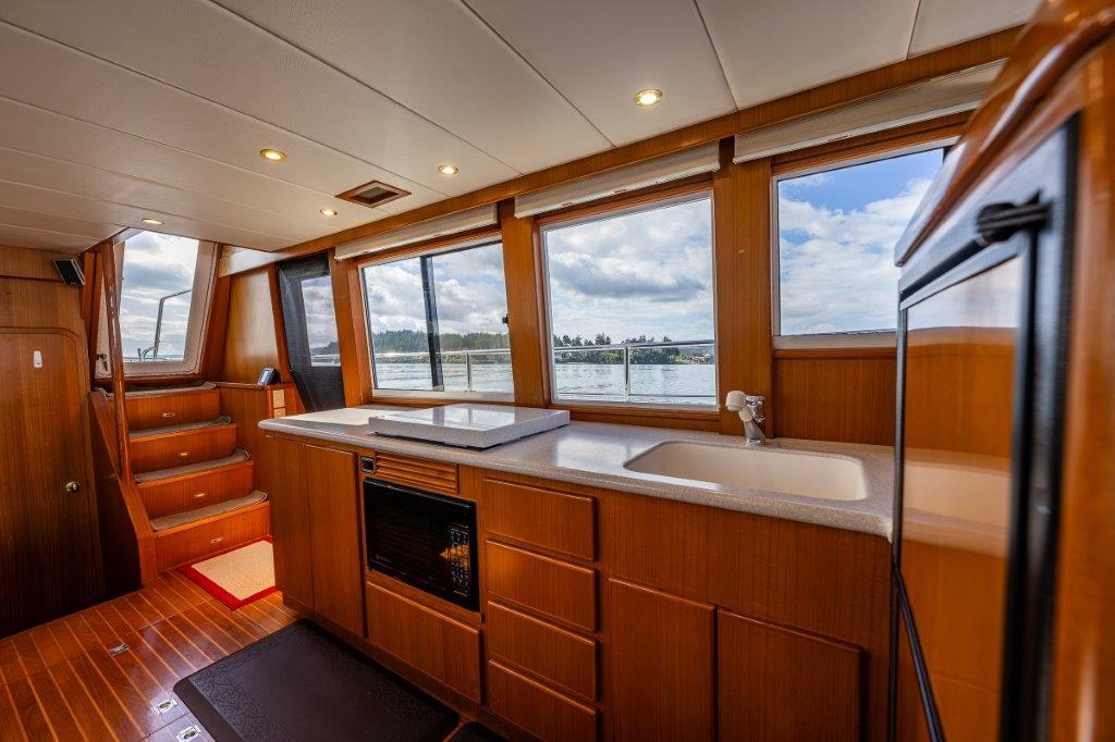 As you walk onto her aft deck from her swim platform you will find wide flush walk-arounds. These easy access walk-arounds seem to allow the vessel to still have a very spacious salon and interior room. Her very desirable up galley to the port side is spacious with lots of storage and fantastic amenities.