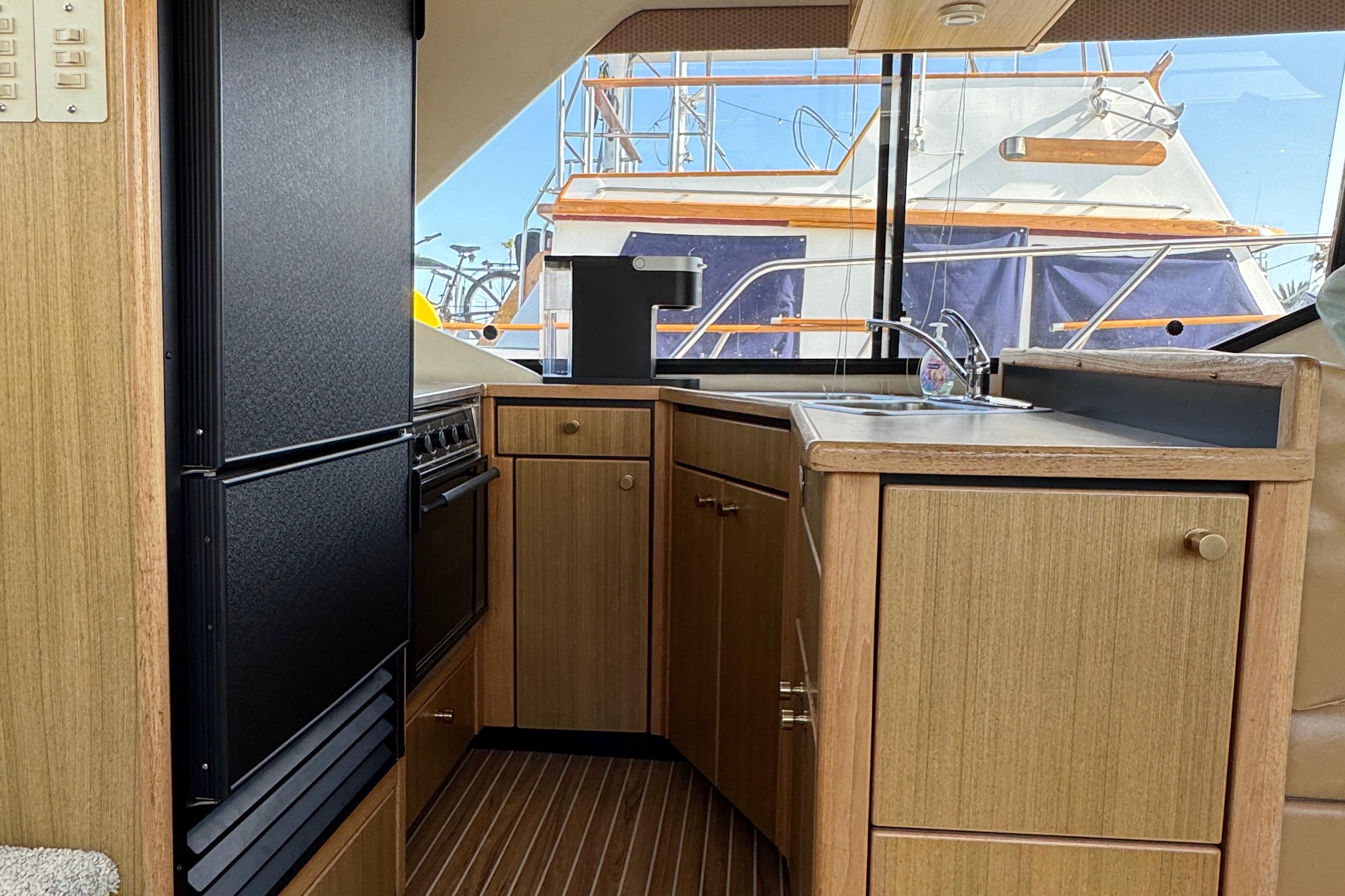 Galley: Level no step down design with 3-burner range and oven, full-size Norcold refrigerator/freezer, double sink, and ample storage for provisioning.