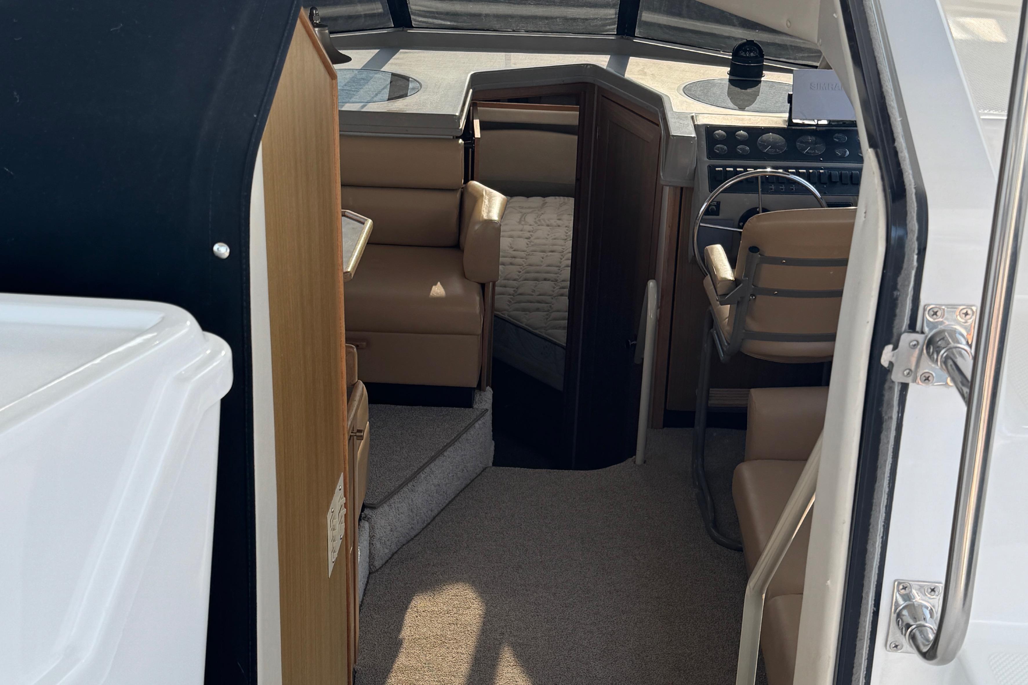 Salon: Bright and open with large windows, an L-shaped settee, barrel chair, and a lower helm station with excellent sightlines.
