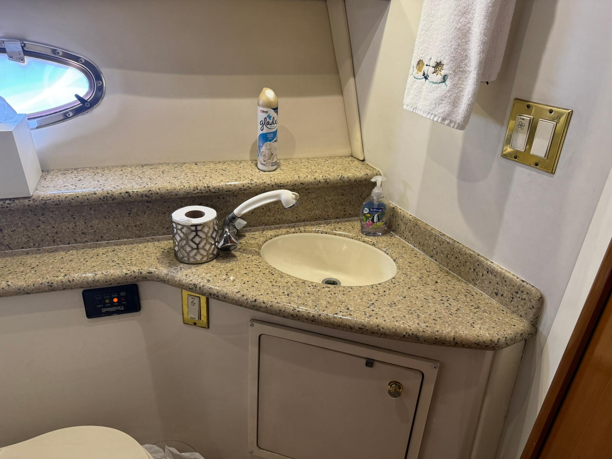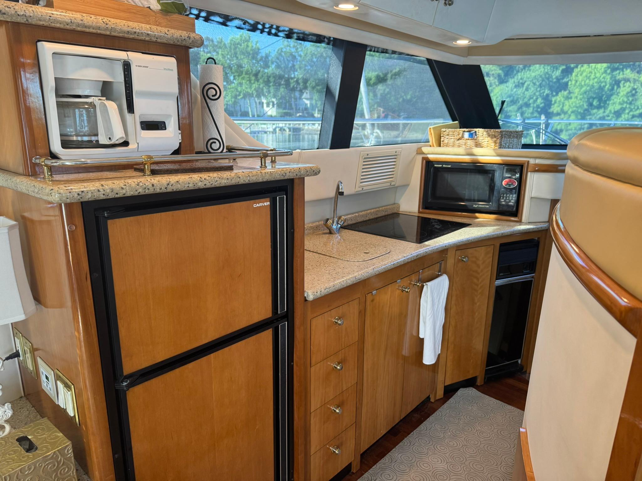With a 14′ 10″ beam the Carver 450 has the feeling of a much larger vessel, Entering the salon from the cockpit the size of the salon is immediiately noticed. The salon features a curved wet bar with plenty of storage. There are 2 staterooms both with queen beds and direct access to their own heads. The master’s has a vacuflush head and an enclosed shower. A settee in the salon has a fold out sleeper.