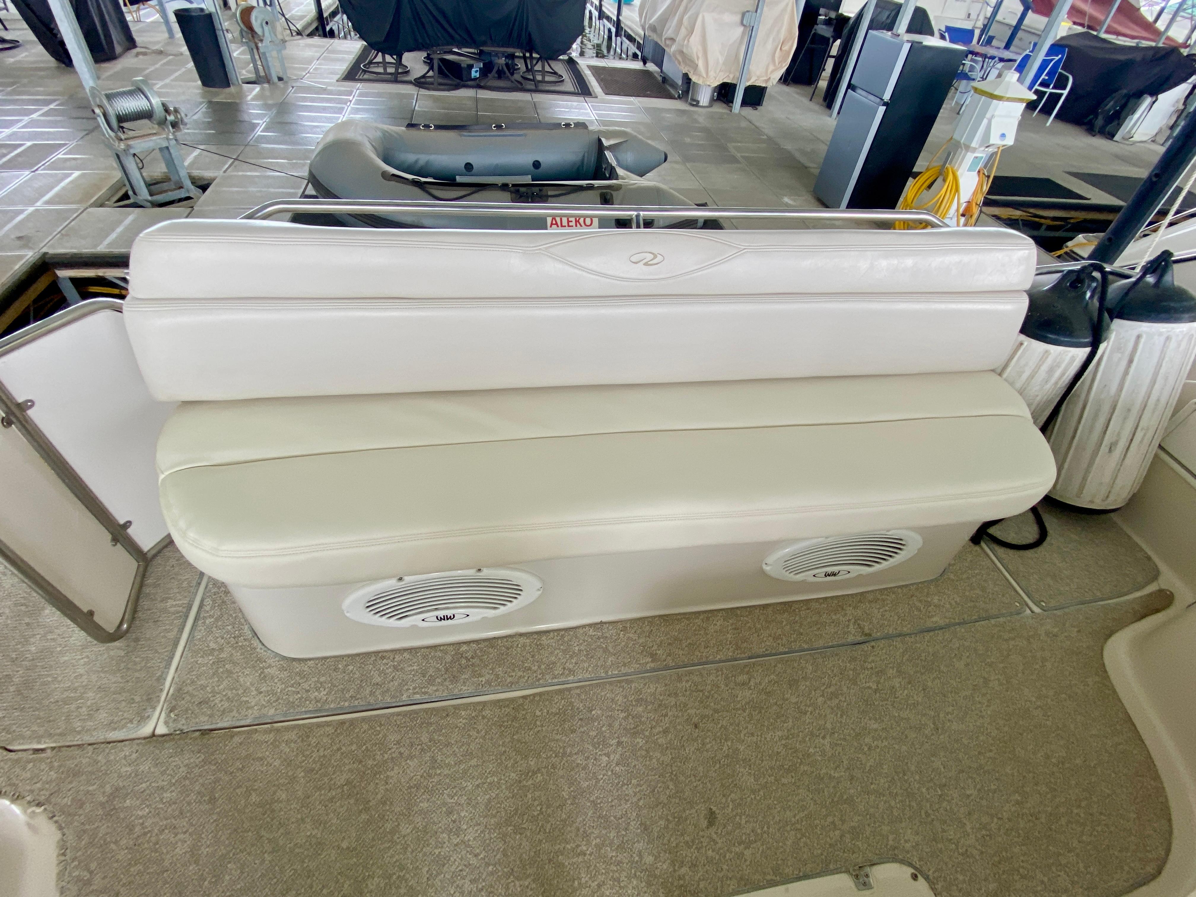 Deck/Hull: Anchor, pulpit, dock power, compass, spotlight, windshield wipers, shore water, wet bar with refrigerator & sink, sunpad, extended swim platform, transom storage locker, arch, and bimini top.