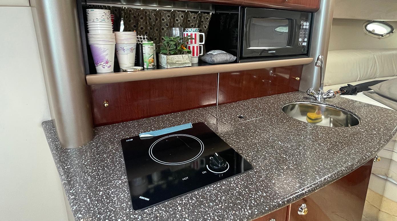 Belowdeck, which featured an aft cabin with a small porthole to provide ambient light, all of the cabinets were done in cherry wood. The galley to port had a Corian countertop with a sink and single-burner stove built into the top. Just above was a microwave.