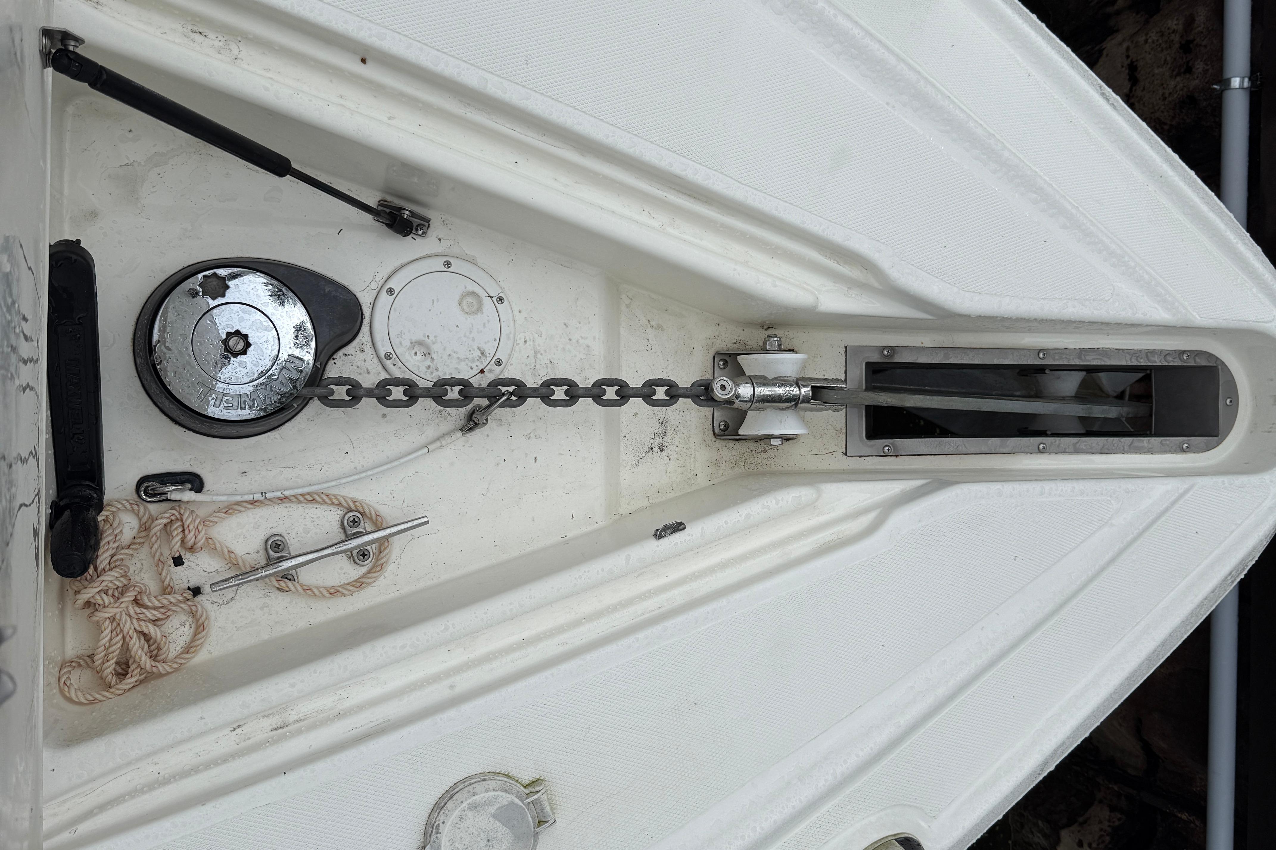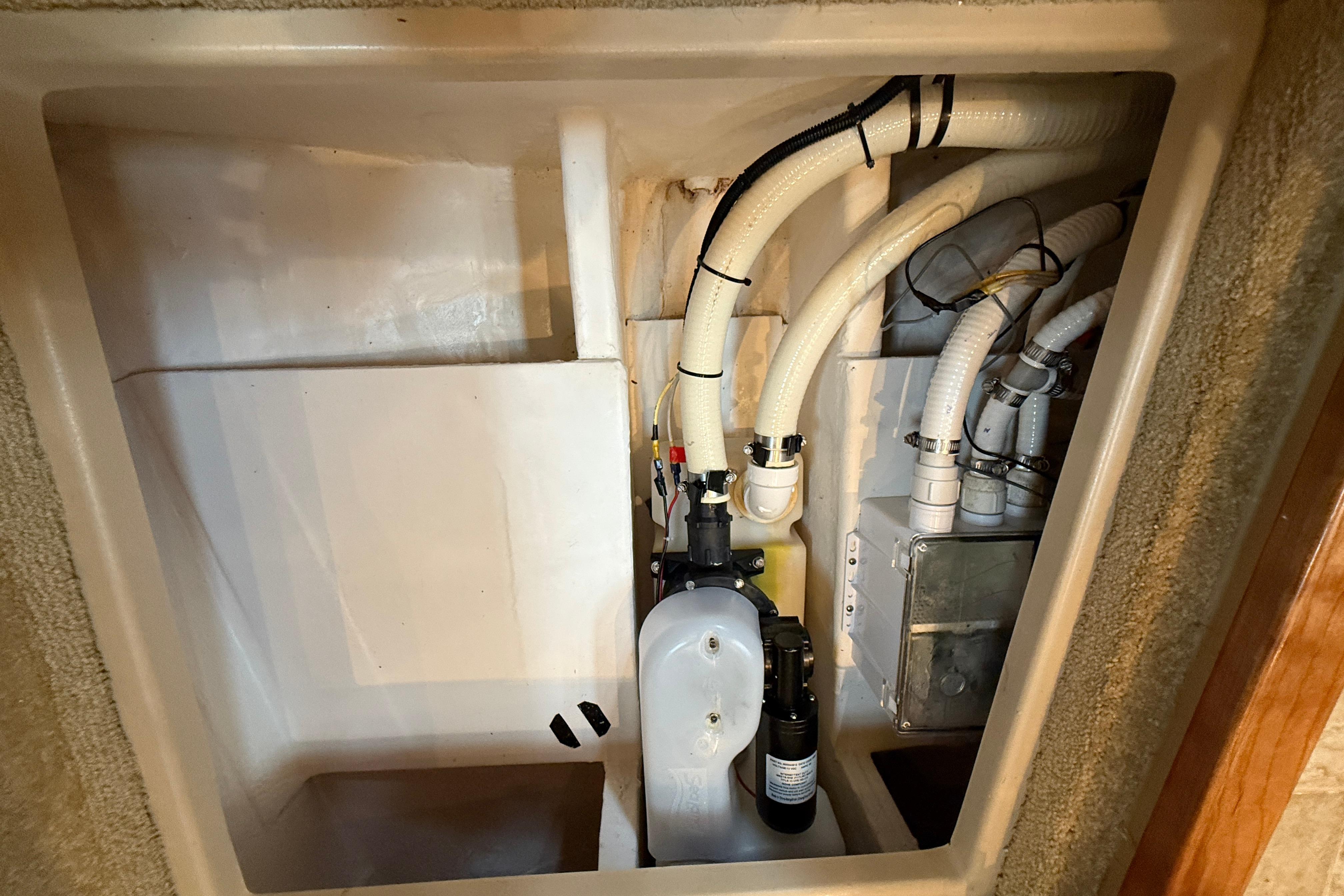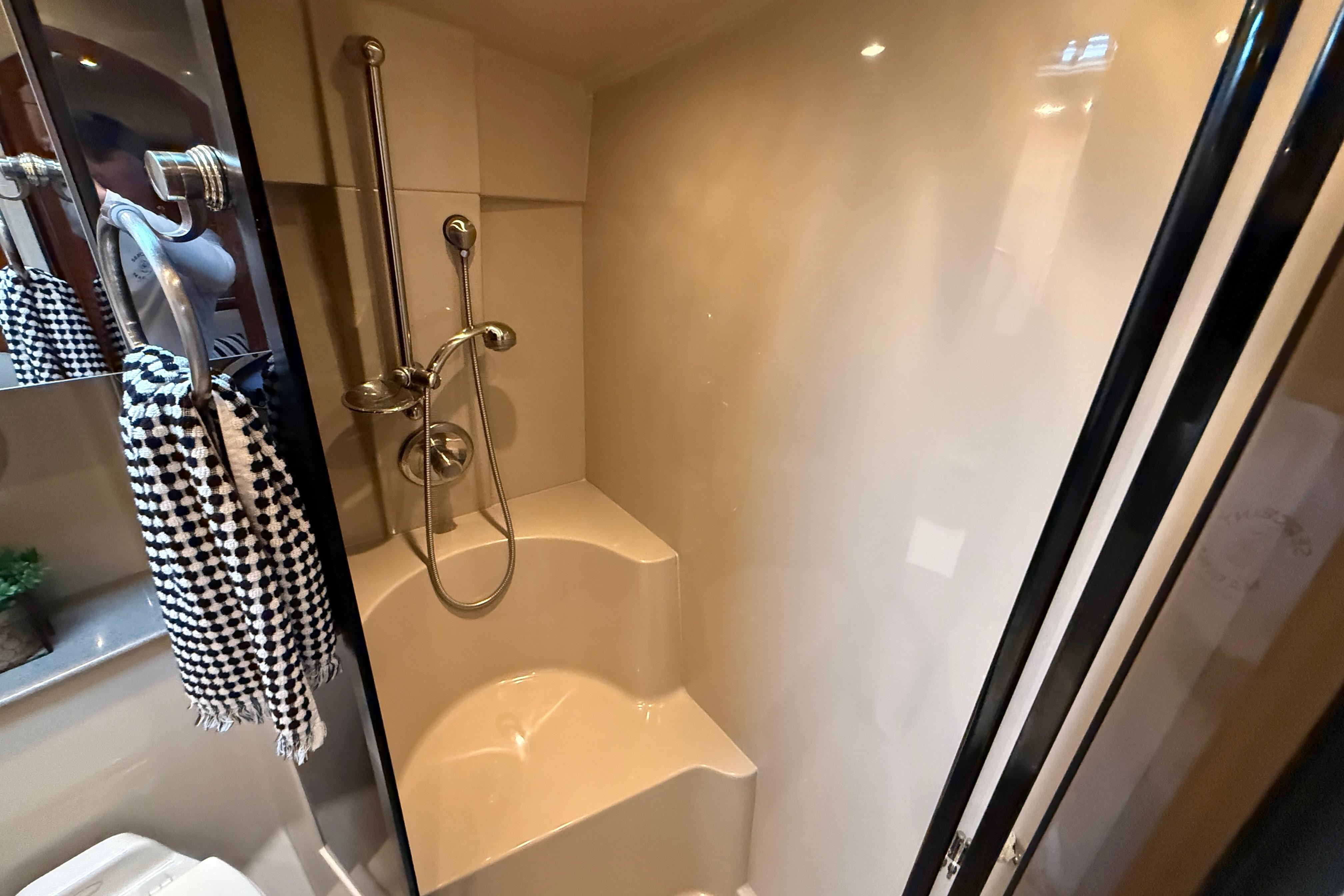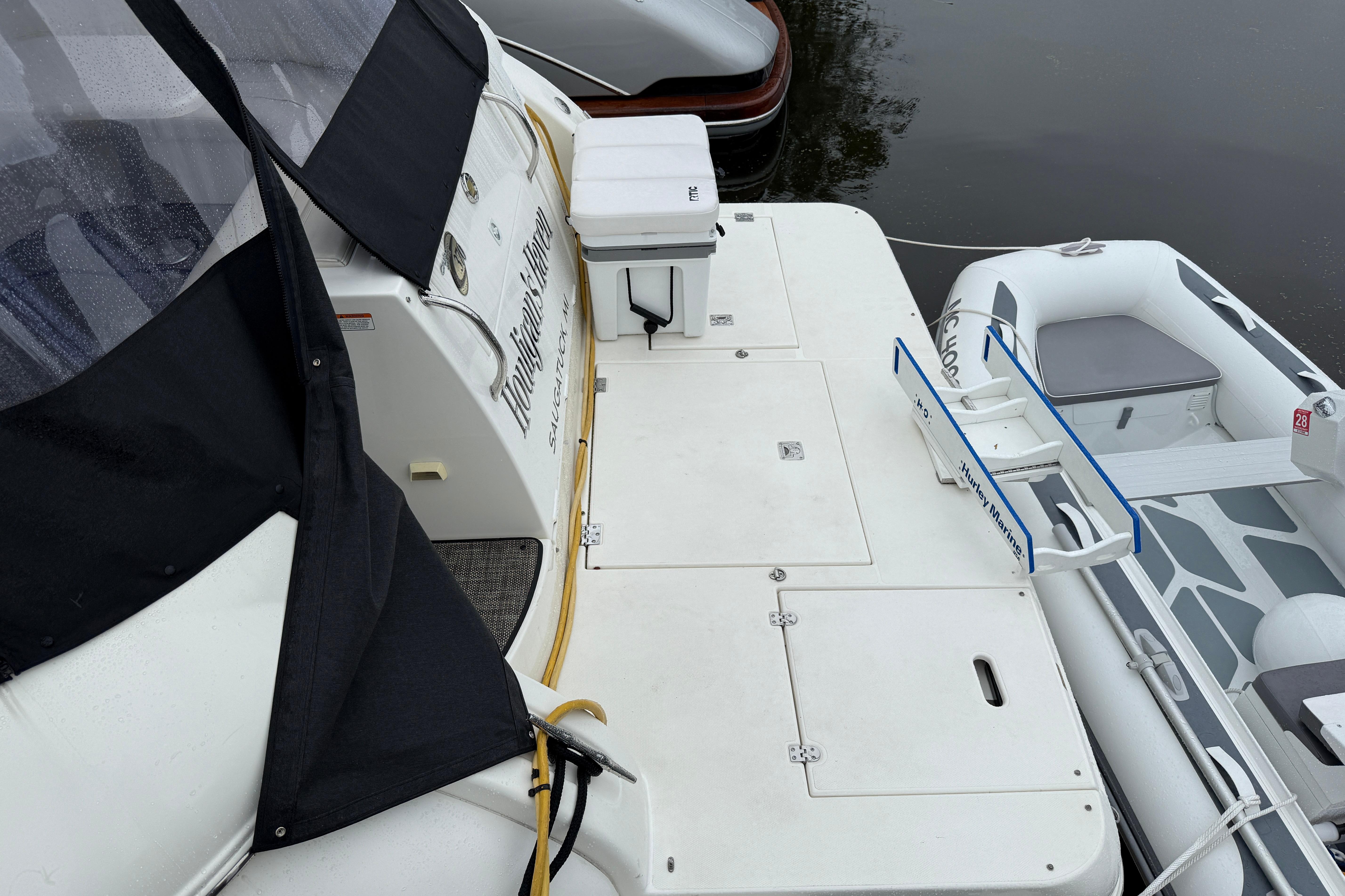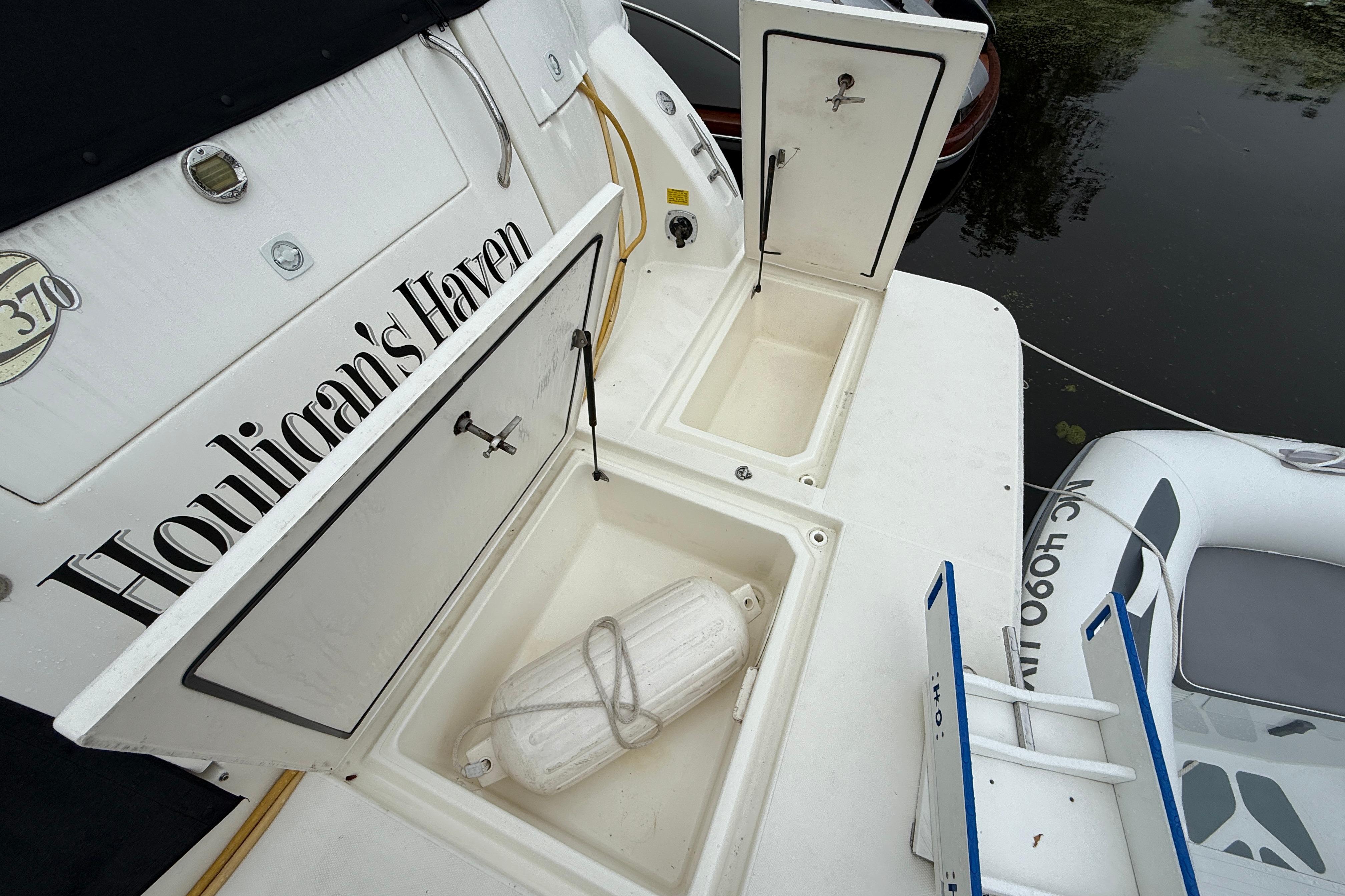 With Tall Freeboard and a Wide Beam, the 370 Express provides a very comfortable and spacious cabin. The single-level salon sole makes moving around the cabin a breeze. The salon has a sleeper sofa that easily folds down for guests, and a divider curtain to provide privacy. Plenty of cabinet storage throughout. Two cedar lined hanging lockers in the forward cabin will keep your clothing smelling fresh. The interior is finished with beautiful cherry woodwork and joinery. The head is spacious for a boat this size and includes a walk-in shower. The cockpit layout allows for plenty of room for guests to sit together. It has a small fridge on the port side with a sink. A very easy to navigate walk-through windshield provides quick access to the bow. This boat has had numerous upgrades and updates over the last few years, notably the new canvas and isenglass, a Hurley davit system, new cockpit floor covering (easily removable for cleaning), and 150′ of anchor chain. The large integrated swim platform has two good-sized below deck storage lockers, that can also be used as coolers to keep your favorite beverages nice and cold.