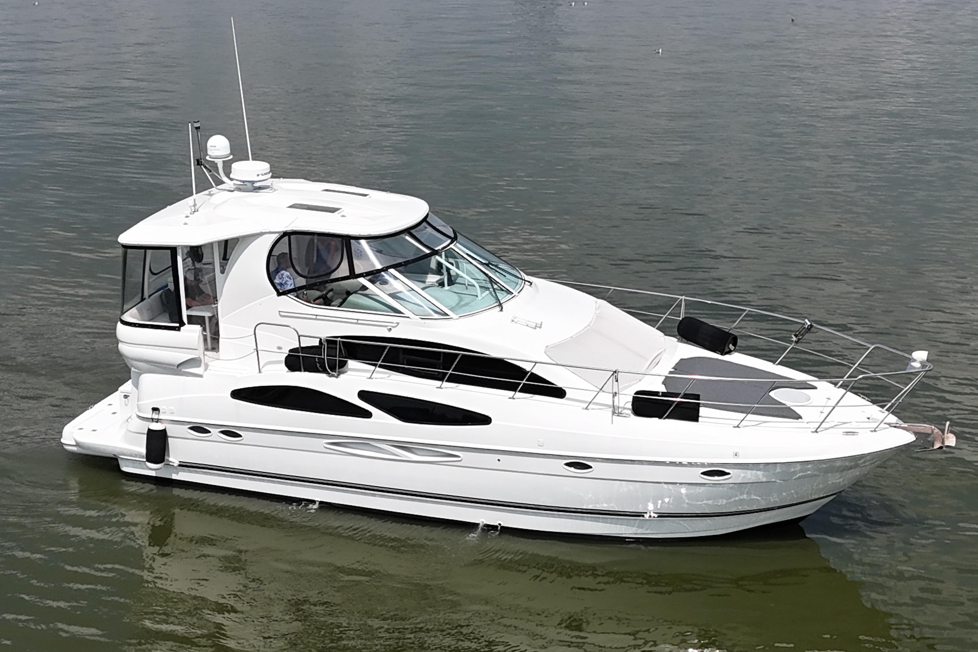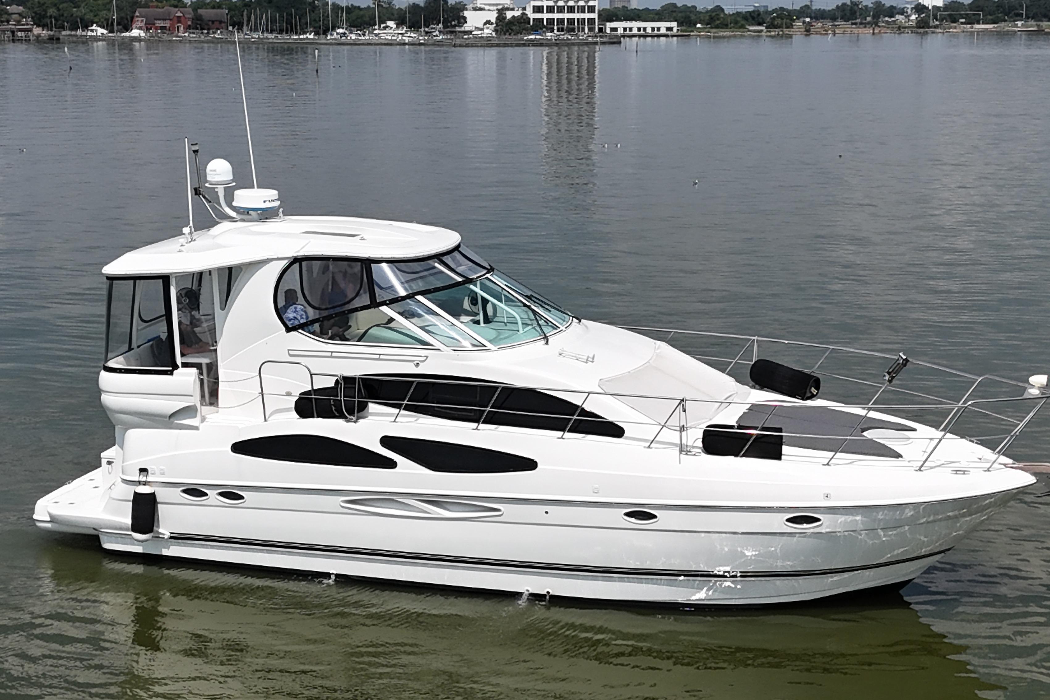 The Cruisers 405 Express Motoryacht offers boating enthusiasts a virtual express layout on the upper deck while providing full aft cabin comfort below. The 405’s cockpit features the kind of comfortable seating associated with traditional express boats with virtually no separation between bridge and cockpit. A full express-style windshield provides exceptional weather and wind protection. An aft-deck hardtop with wing doors and full weather enclosure is aboard the 405. “Knot Available” also has the highly sought after optional hardtop that covers the bridge deck. Below, the 405 Express Motoryacht will delight owners and guests alike with its warm cherry interior and natural light. The bright, airy salon features a large settee/dinette and a large Flexsteel L-shaped convertible settee/sofa that converts to a double berth to sleep (2); and wonderful views all around due to the imaginative window treatments on each side. There’s also a fully appointed galley with large, upright refrigerator/ freezer. A luxurious master stateroom is located aft and features a full walk-around queen-size bed, generous master head with separate shower and lots of seating and storage. A second stateroom is located forward with private head access and separate shower; it also boasts a centrally located queen-size bed.