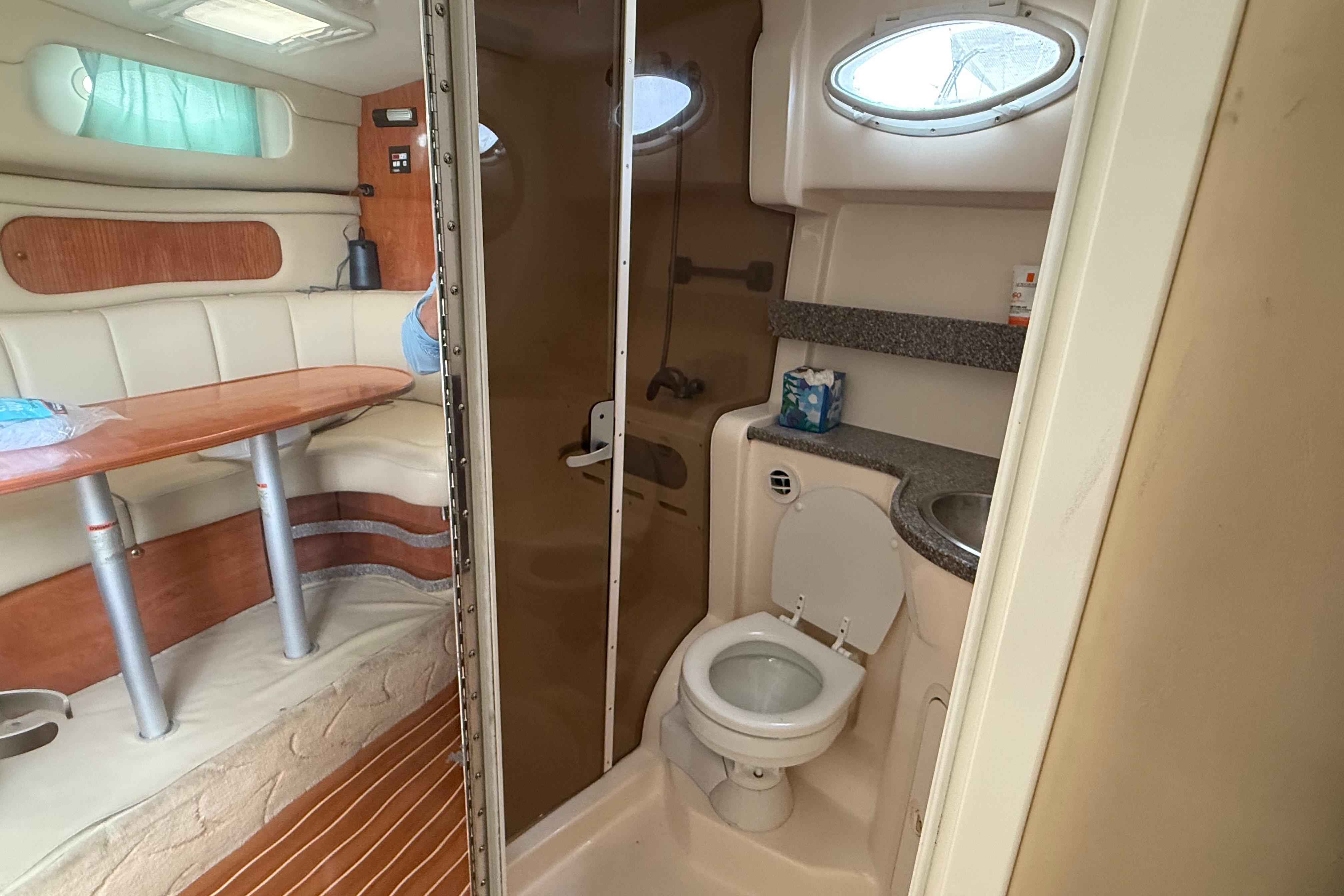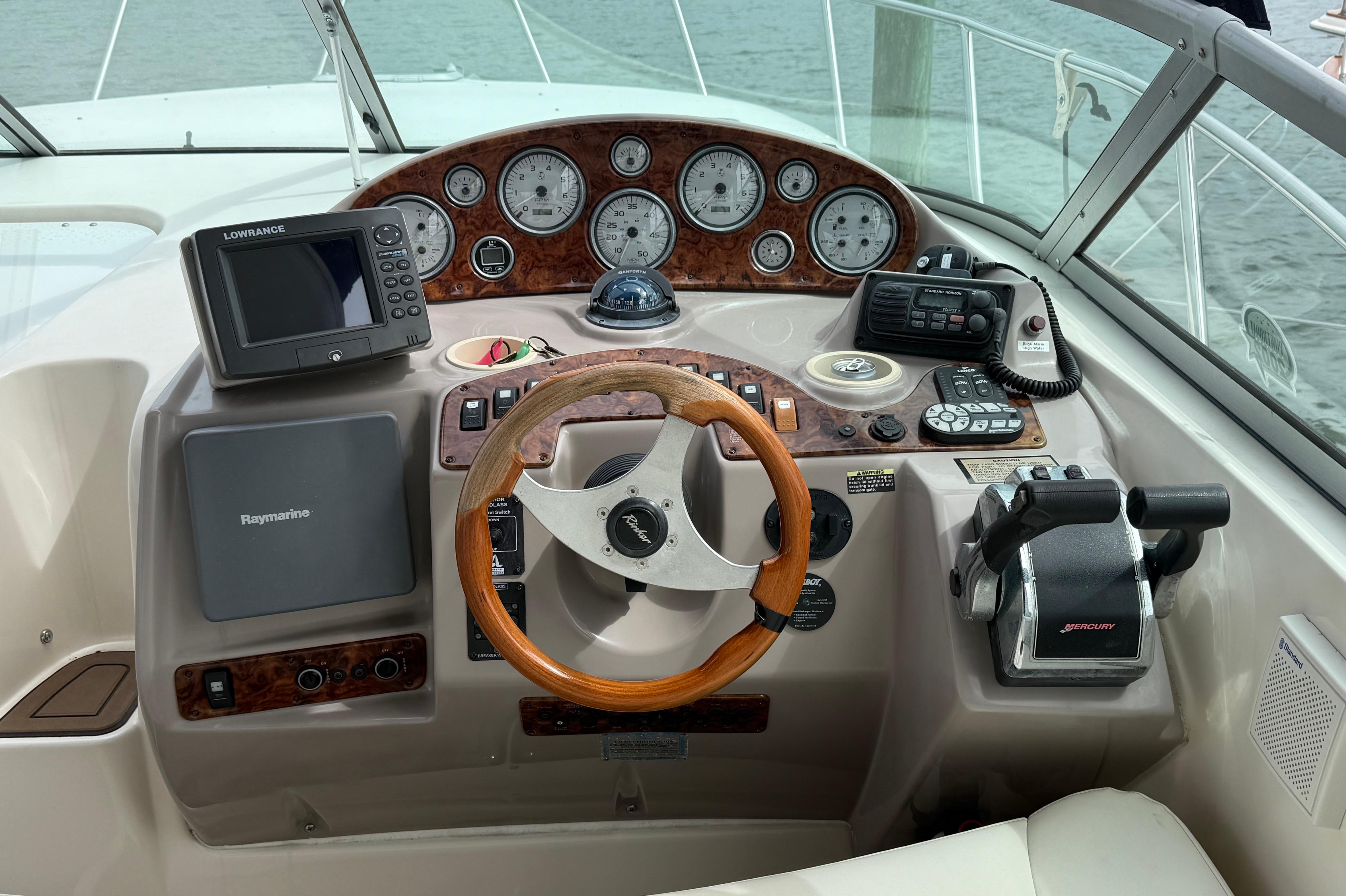Introducing the 2004 Rinker 342, a stunning cruiser that combines elegance and performance. With an overall length of 37 feet, this vessel features a robust fiberglass hull with a Deep Vee shape, ensuring a smooth ride even in choppy waters. Powered by a 300 hp Mercury 350 Magnum engine, it boasts an impressive cruising speed of 24 knots and a maximum hull speed of 38 knots, making it perfect for exhilarating adventures. The interior offers two comfortable cabins and a well-appointed head, providing ample space for relaxation. The electric windlass enhances convenience, making anchoring a breeze. With a seating capacity for six, this boat is ideal for entertaining friends and family on the water. Additionally, it has a cruising range of 200 miles, allowing for extended voyages. Experience the perfect blend of comfort and performance with the Rinker 342, a true gem for any boating enthusiast.