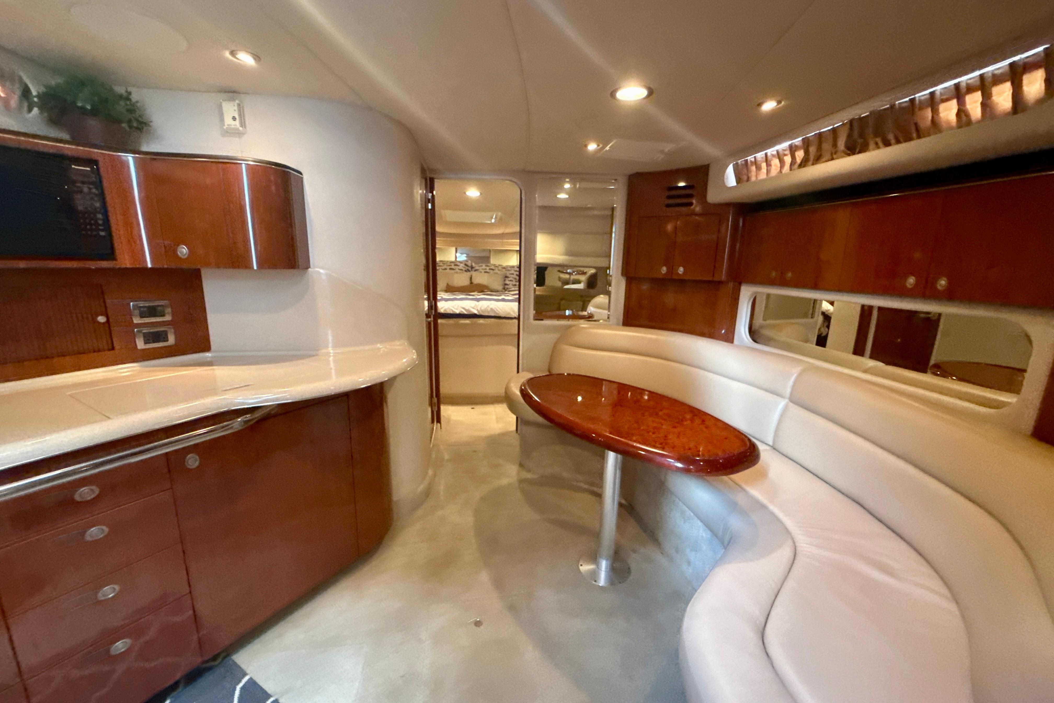 Entering from the aft, you’ll notice the massive wraparound cockpit seating and cocktail table. To the port, a wet bar area with sink and refrigerator.