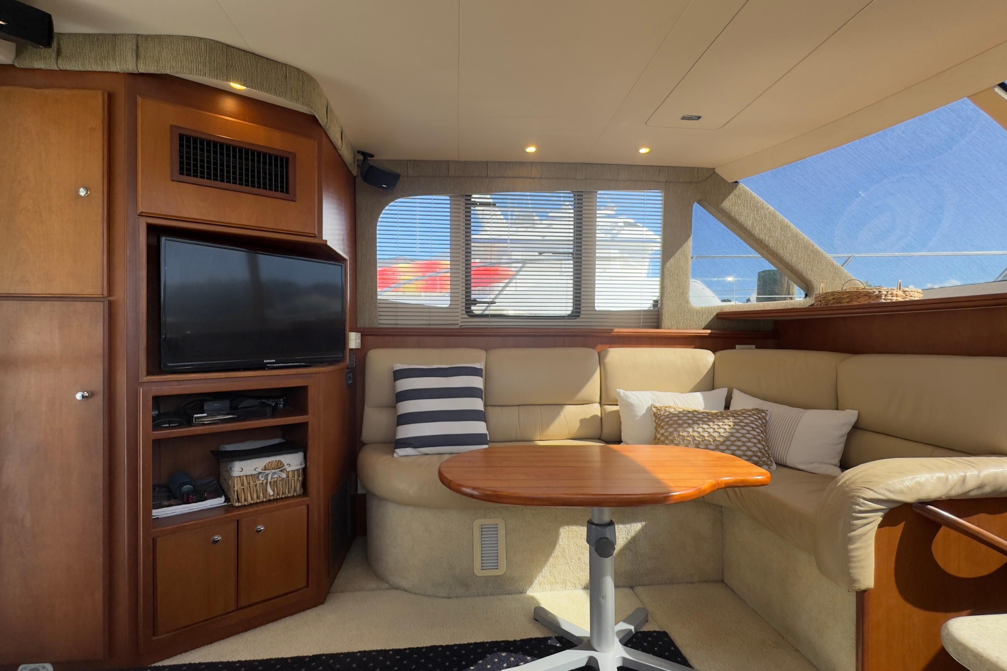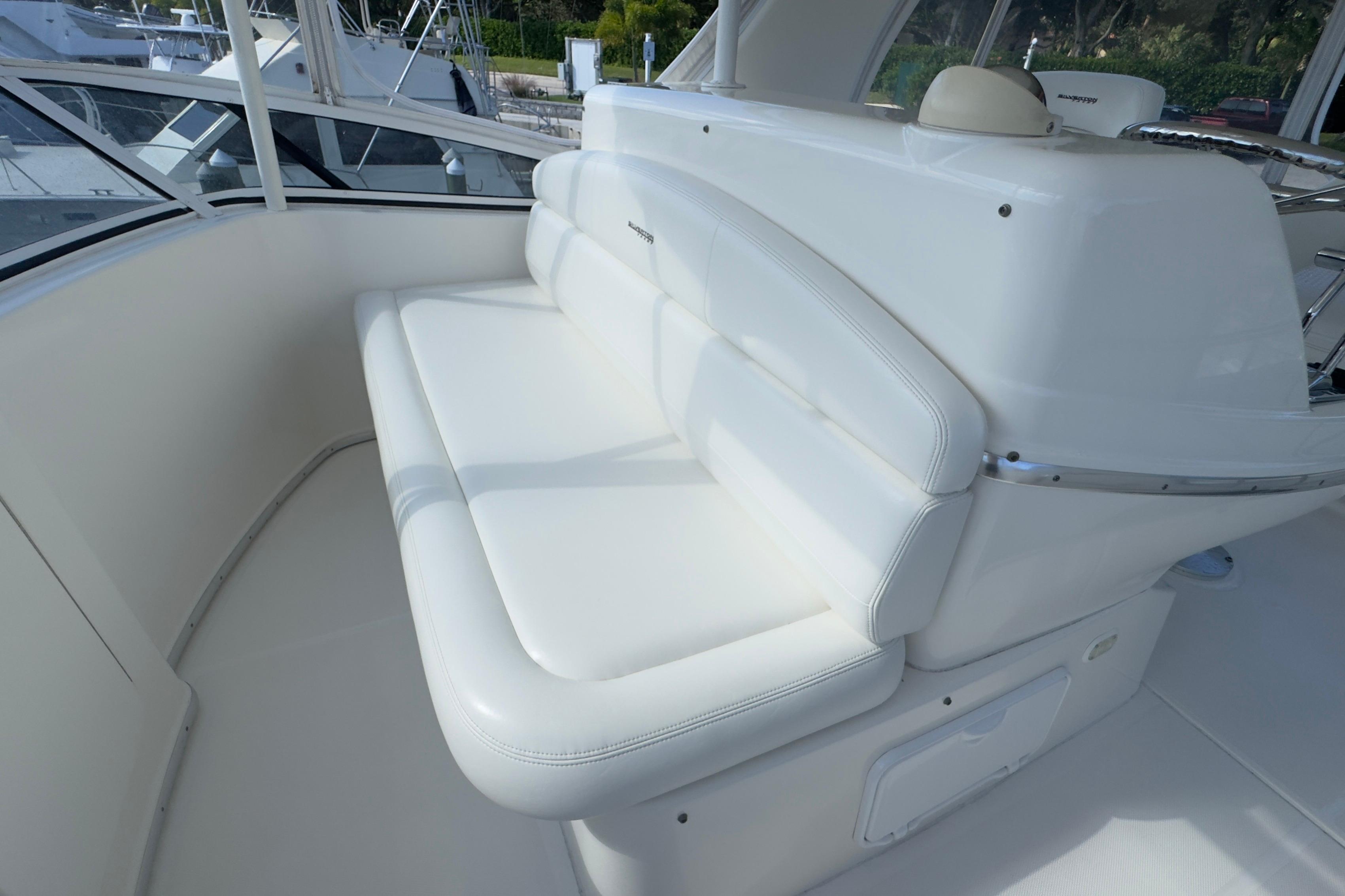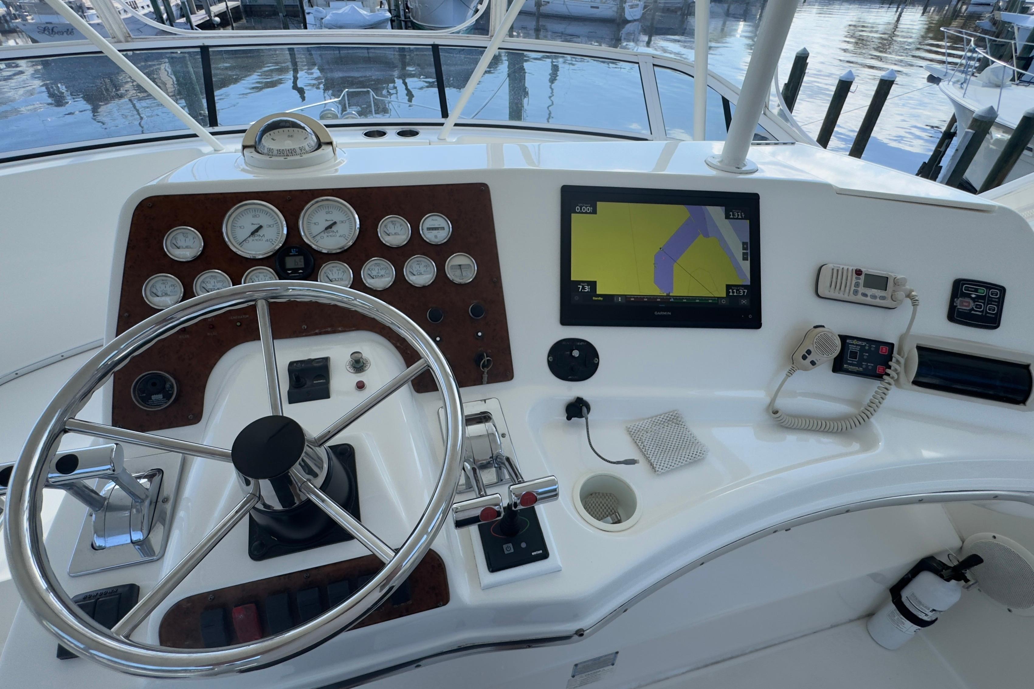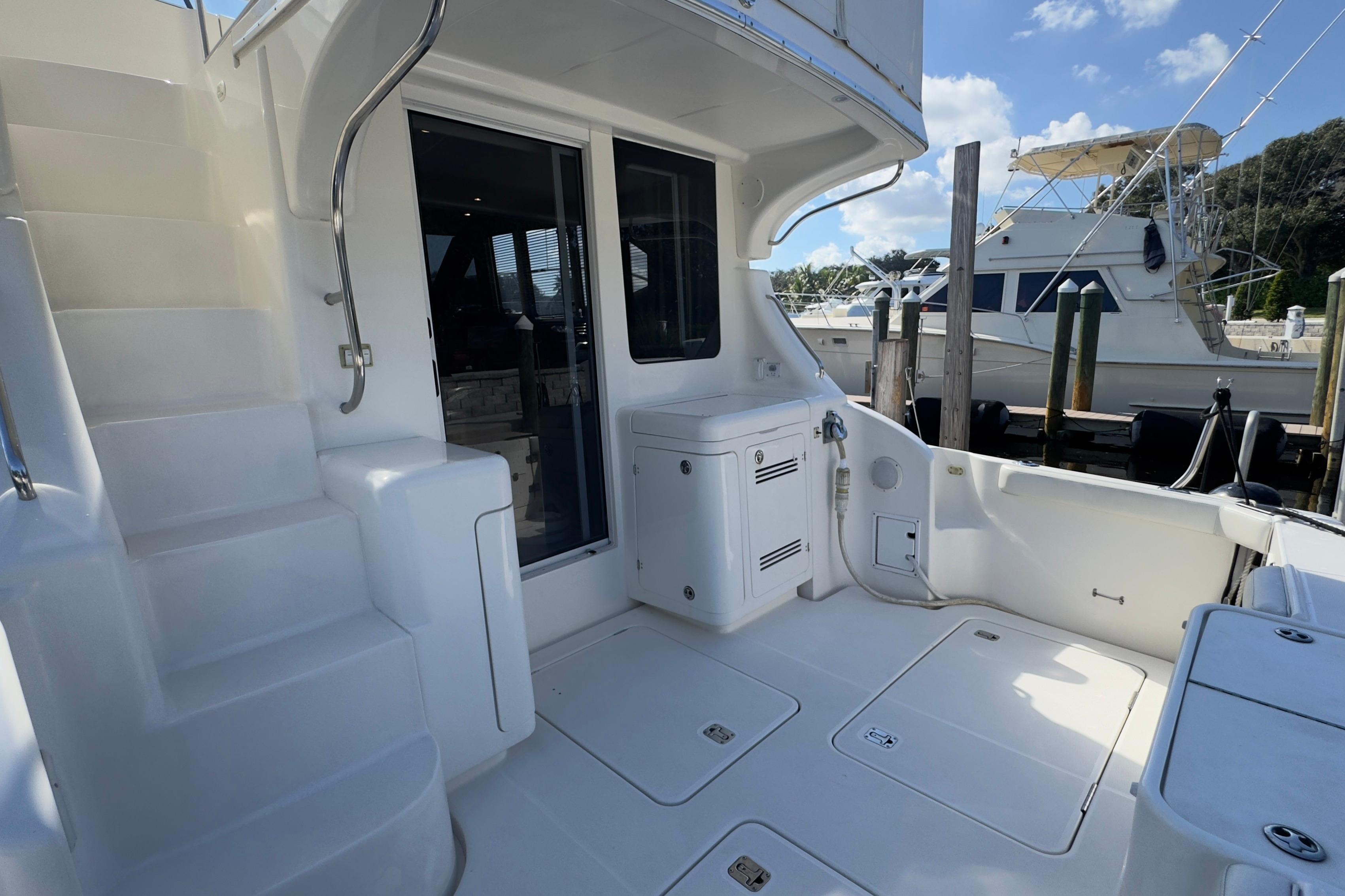 Interior Excellence Two private staterooms with innerspring berths offer comfort and generous storage. The Corian-surfaced galley is designed to meet all culinary needs, featuring premium appliances and a genuine hardwood floor for easy maintenance. The salon, featuring an electrically actuated sofa and an opposing dinette, is ideal for entertaining or relaxing in style. Outdoor Versatility The cockpit is designed for both leisure and sport—perfect for fishing or lounging with a couple of chairs. A standard wet bar can be customized with an icemaker or refrigerator, and the optional Fish Pak adds a rocket launcher, rod holders, washdowns, and a tackle center for serious anglers. Flybridge & Helm The spacious flybridge offers ample seating and storage. The helm console is ready for a full suite of electronics.