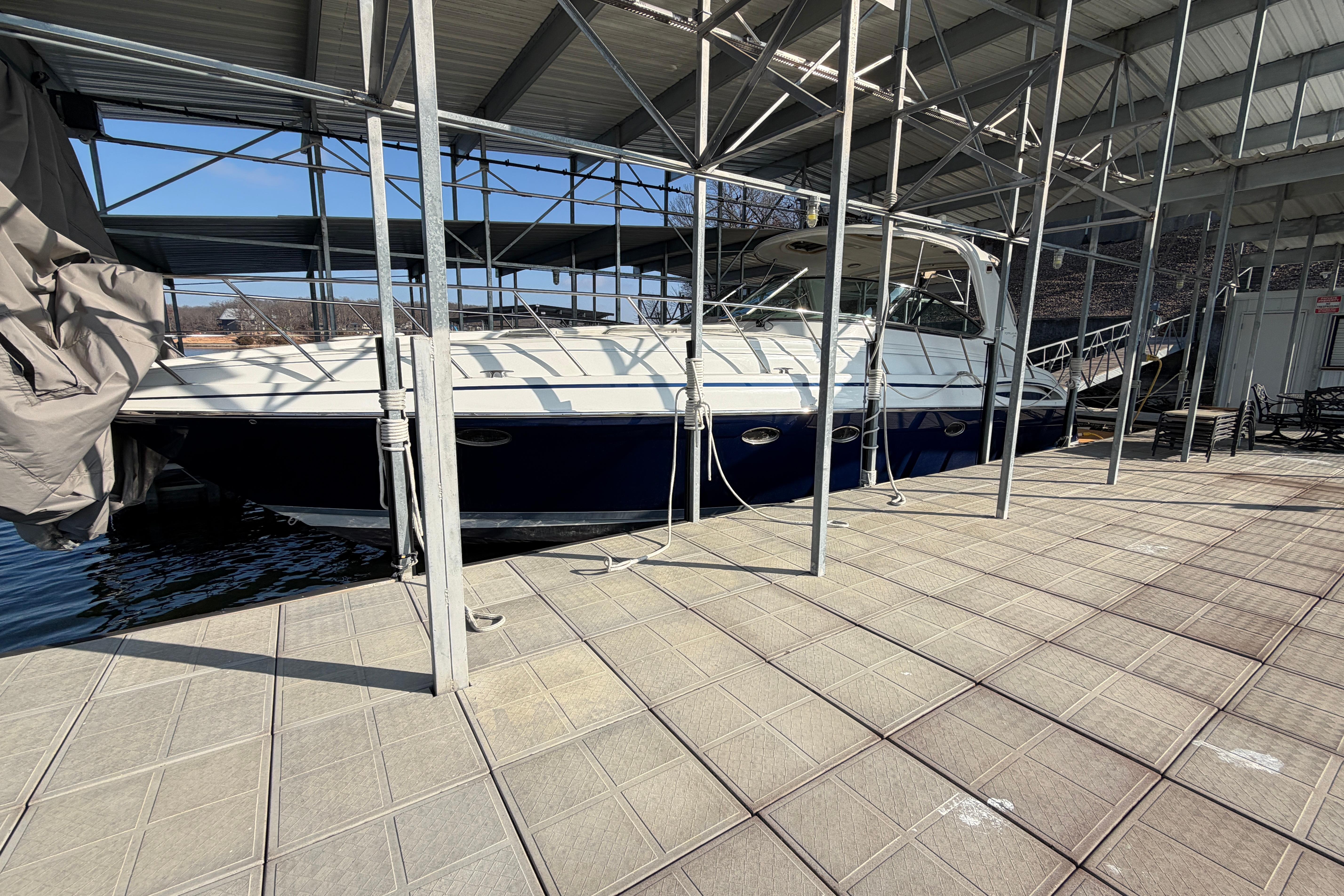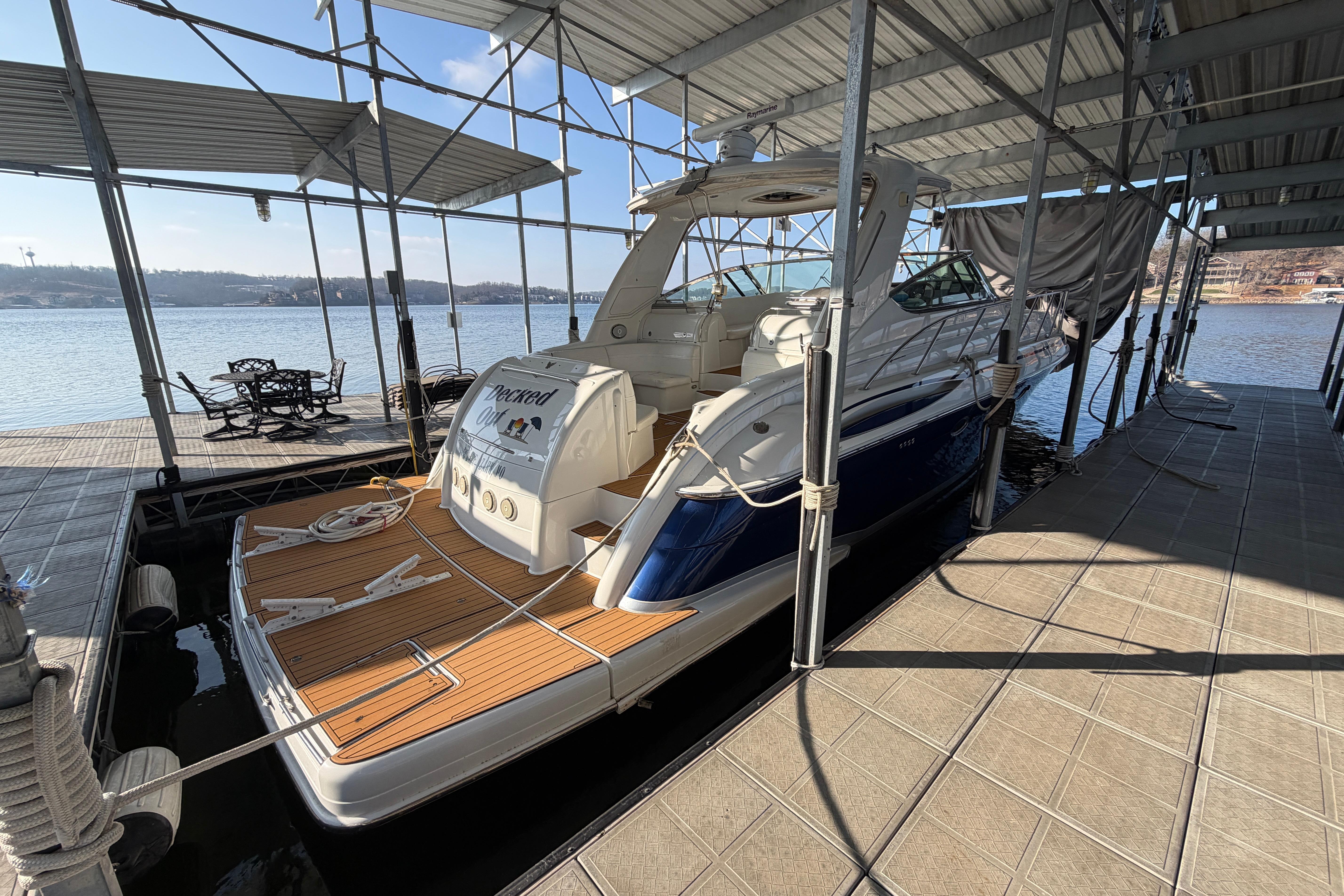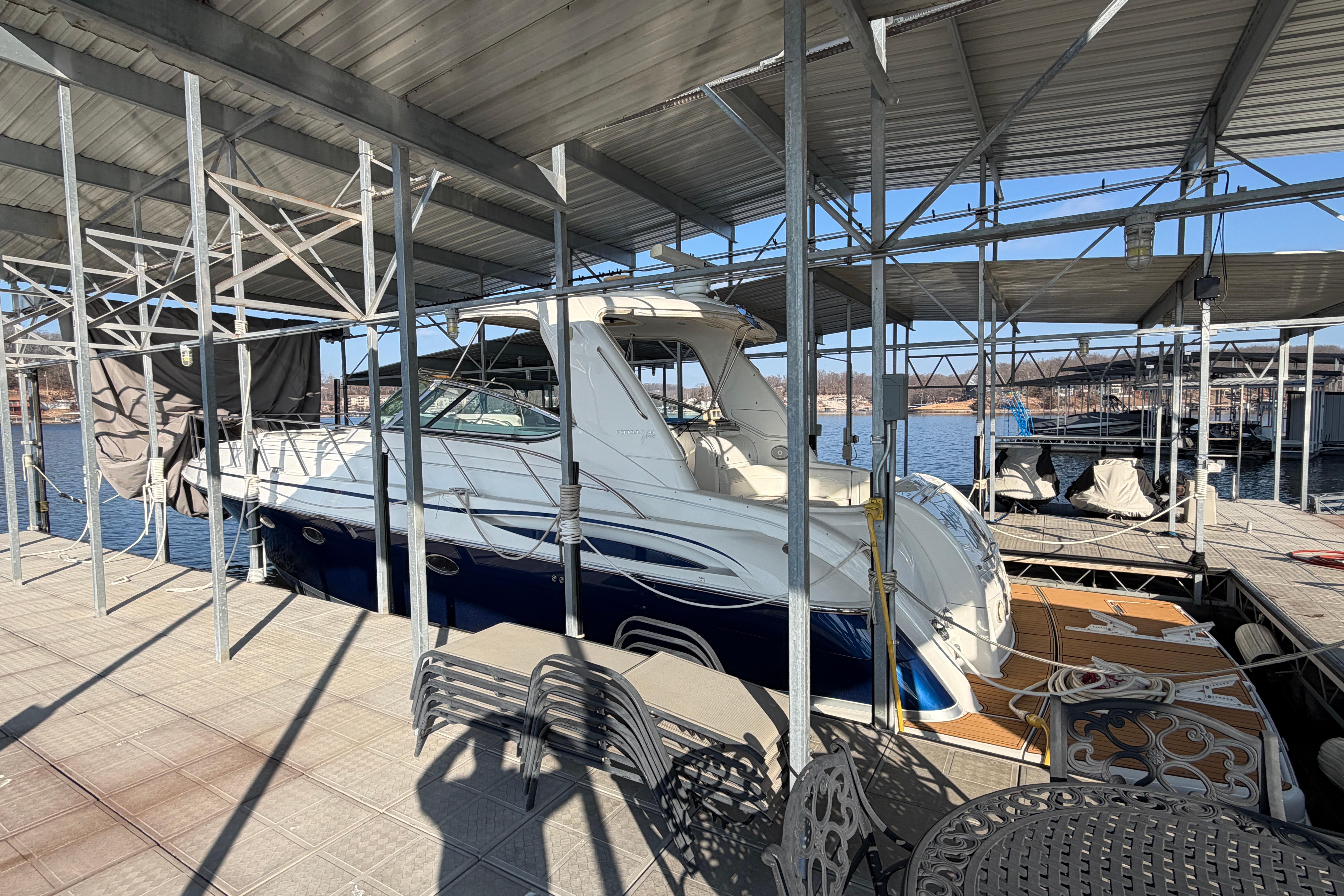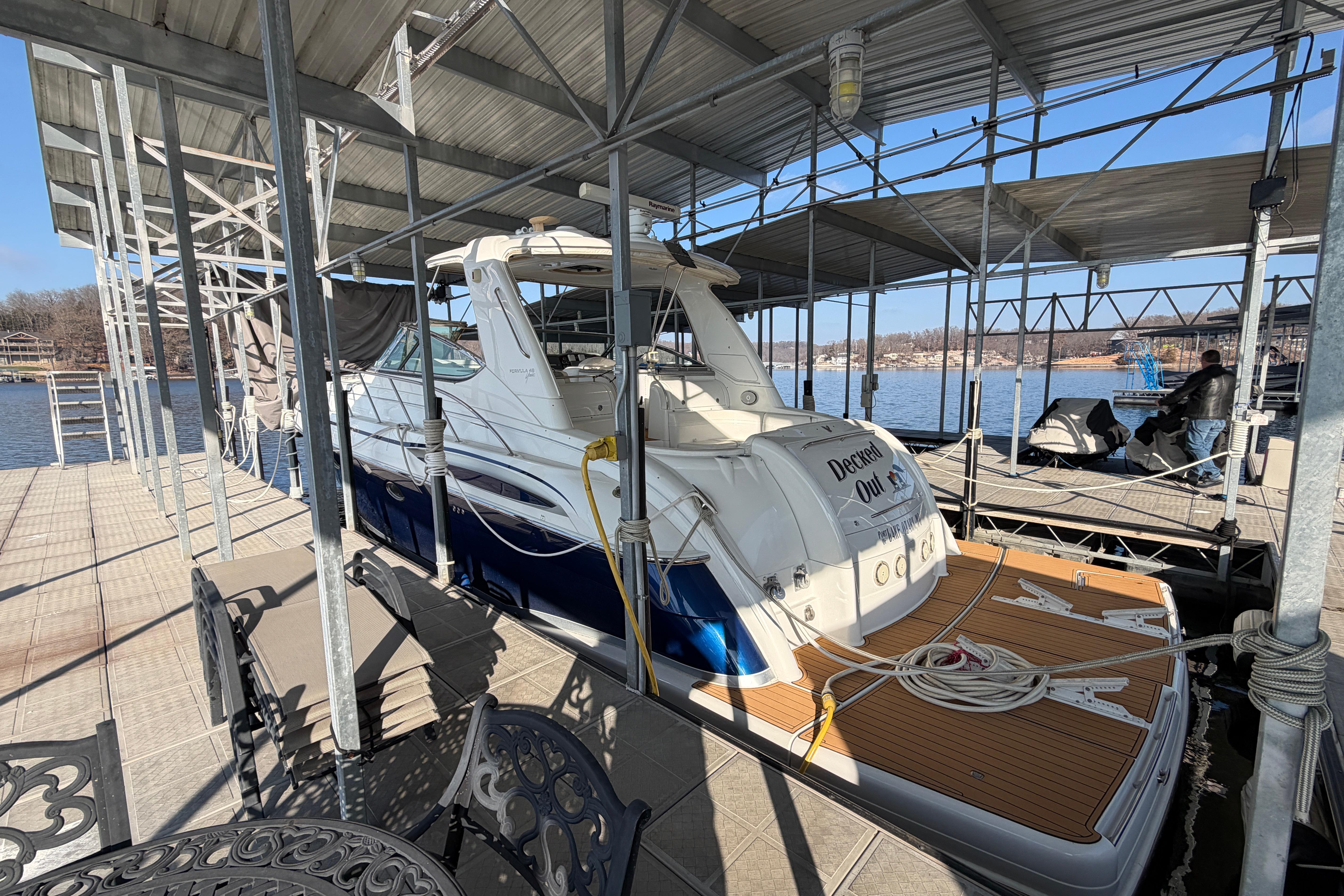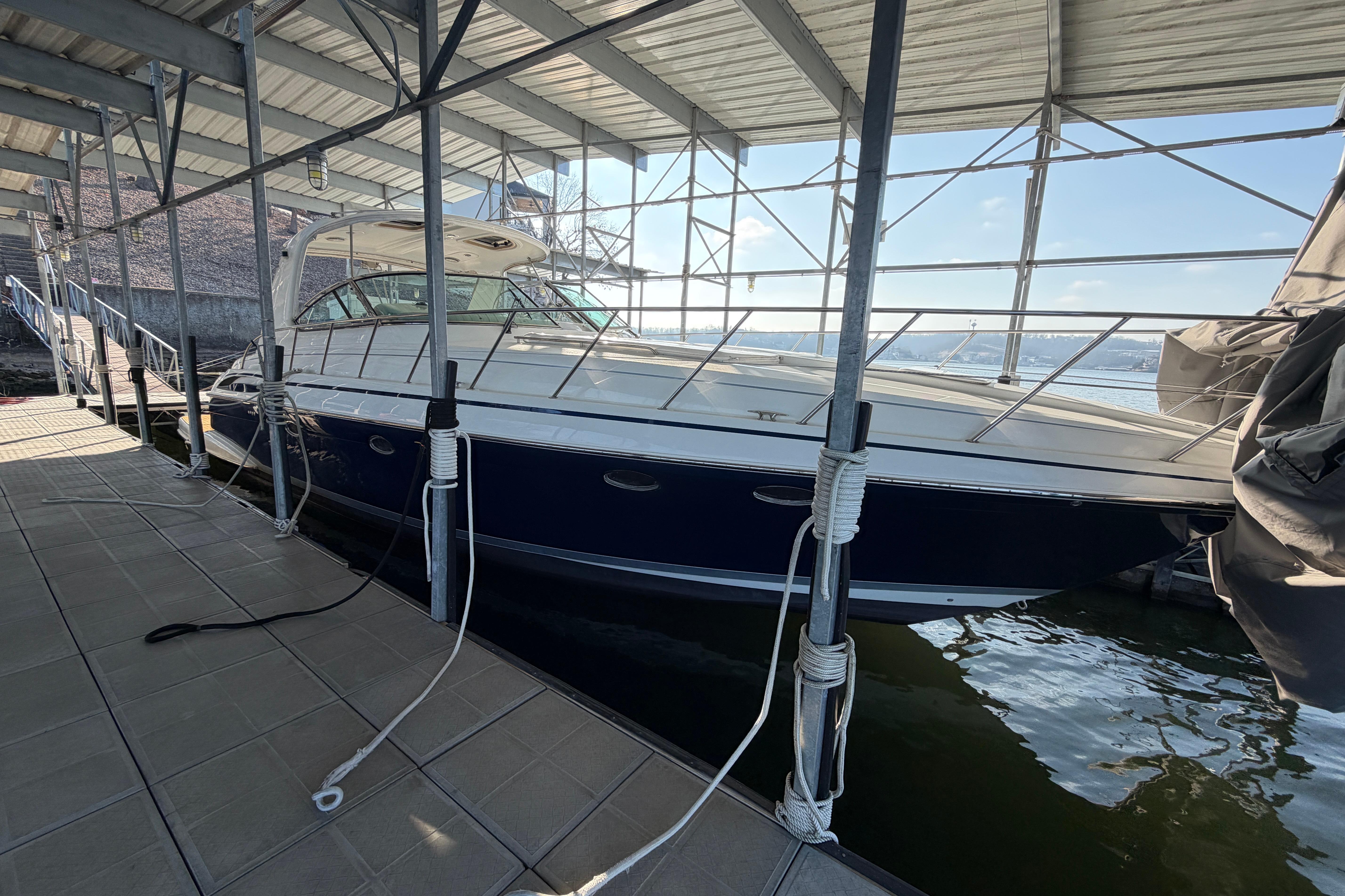 Beautiful yacht always UNDER ROOF on Lake of the Ozarks, Missouri. FRESHWATER, only 490 hours on the big 660 Cummins QSM-11 Engines with V-Drives. Loaded with every available option, including hydraulic platform, hardtop, cockpit ac/heat, two TracVision Sat TV, Raymarine electronics, bow thruster, washer/dryer, 3 LCD TV’s with 3 stereo systems, Formula’s finest finishes throughout.