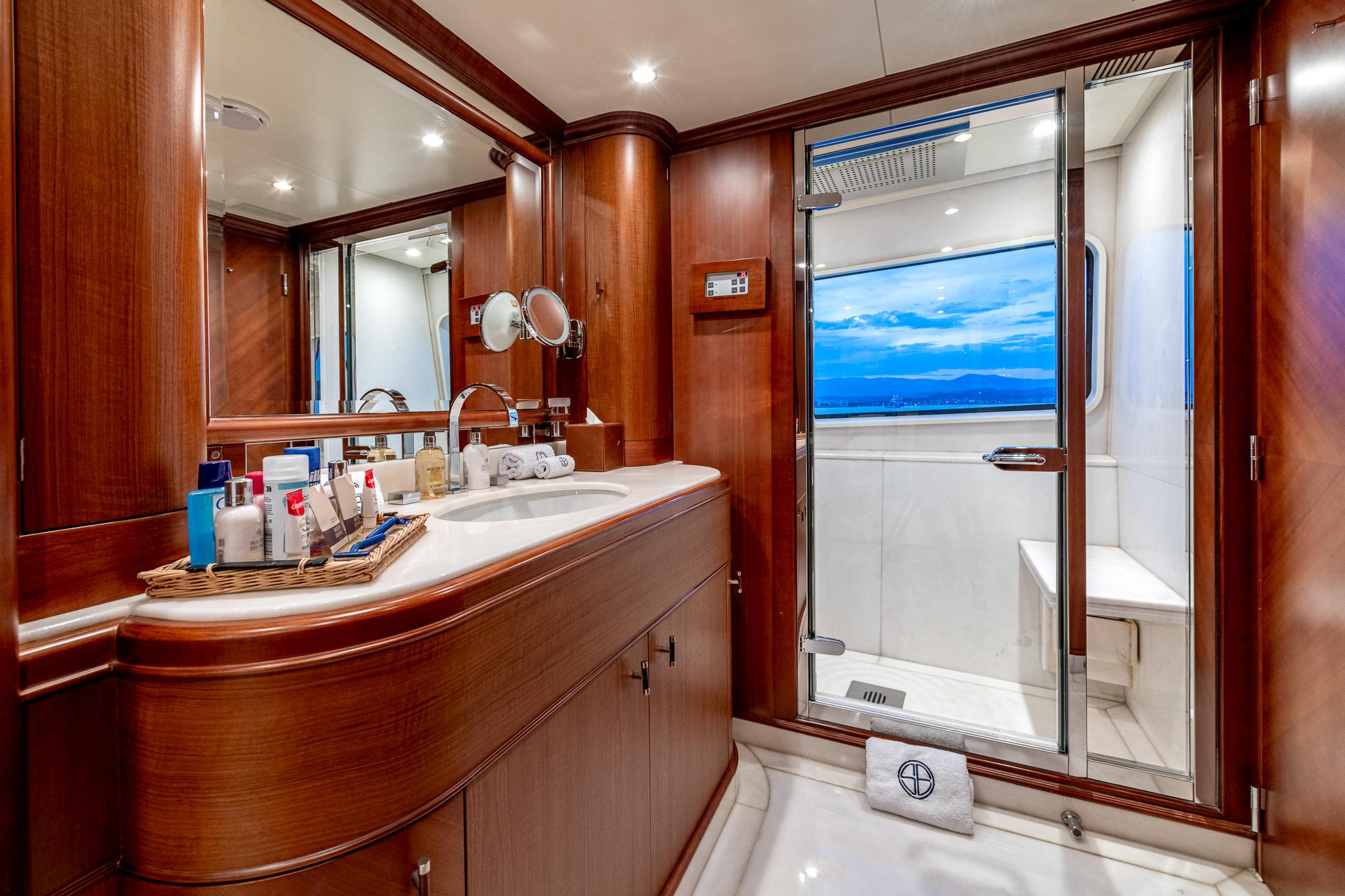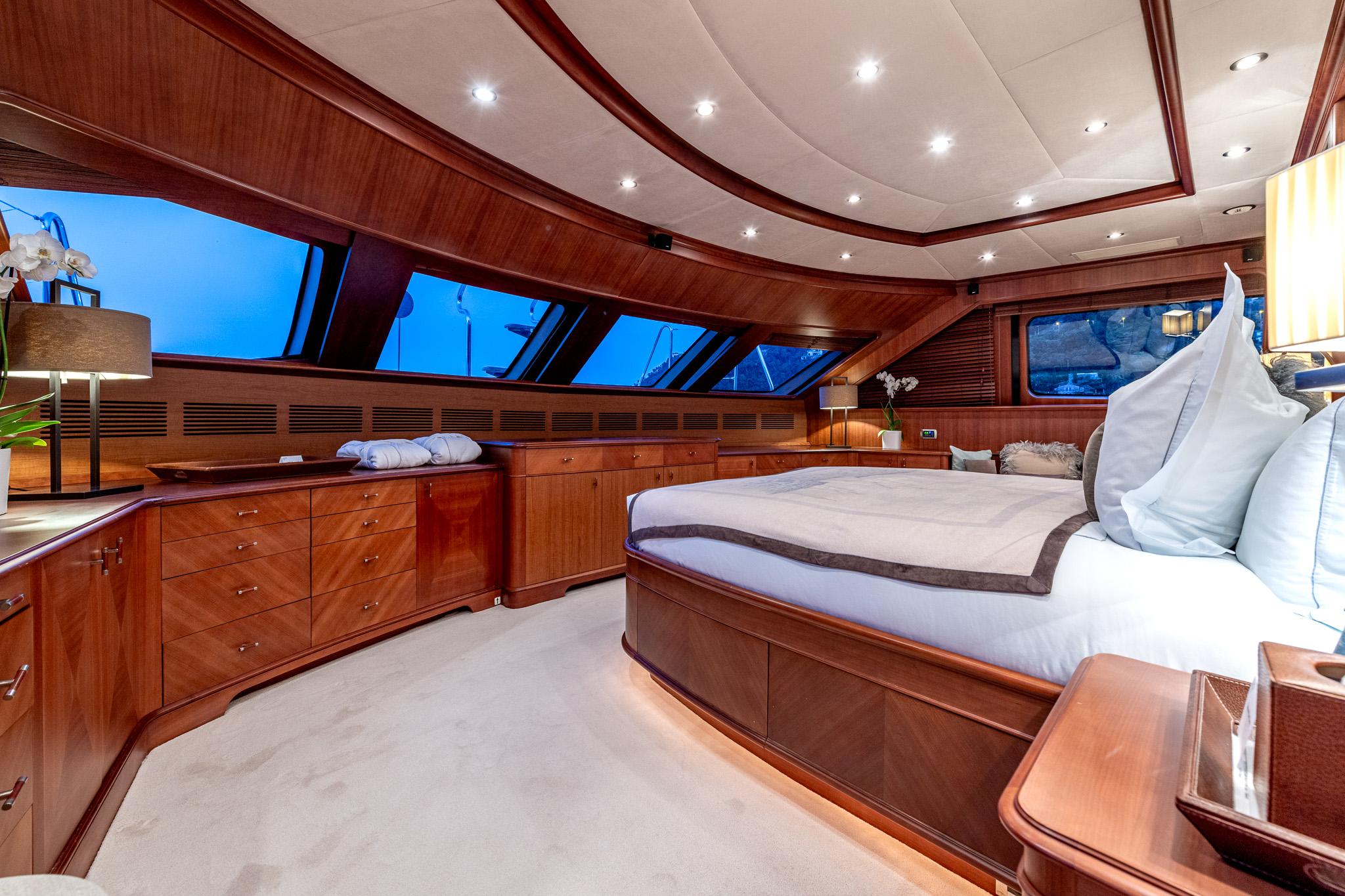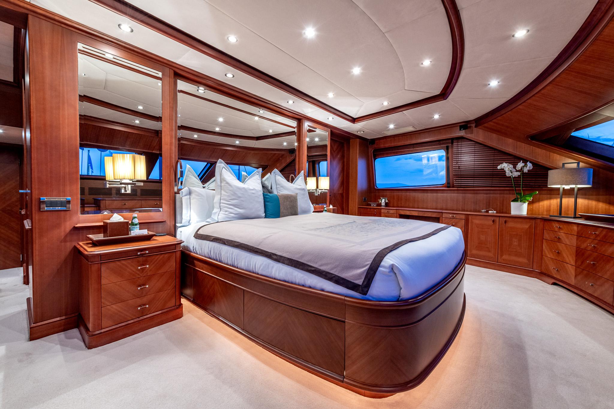 Below deck, the interior is designed for comfort and sophistication. Elegant finishes and thoughtfully laid-out living areas create an inviting atmosphere for owners and guests alike. Accommodation configurations typically include a full-beam master suite on the main deck with panoramic views, along with VIP and guest cabins below — offering ample privacy and flexibility for families or charter guests.