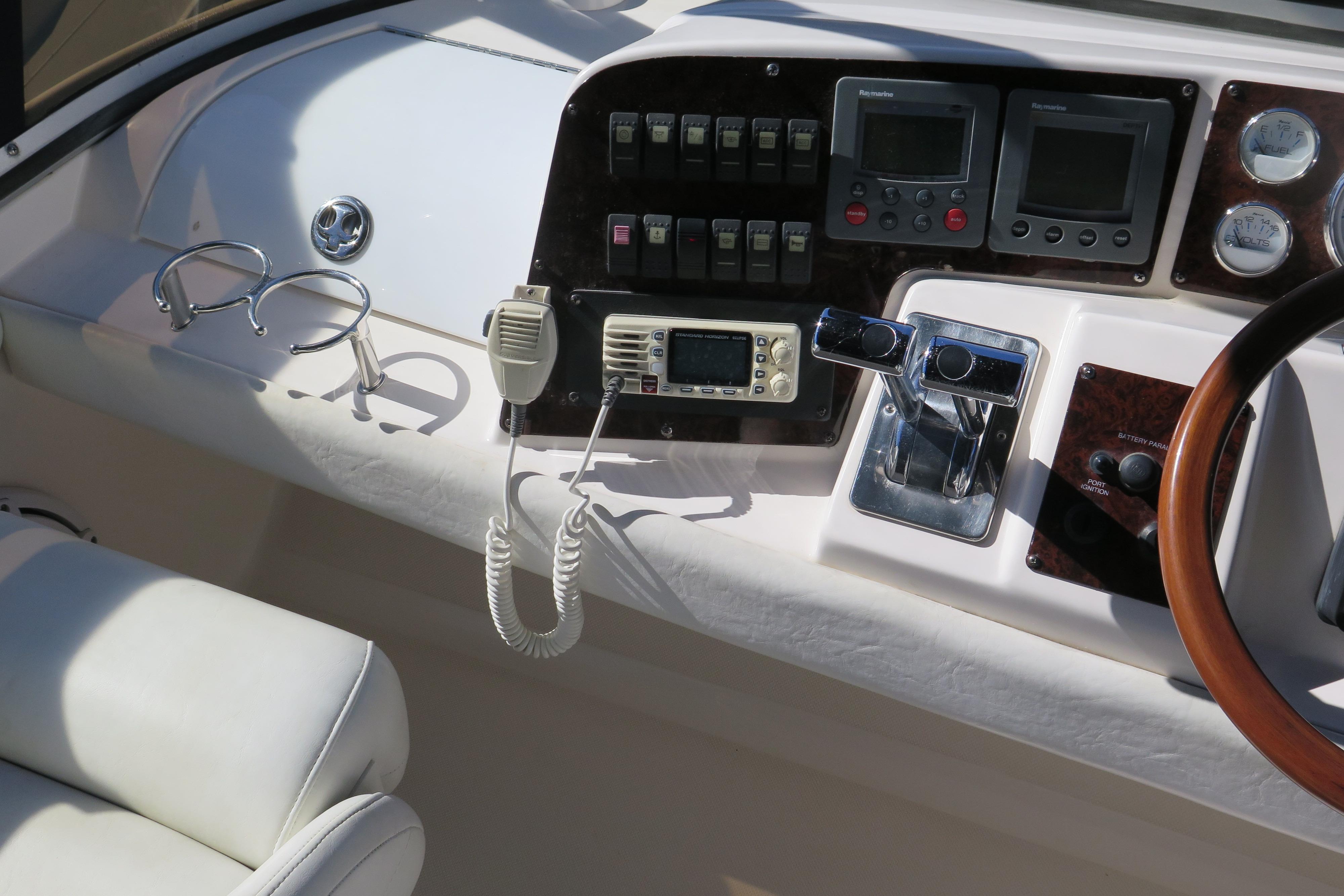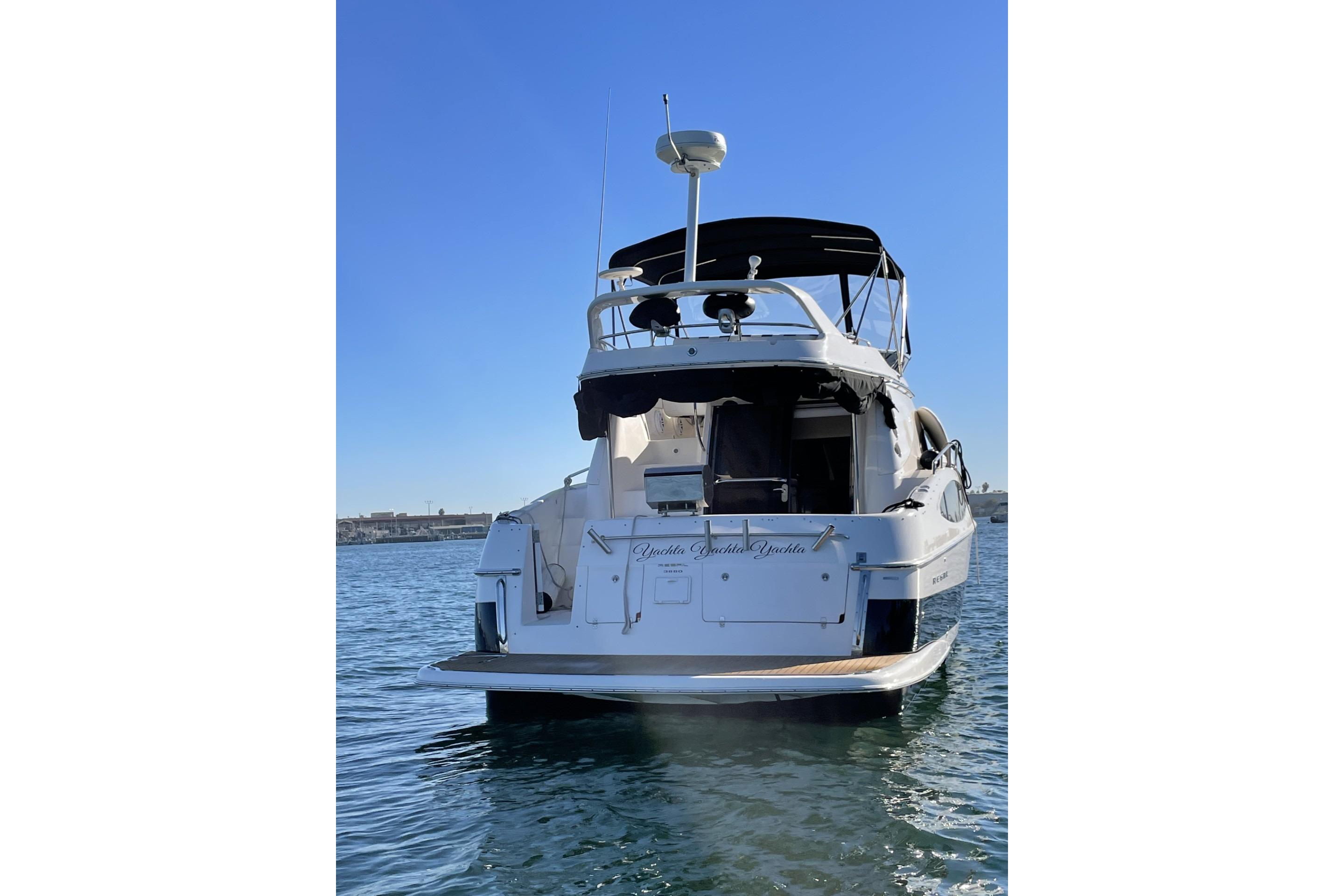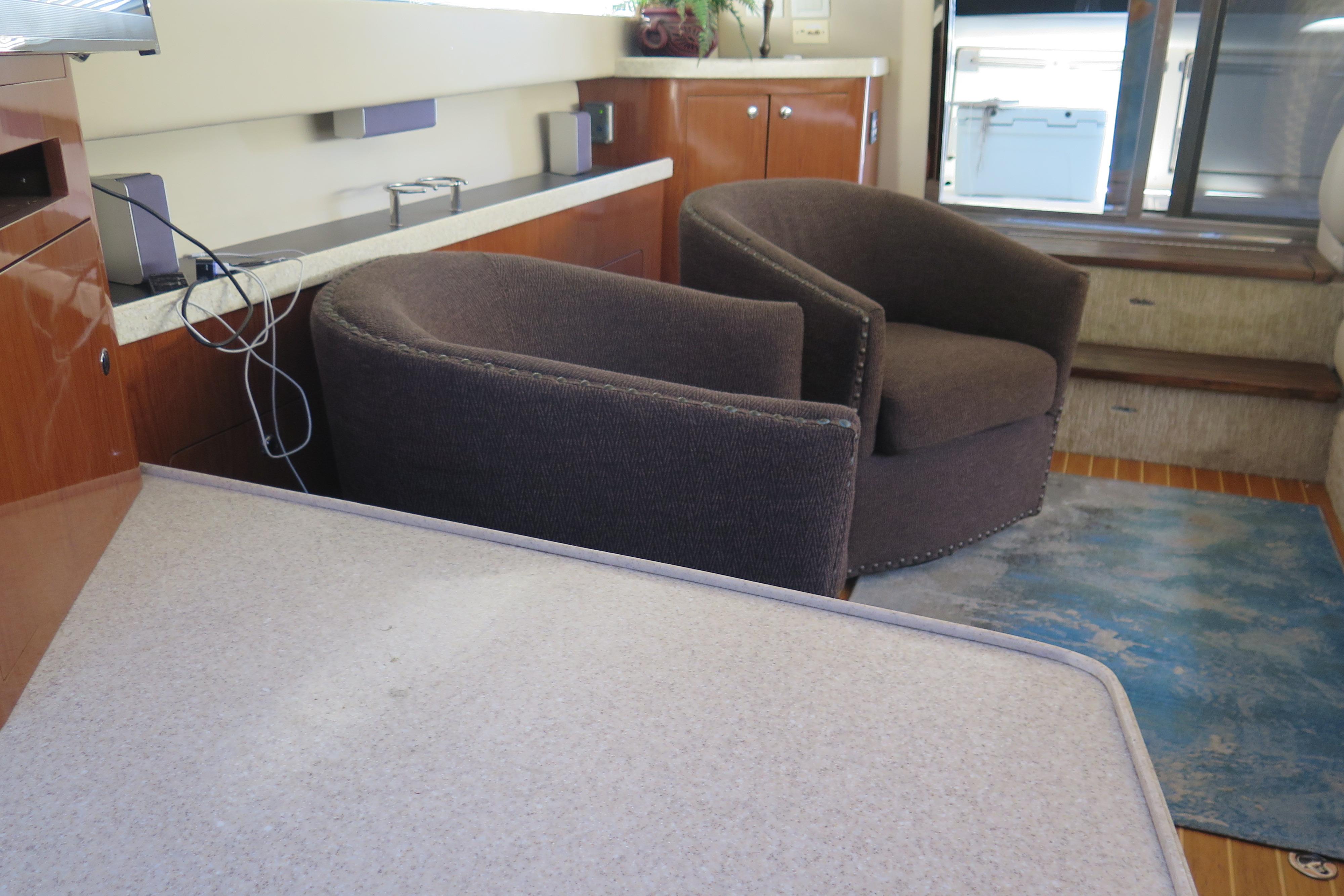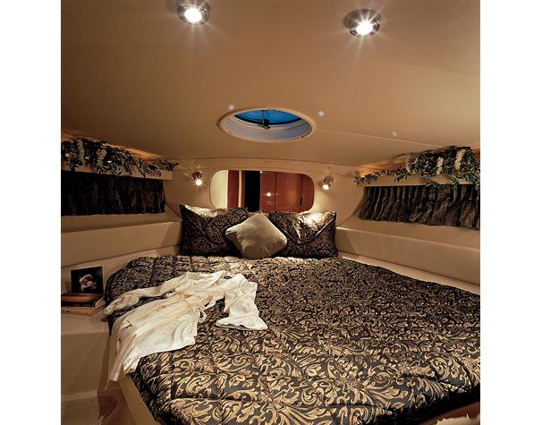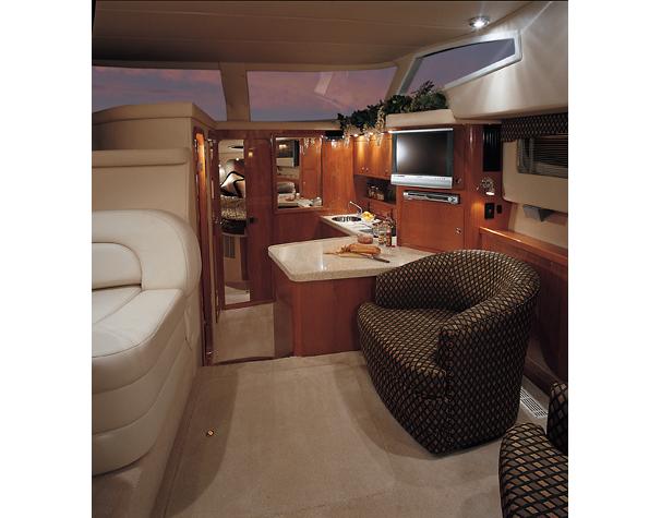The Regal Commodore 3880 has an innovative sedan bridge design that uses the full breadth of its 13-foot beam belowdecks. This provides six feet, five inches of headroom throughout the entire salon and creates not just the appearance of but the actual interior space of a yacht of substantially larger size. The helm features a tilt stainless steel steering wheel, full instrument dash, and easy-to-access switches and gauges. The bridge is accessed via extra wide, molded-in fiberglass steps from the back deck. Down below, the midcabin has its own privacy door and features two twin berths that convert to a queen with a centered padded insert and a VIP stateroom is forward with an island Queen. The head features a Corian vanity, mirrored overhead cabinetry, a standup circular shower stall with swivel door, and an electric head. The galley features Corian countertops with a hidden two-burner stove, microwave, and refrigerator / freezer. The dinette and salon are complemented by two overstuffed barrel chairs and a 20-inch TV. The table drops to convert the dinette to a queen-size berth.