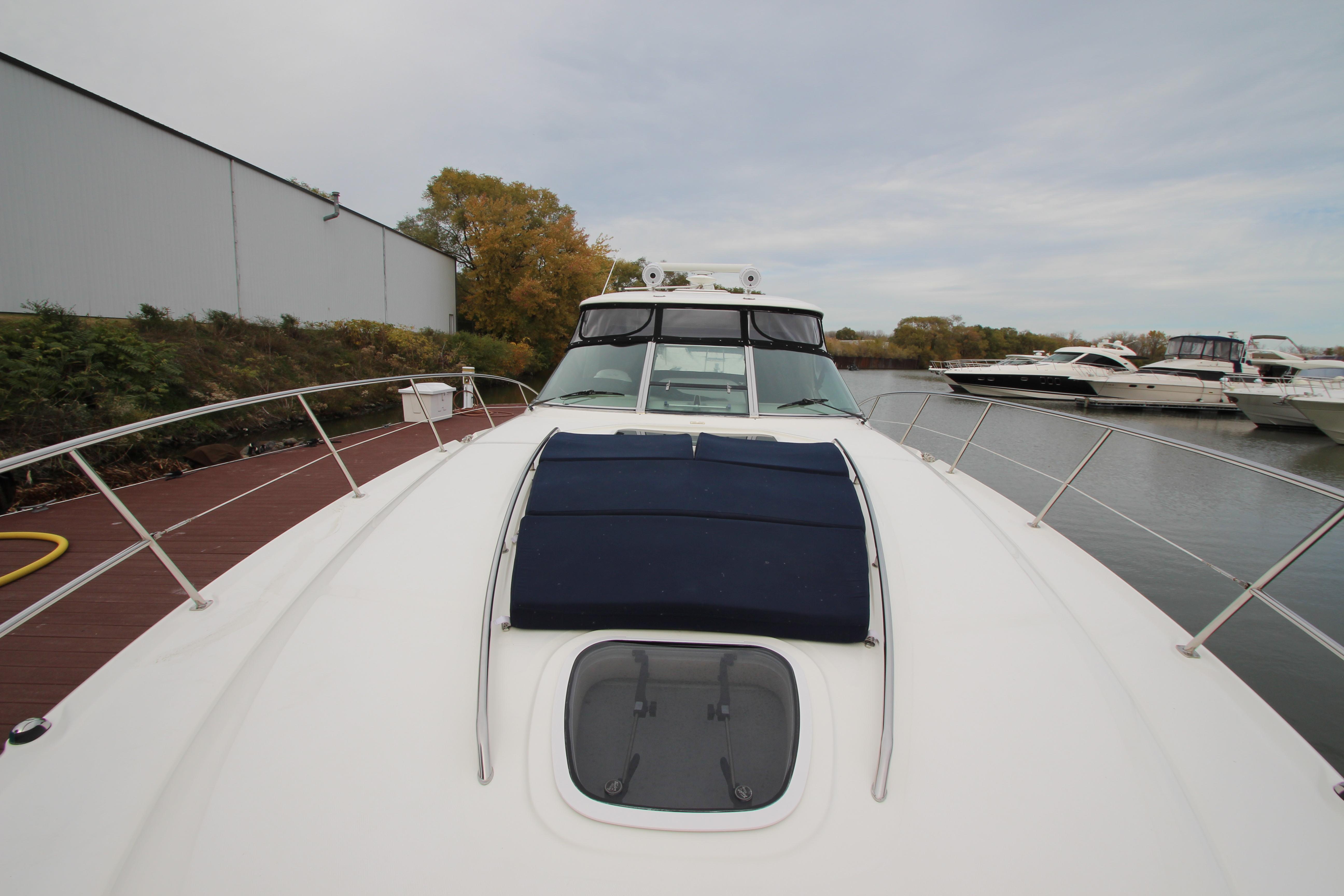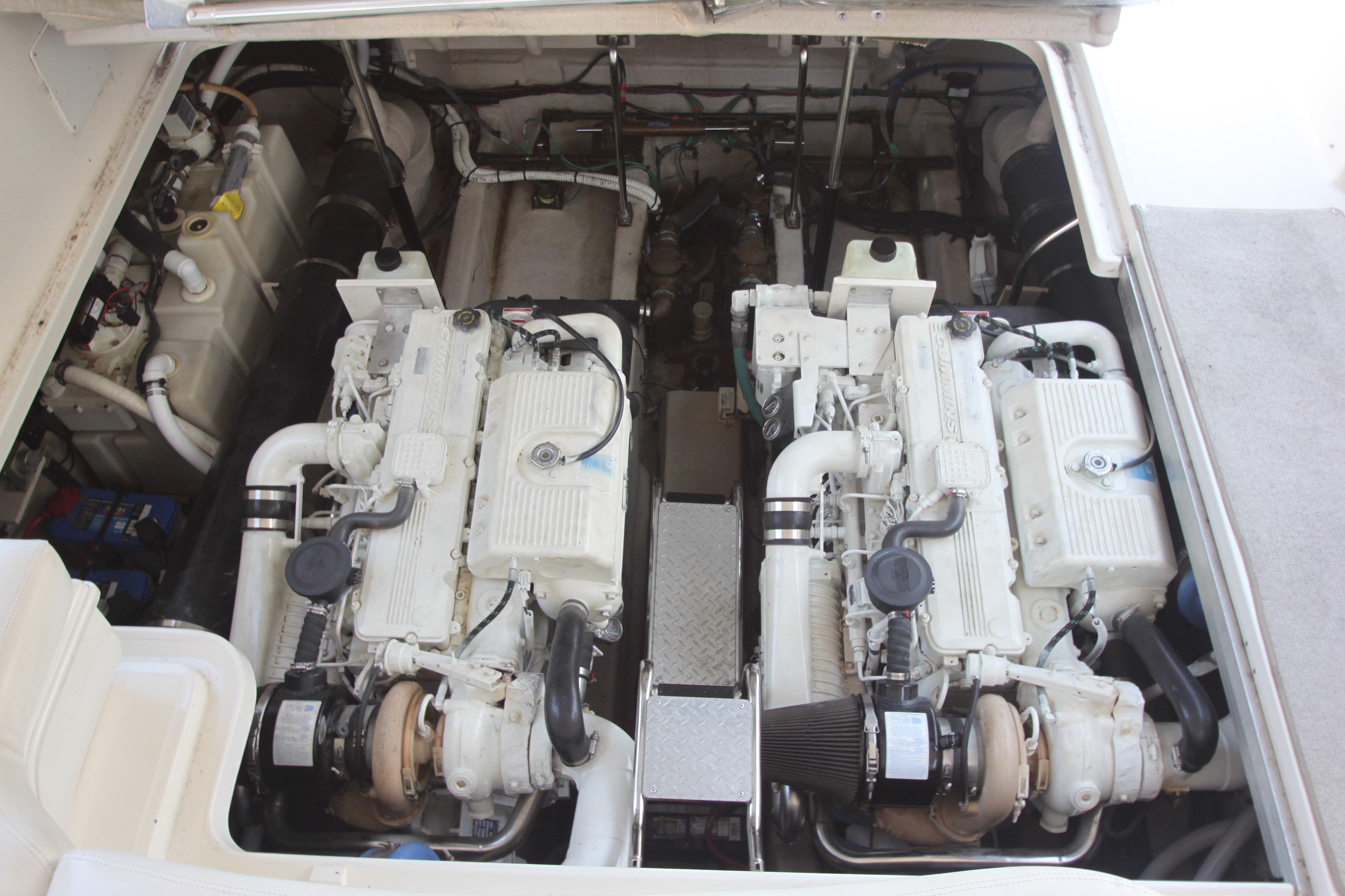 the push of a button for engine access. An extended swim platform, split forward head compartments, transom storage locker, and underwater exhaust system were standard. Cummins 480hp V-drive diesels cruise in the mid/high 20s (30+ top).