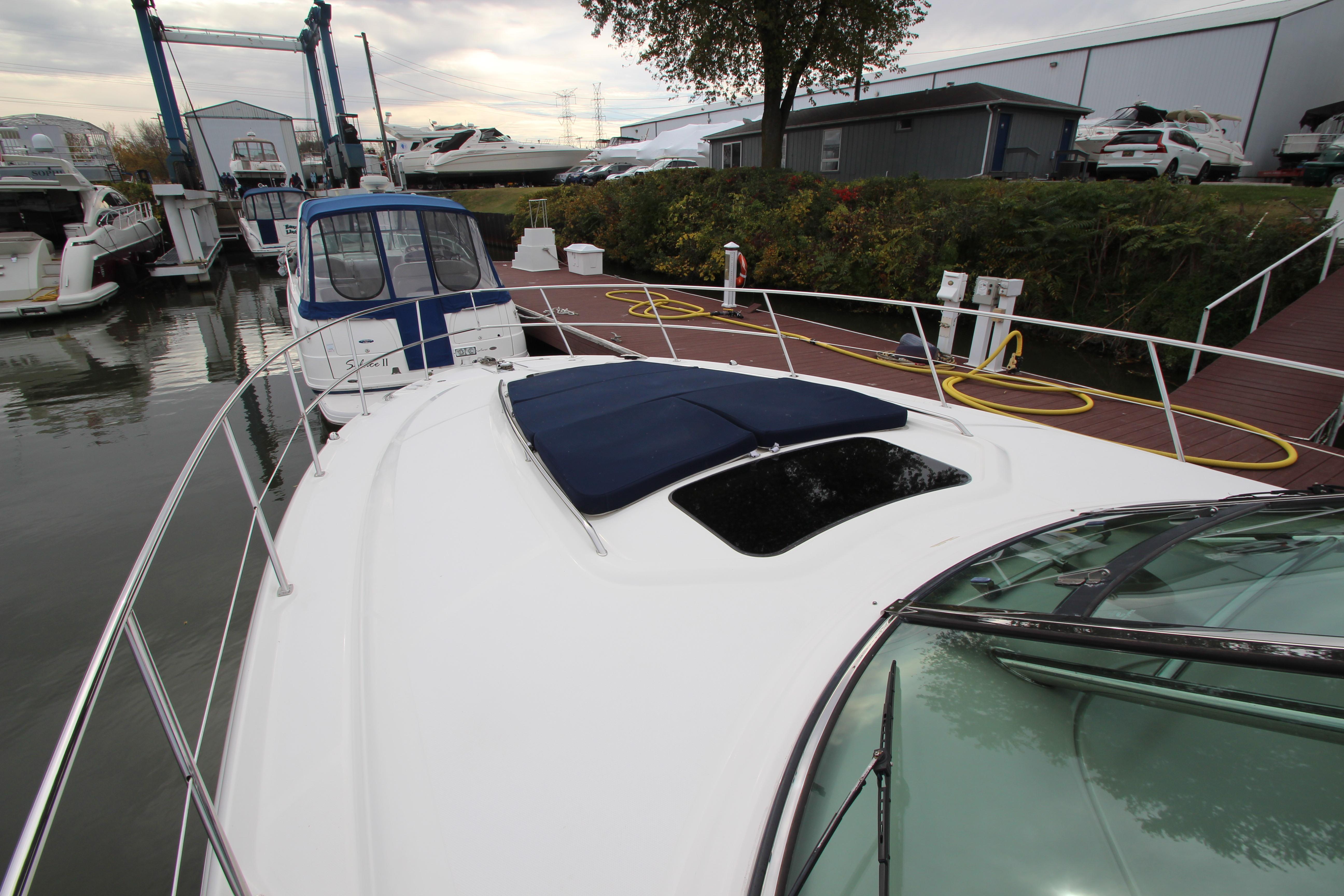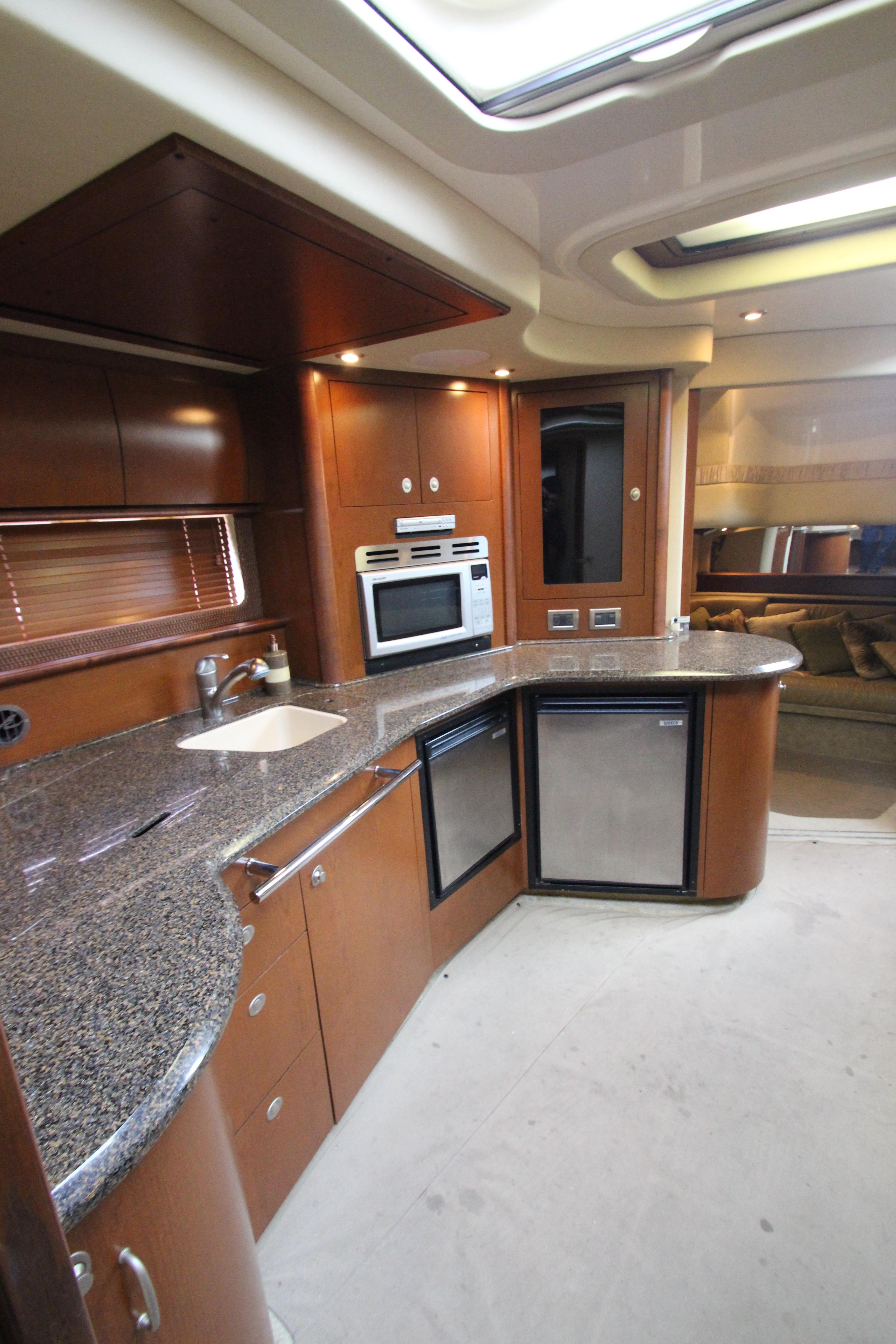 Yet another Sea Ray sales success story, the 440 Sundancer set the gold standard for express yacht styling and luxury during her production years. Her bold styling compared well with the best Mediterranean sport cruisers of her era, and a large cockpit and spacious interior made many of her European counterparts seem small in comparison. Built on a deep-V hull with prop pockets to level the engines, the luxurious two-stateroom, two-head floorplan of the 420 Sundancer is an impressive blend of high-gloss cherry joinery, Ultraleather seating, and designer fabrics. Privacy doors separate both staterooms from the salon, and the Sundancer’s full-service galley includes an undercounter refrigerator/freezer in addition to Corian counters and hardwood flooring. Topside, the entire cockpit sole can be raised at