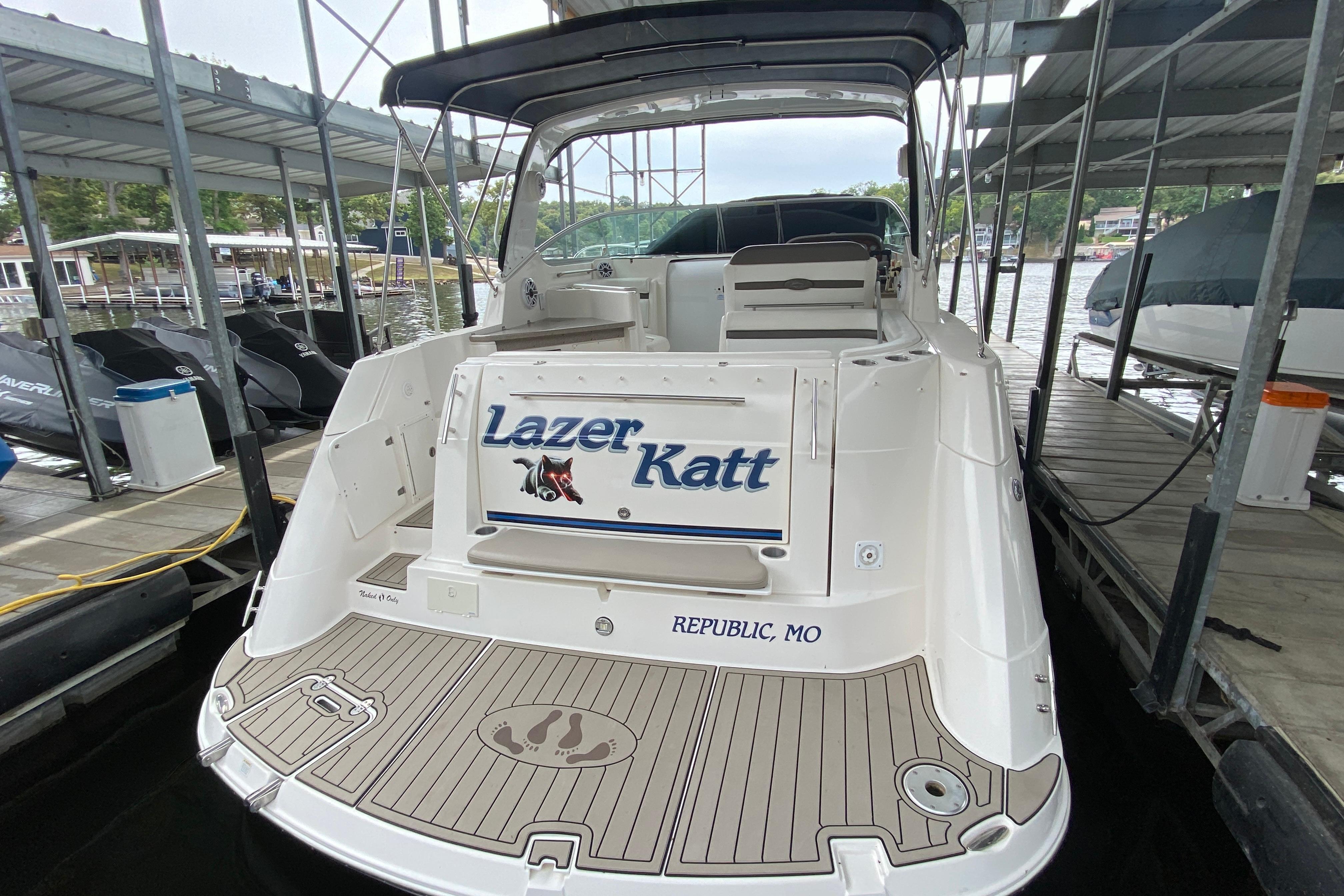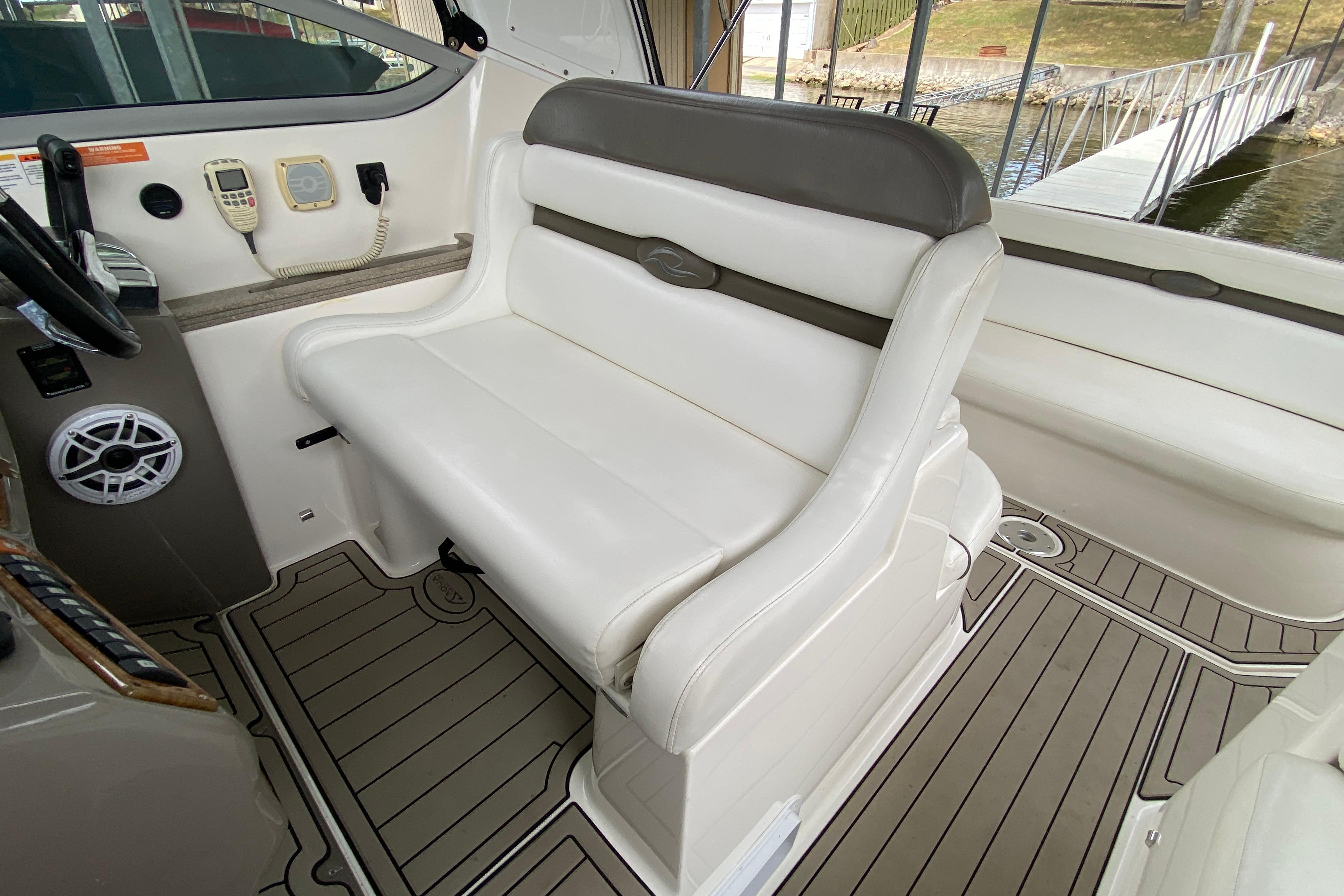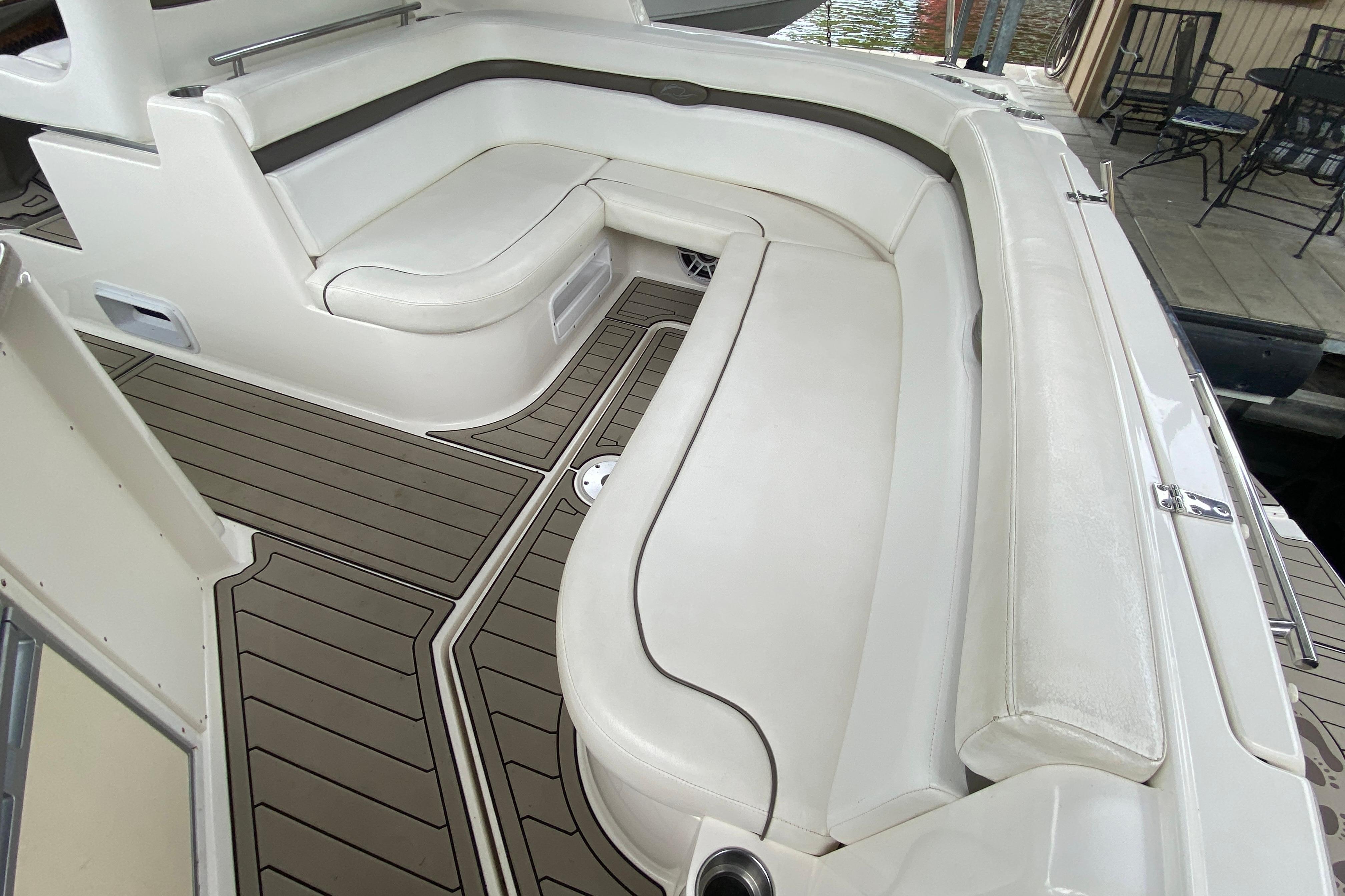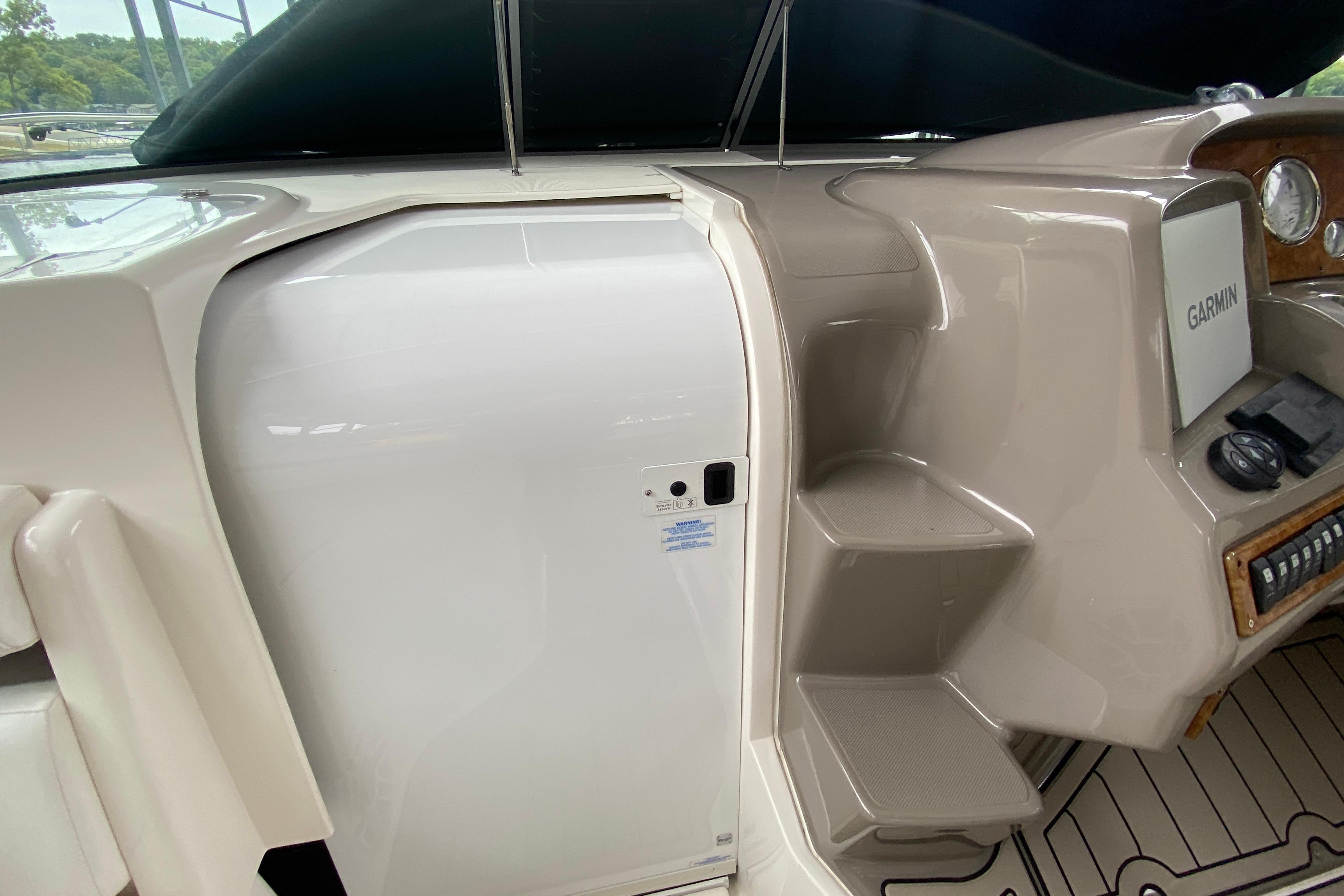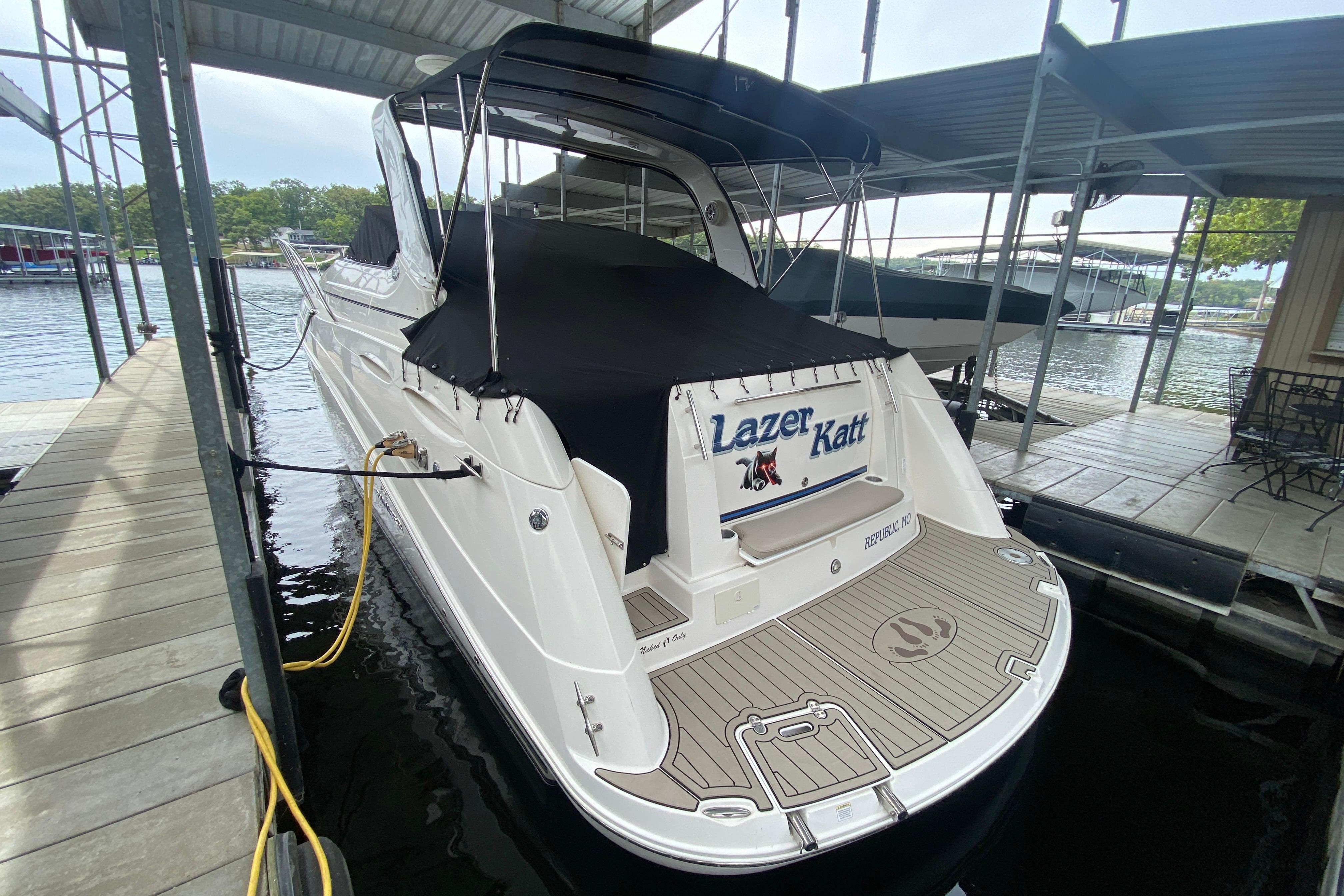 Deck/Hull: Walk through windshield with integrated steps, Cabin screen door, Dock power, Compass, Spotlight, Windshield Wipers, Shore Water, Wet Bar with Refrigerator, foredeck sunpad, transom shower with hot and cold water, Radar Arch.