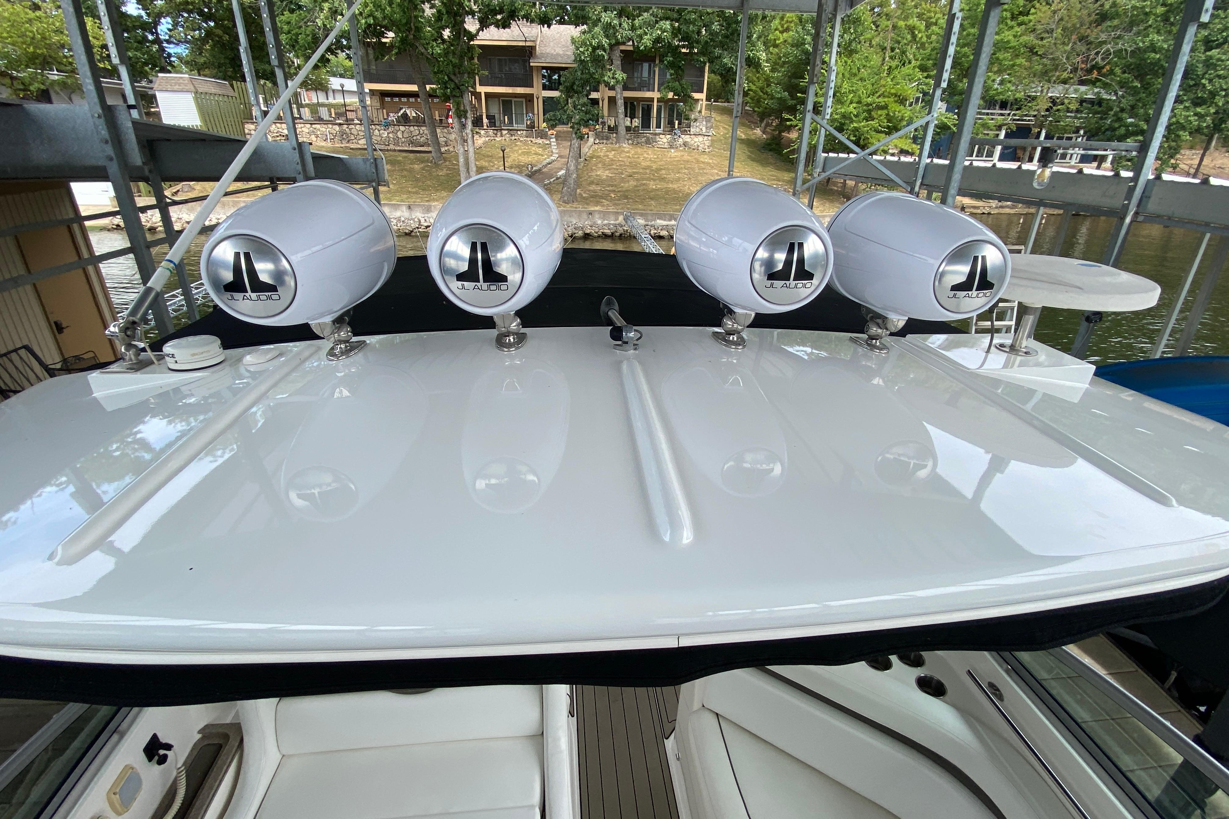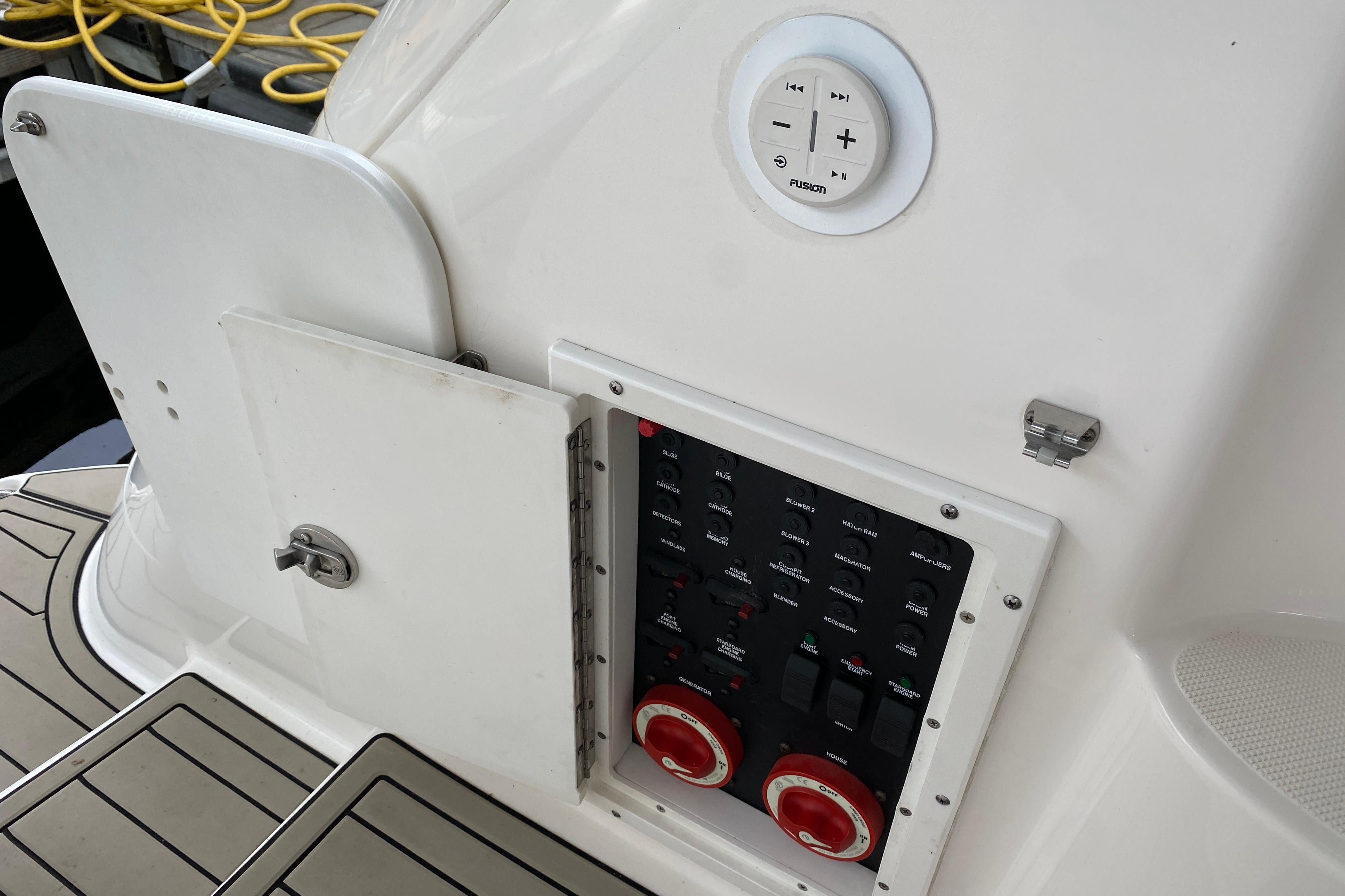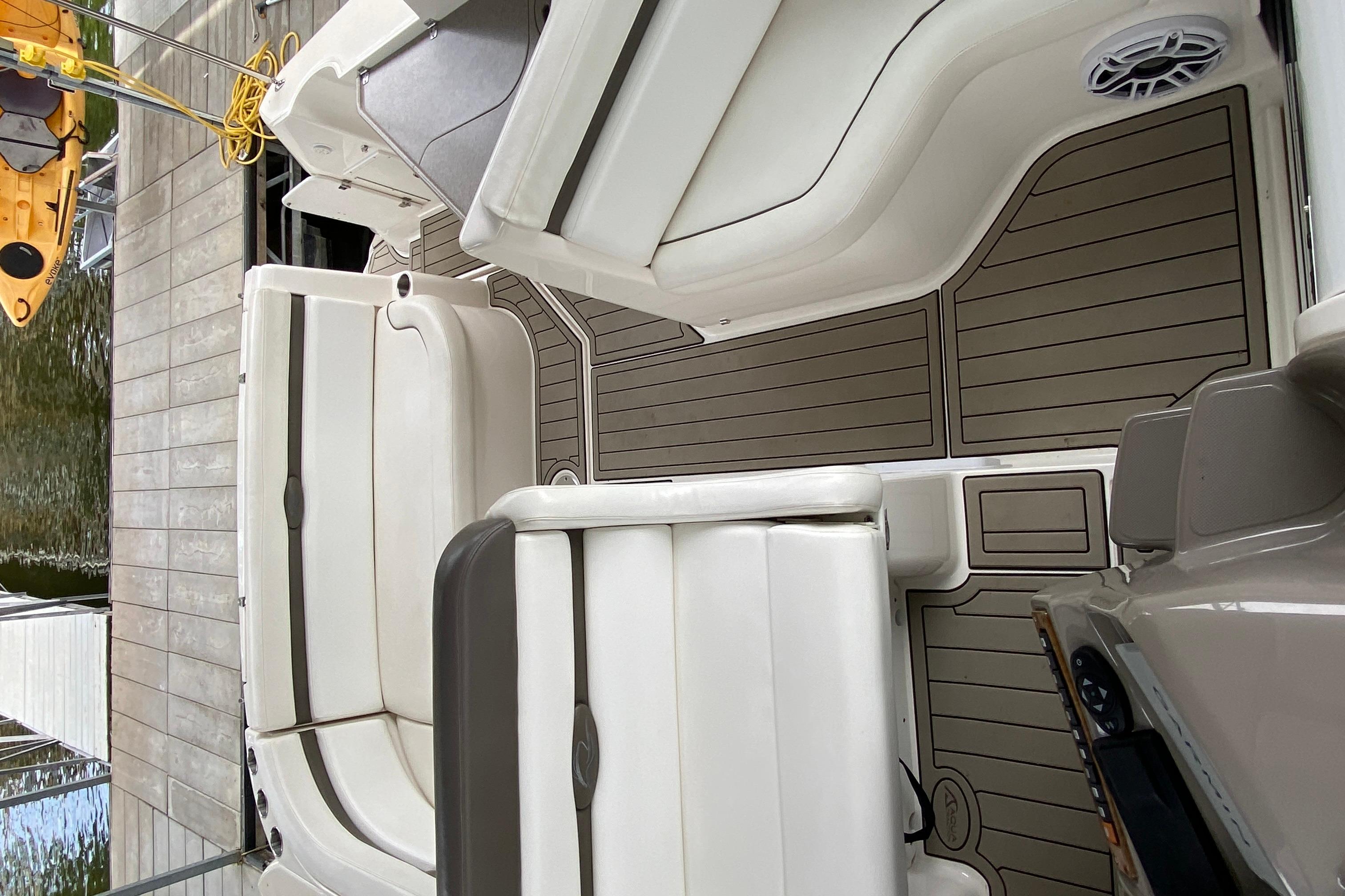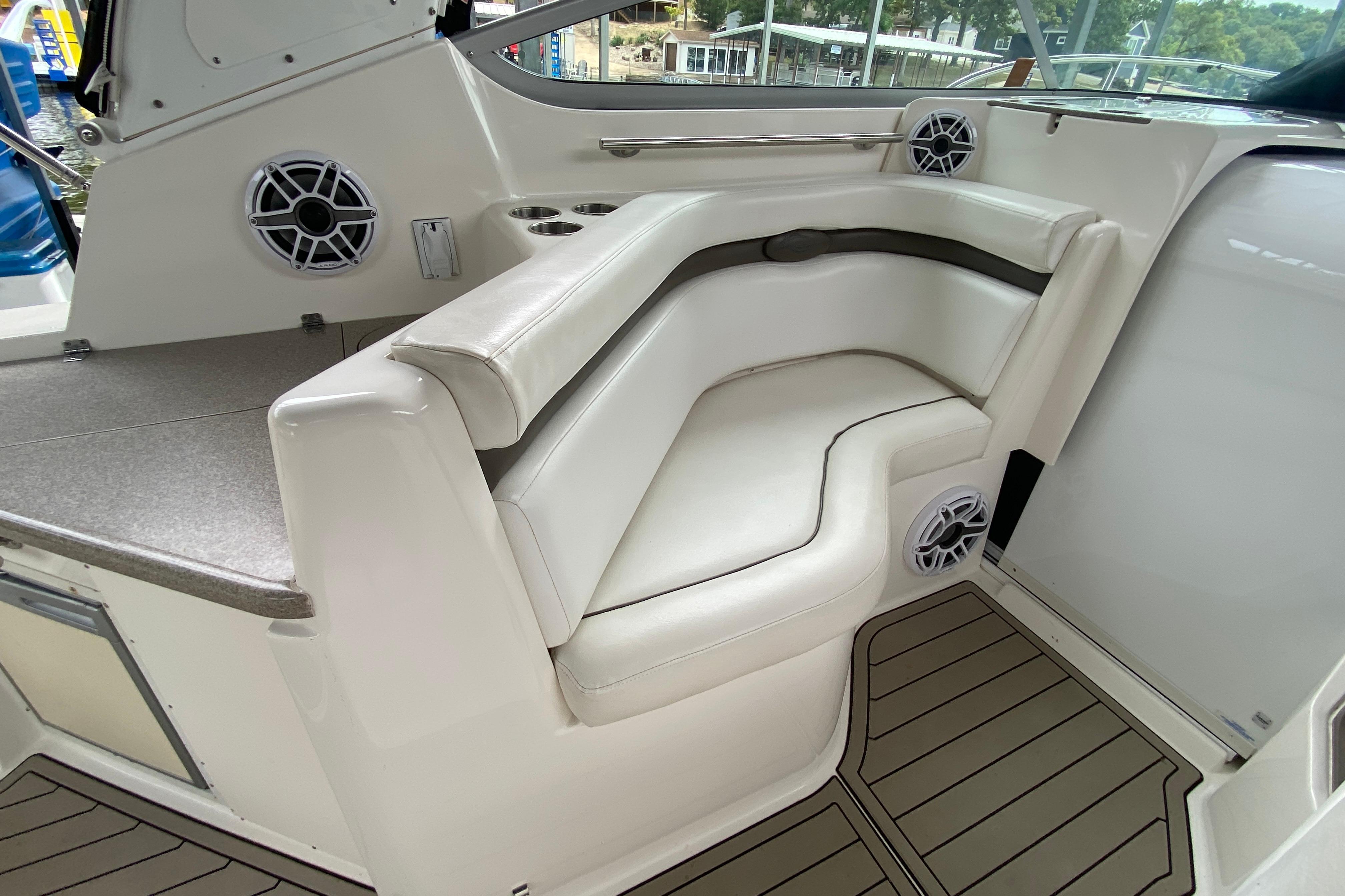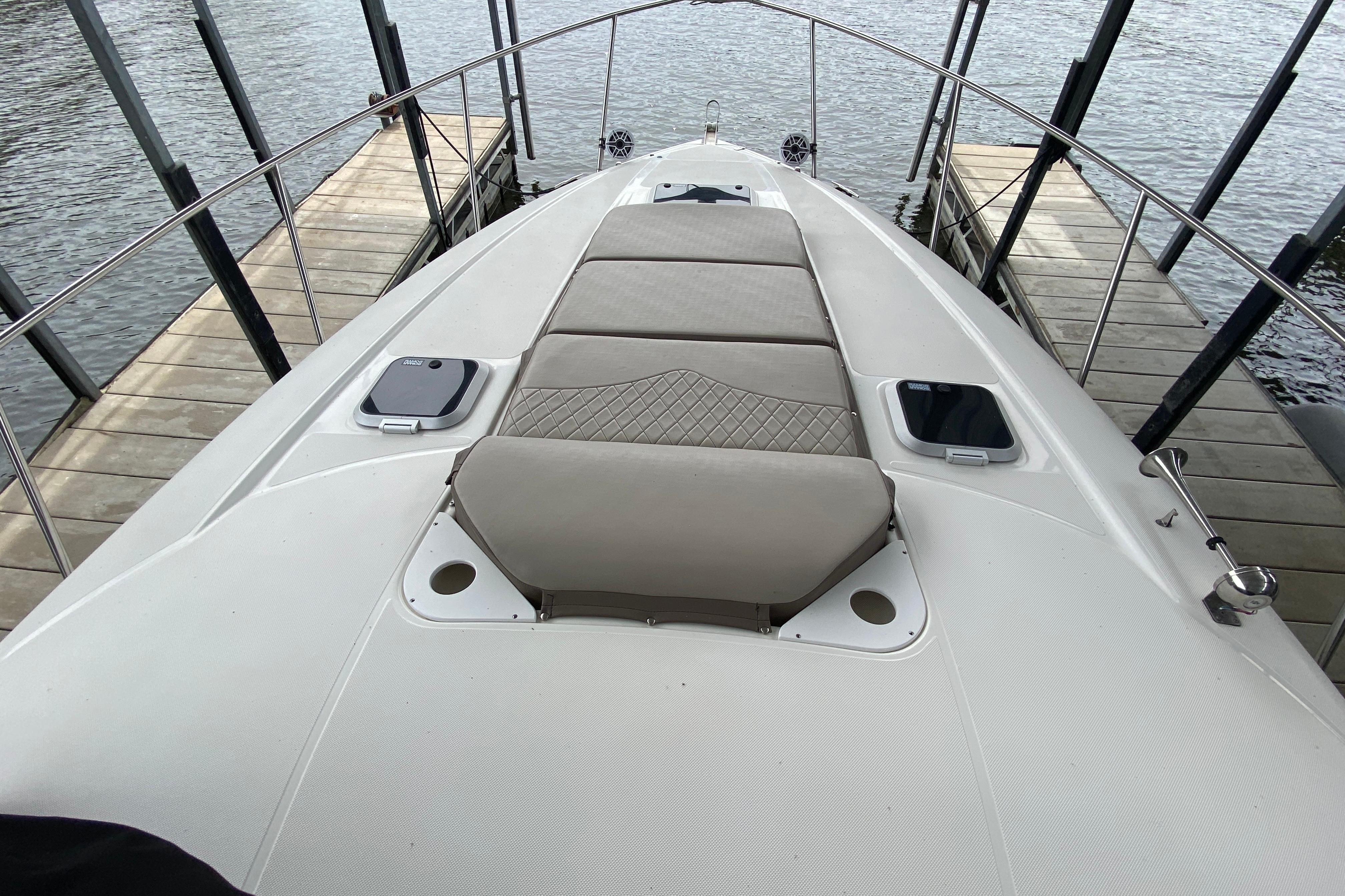 Deck/Hull: Walk through windshield with integrated steps, Cabin screen door, Dock power, Compass, Spotlight, Windshield Wipers, Shore Water, Wet Bar with Refrigerator, foredeck sunpad, transom shower with hot and cold water, Radar Arch.