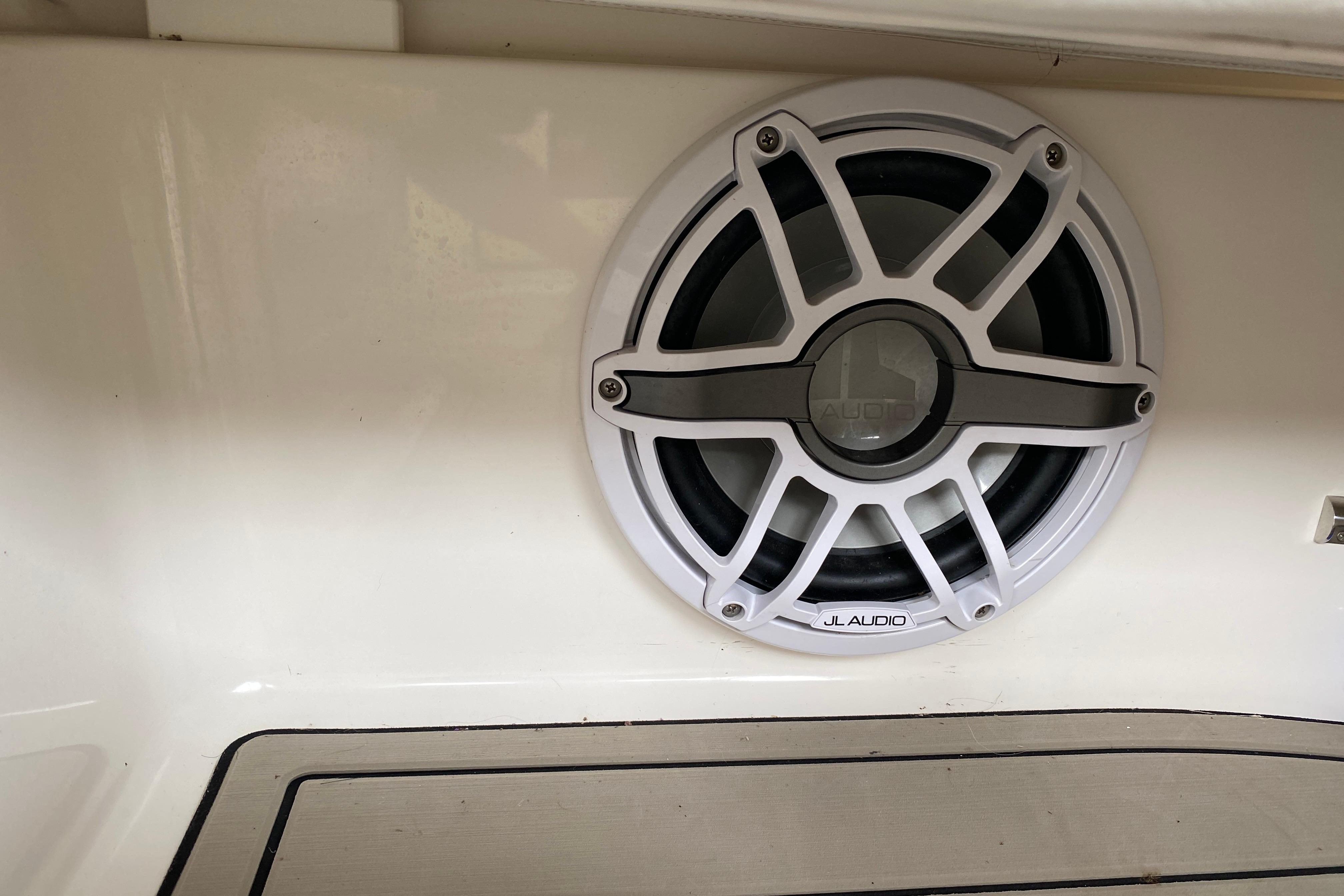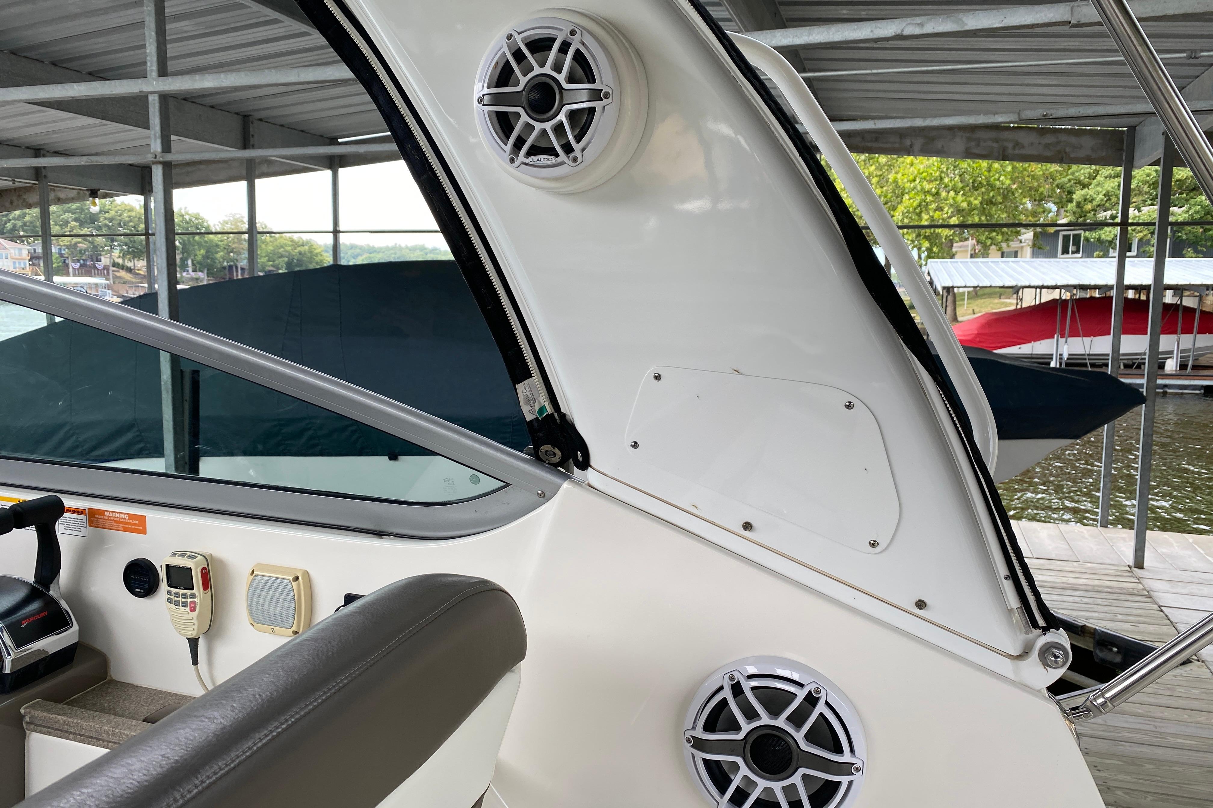 Accommodations: Queen Island bed in forward, Midcabin area doubles as seating area or folds into sleeping berth, Head with vacuflush head, Separate enclosed shower, Flat screen TV in salon, Small flatscrenn w/DVD in galley. IMPRESSIVE stereo-Fusion headunit with transom remote, JL speakers.