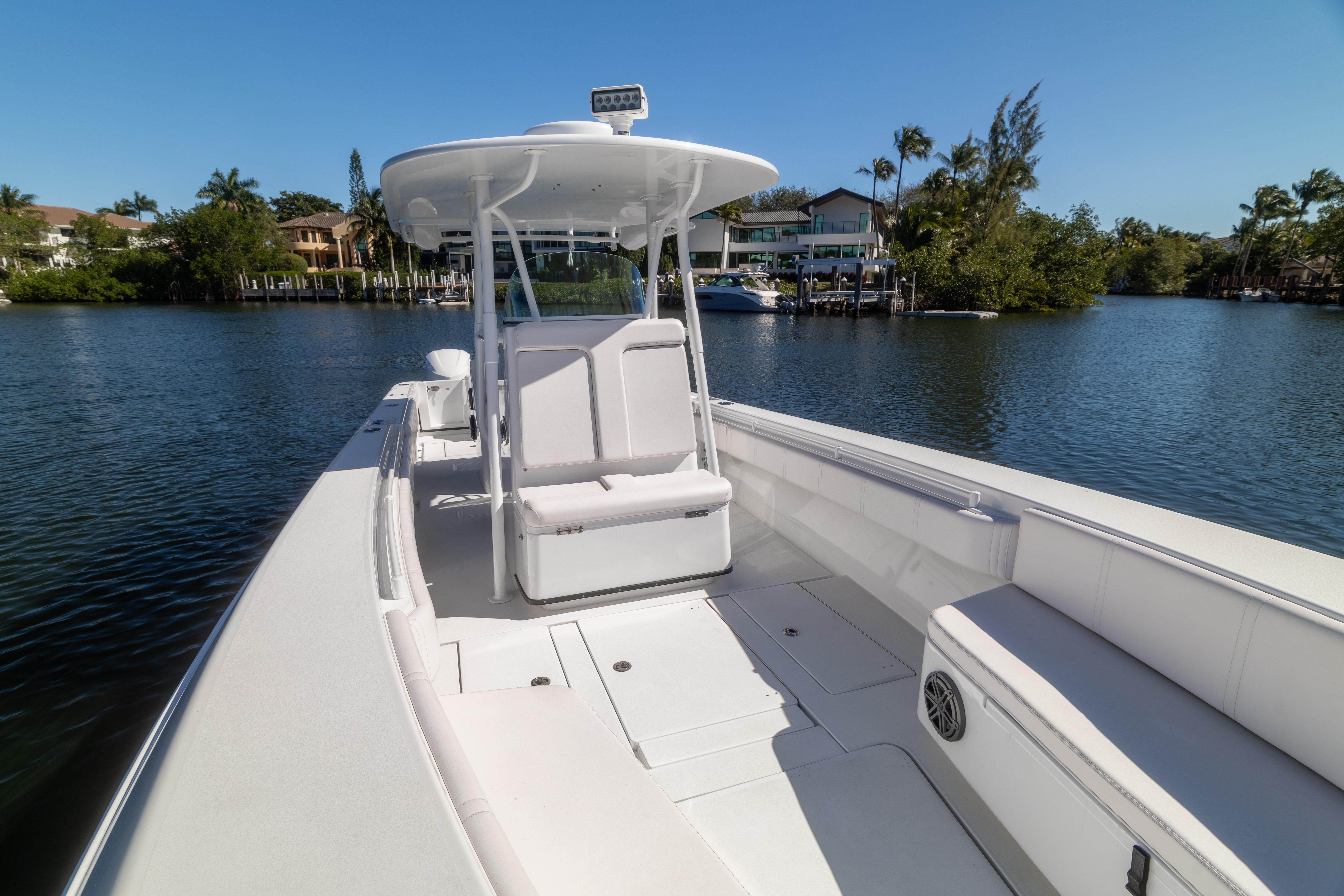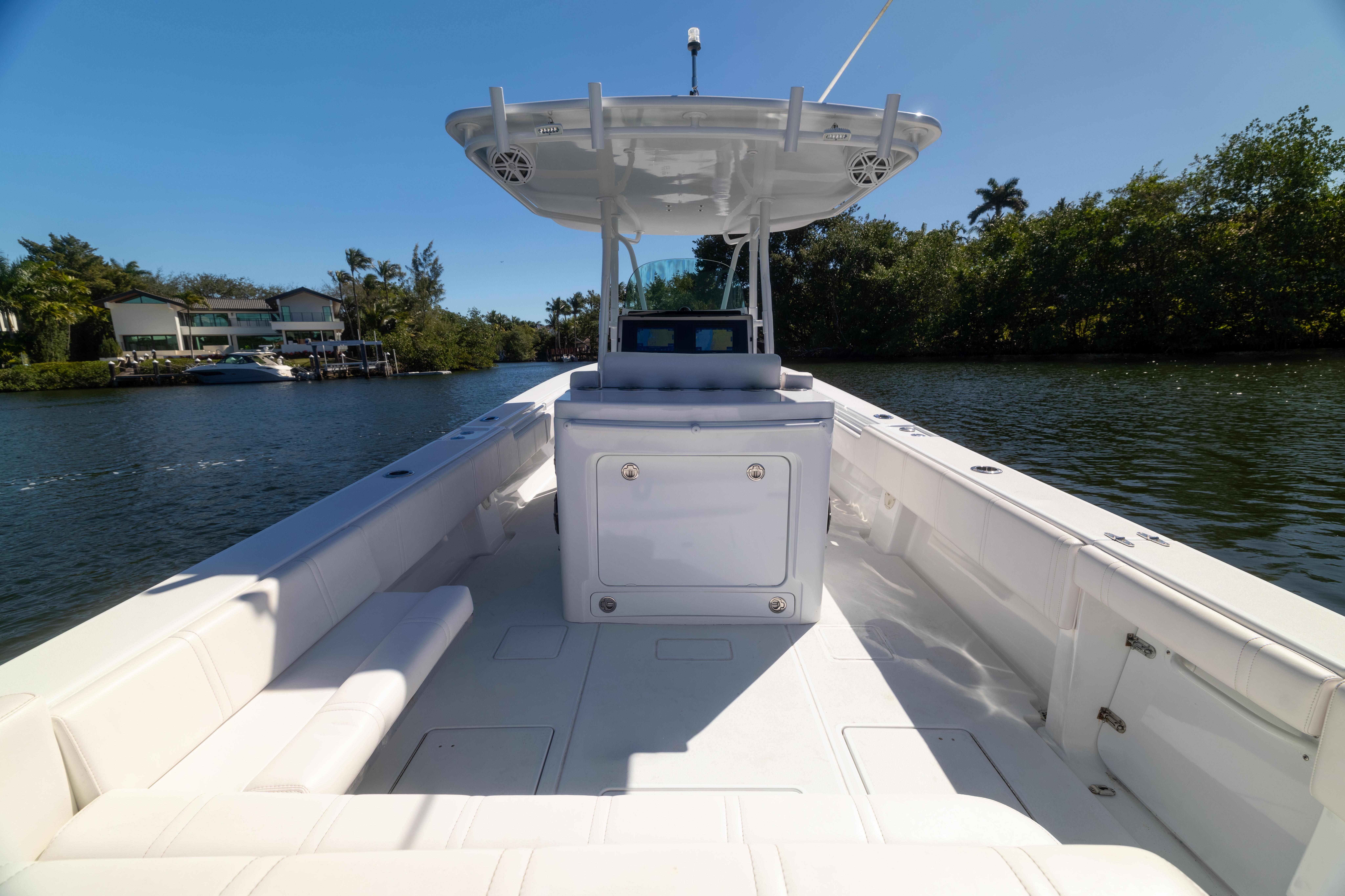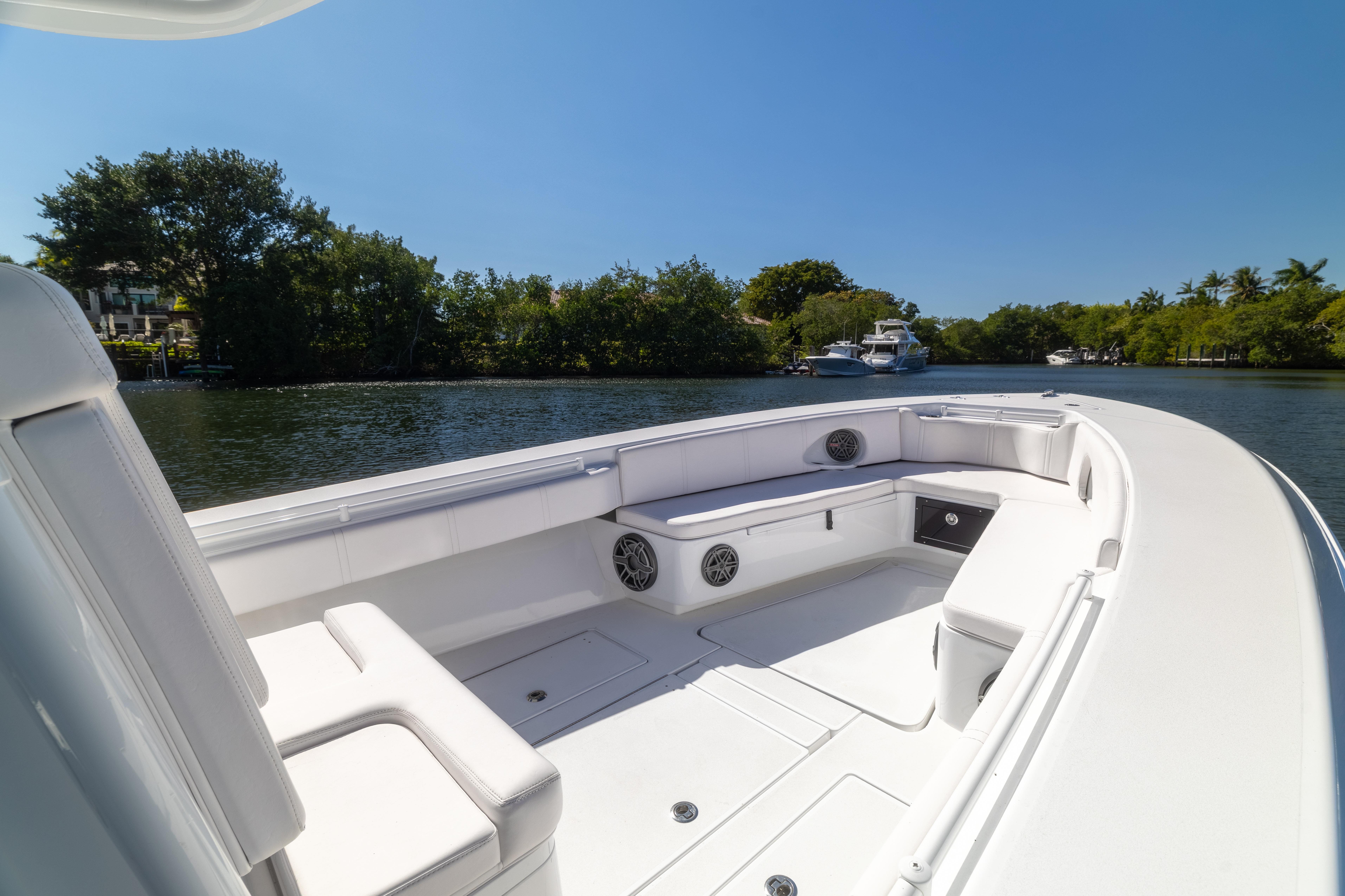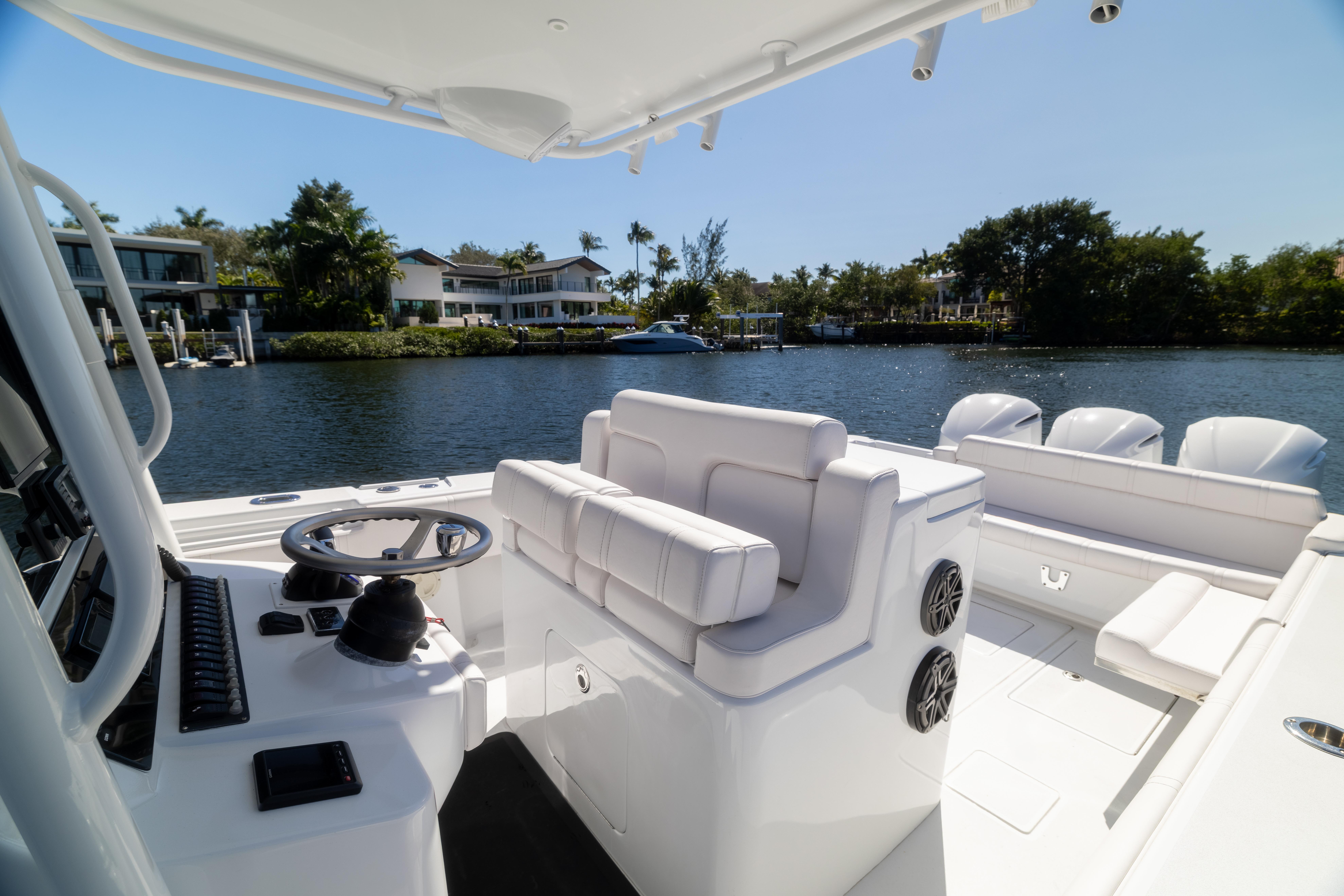 The Contender 35 LS is a luxury sport center console designed for a versatile mix of serious fishing and family friendly recreation, making it ideal for those who want a single boat for both activities. Key features include a side console, powder coated rails, high end upholstery, a recessed bow area for seating or sunning, a side entry door, and a comfortable cabin in the console with a head. This 35 LS is also equipped with a grill and sink behind the helm seating.