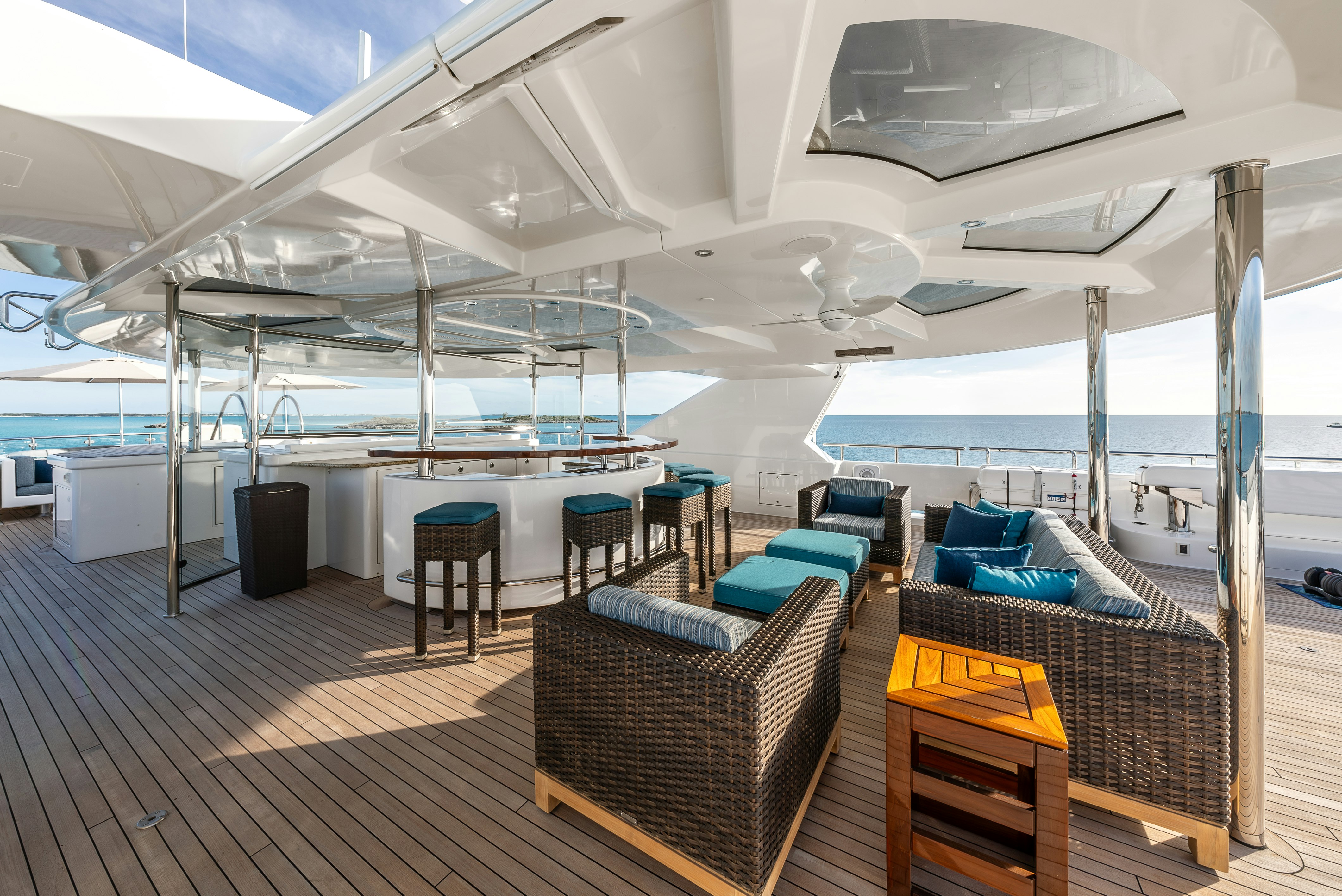 Inside, the yacht’s interior blends contemporary and classic design themes, with rich wood finishes, neutral accents, and spacious living areas that balance comfort and sophistication. The salon flows naturally to the aft deck, creating an inviting atmosphere for relaxation or sunset gatherings.
