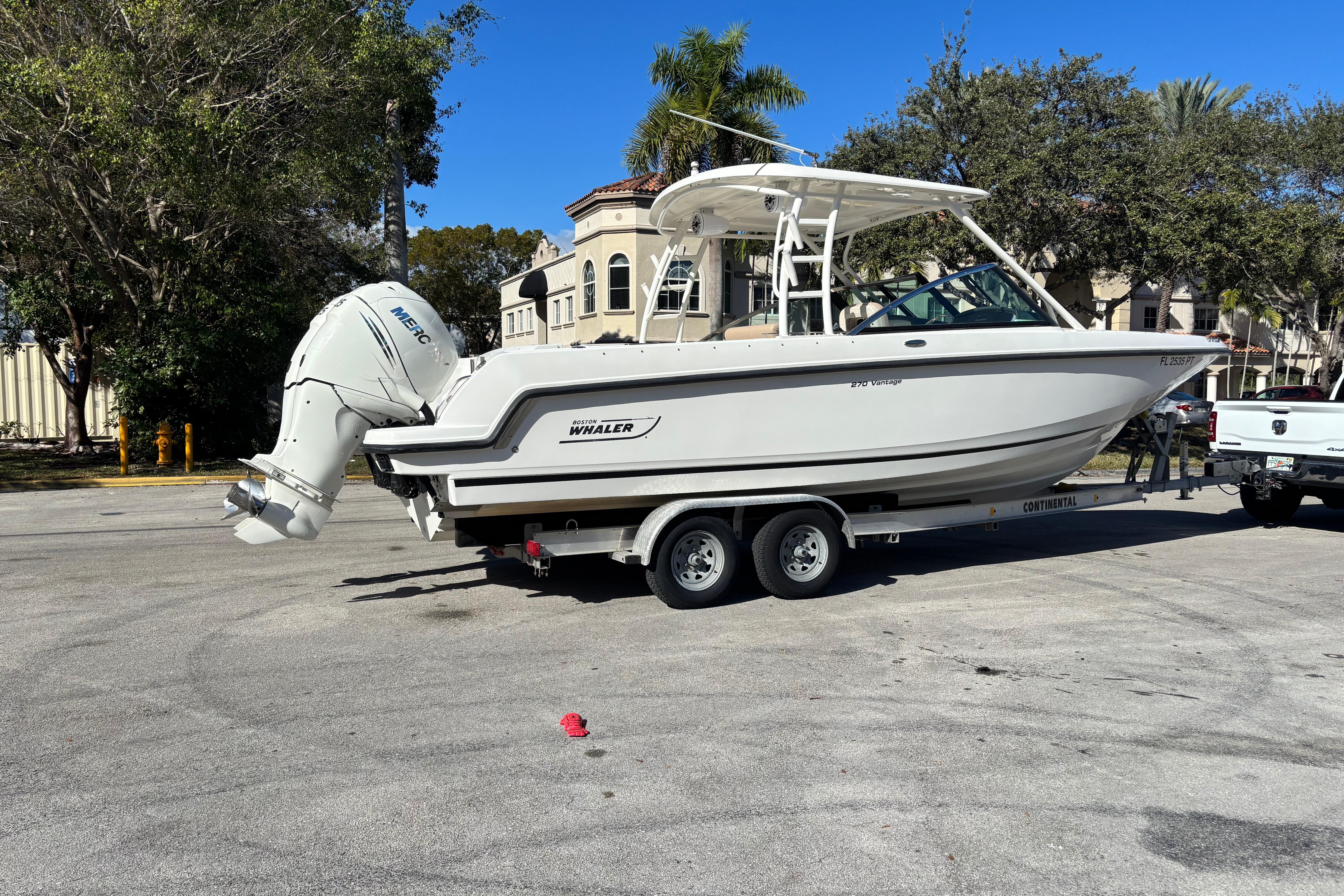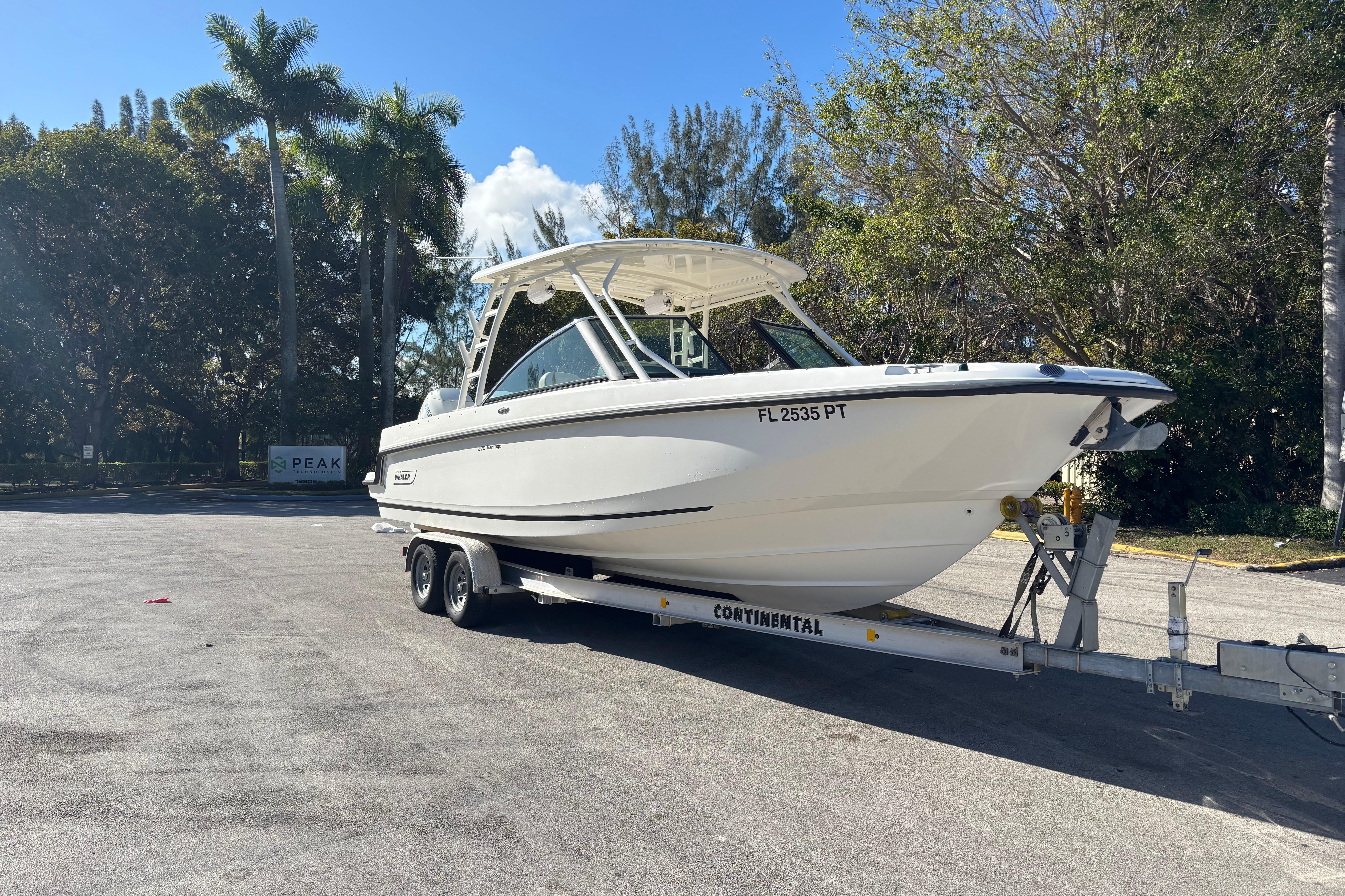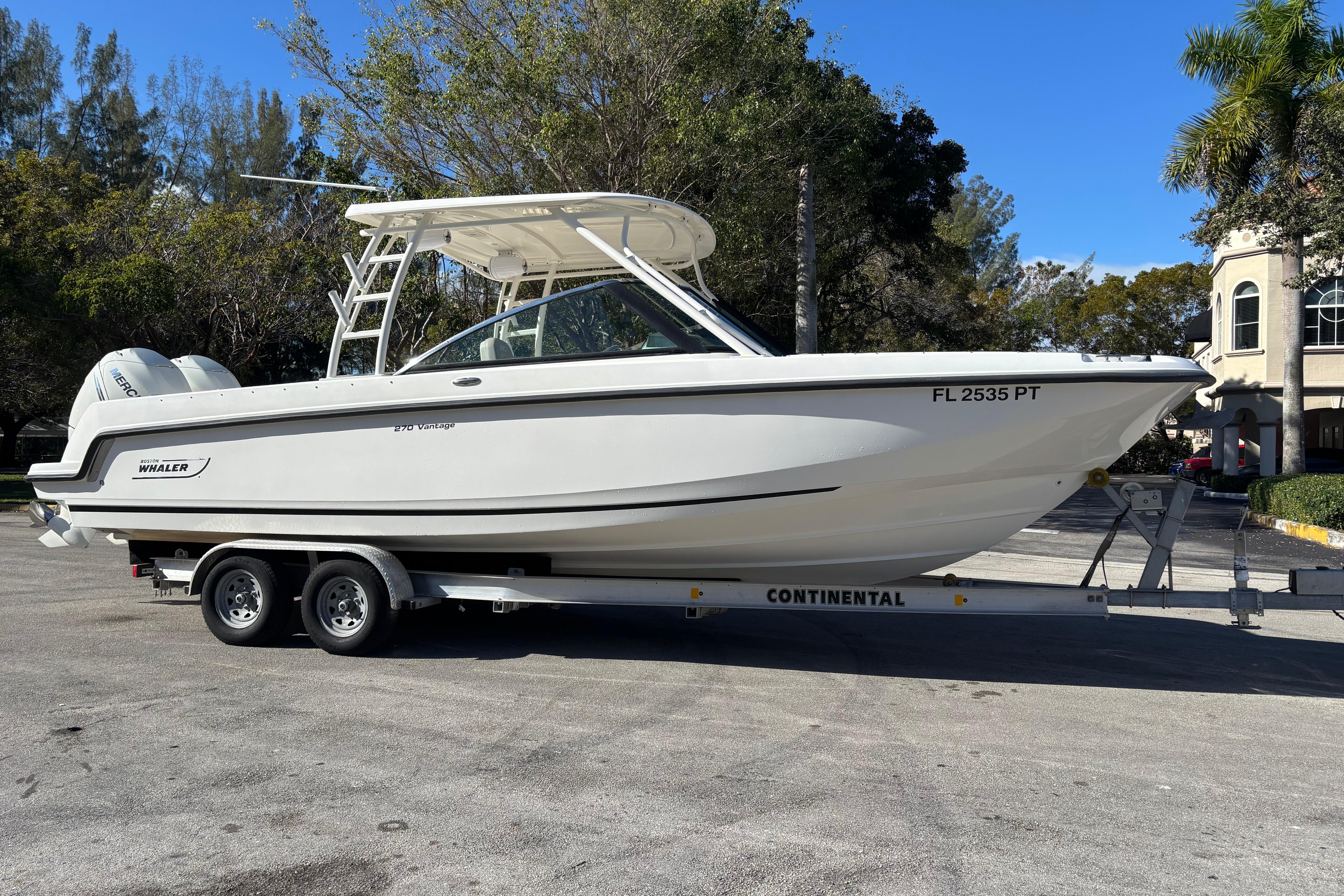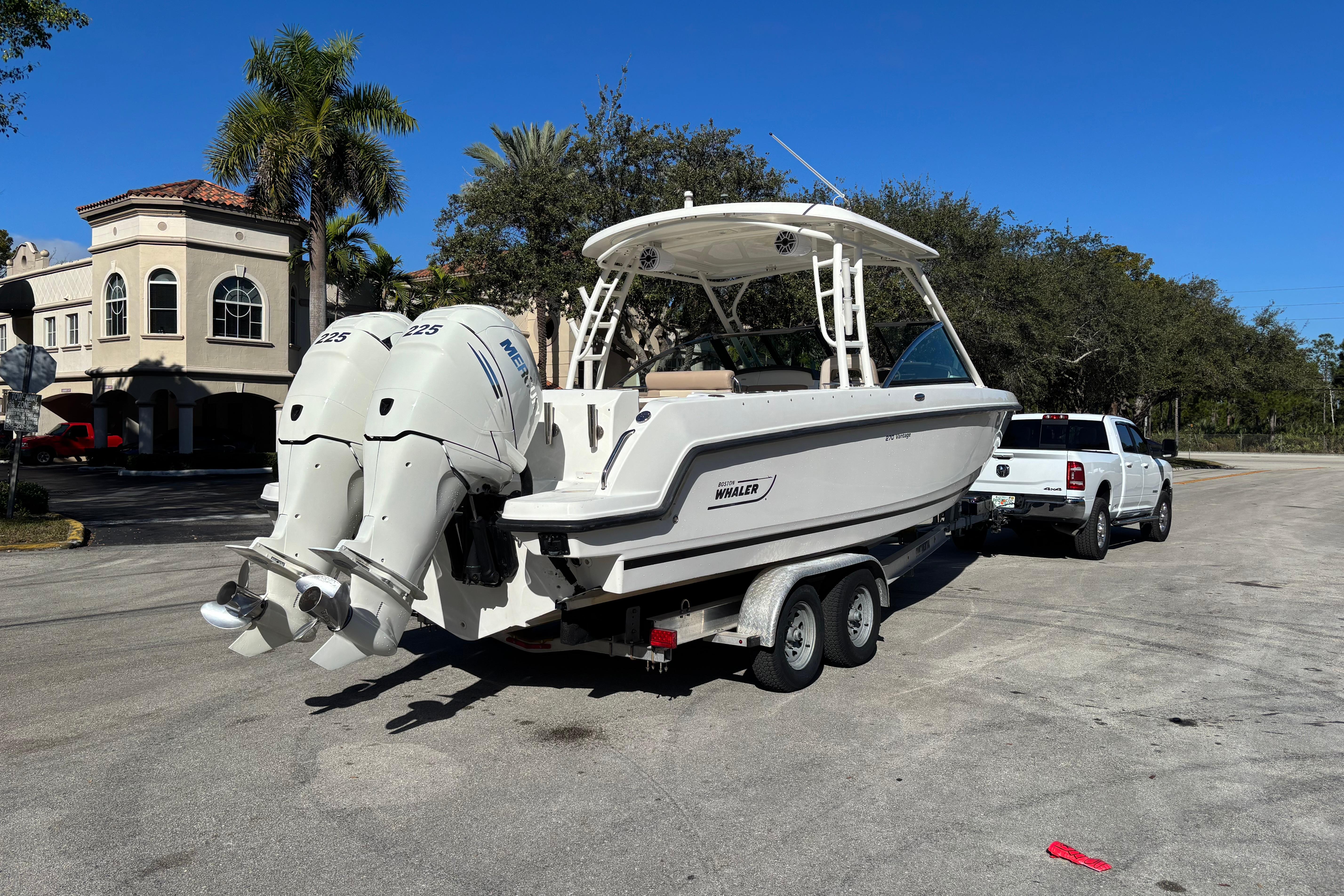This 2014 Boston Whaler 270 Vantage is a versatile, premium dual-console designed to excel at cruising, entertaining, and light offshore use. Powered by twin Mercury 225 EFI FourStroke outboards, the boat delivers smooth, reliable performance with strong mid-range power, efficient cruising, and confident handling in a variety of conditions. A standout feature is the upgraded JL Audio sound system, offering powerful, crystal-clear sound throughout the cockpit and helm. The system is professionally installed and tuned to deliver clean audio even at speed, making it ideal for entertaining or relaxing at anchor. The boat also features recently completed upholstery, giving the interior a fresh, modern appearance. All seating has been refinished in high-quality marine-grade vinyl, enhancing comfort, durability, and overall presentation. Supporting these upgrades is recent electrical wiring work, improving reliability and ensuring clean, efficient power distribution to the audio system, electronics, and onboard accessories. This important update adds long-term value and peace of mind for the next owner. With its spacious dual-console layout, walk-through windshield, ample seating, and legendary Boston Whaler unsinkable construction, this 270 Vantage is a turnkey opportunity for buyers seeking a well-maintained, well-equipped boat ready for immediate enjoyment.