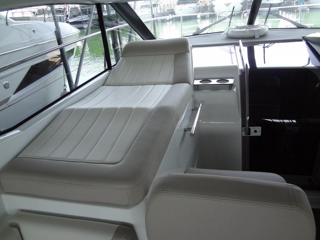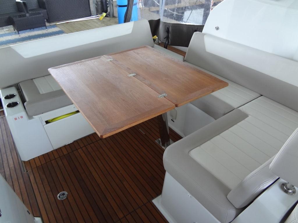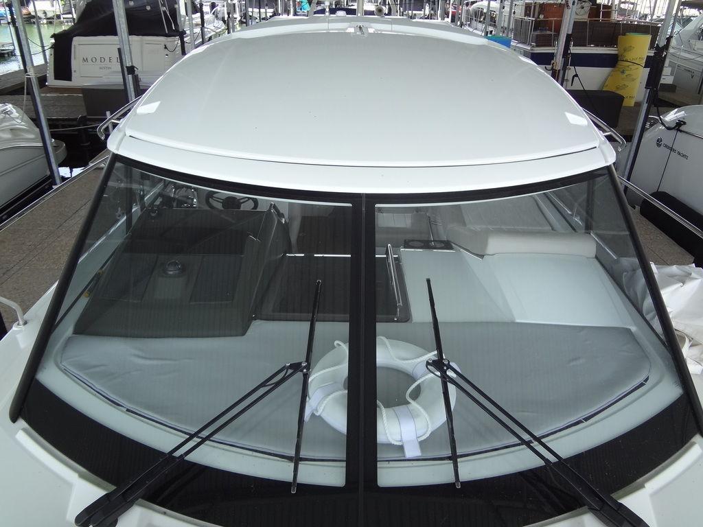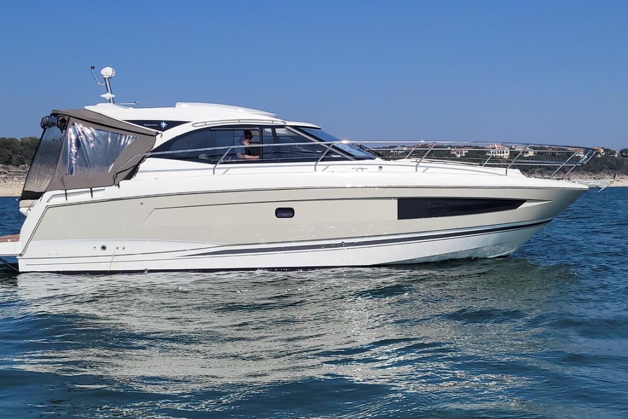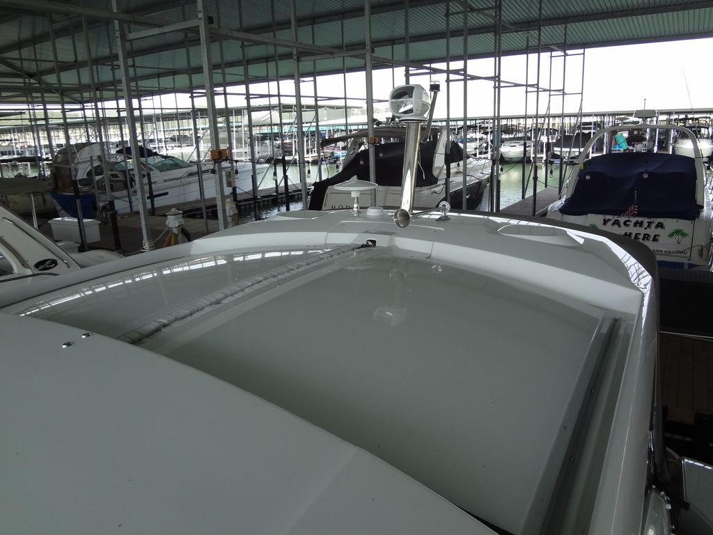 Twin I/O Mercruiser 350 MAG, 300hp. Port: 216hrs Stbd: 217hrs. SmartCraft DTS Axius equipped with joystick docking. Kohler 7.5kw genset with 154 hrs and A/C. Raymarine hybridtouch navigation. Includes full canvas enclosure with retractable hardtop, cockpit teak flooring, folding teak tabletop, motorized engine hatch, dual batteries with house battery bank and charger, fire suppression system, Xtreme engine bay heater, aluminum fuel tank, mini wet bar with sink, Kenyon electric hot plate and mini fridge with freezer well, transom lounge pad with adjustable back rest, Lewmar windlass with remote, windscreen wipers, remote spotlight, bow seating with pop-up back rests. Galley includes step down entry with acrylic sliding door, snap-out carpet, berth bedding with entertainment center and folding tabletop with cup holders, wet bar includes sink, microwave and Kenyon hot plate and AC/DC refrigerator, hot water heater, wet head compartment with shower wand and acrylic folding door, aft sleep with twin bunks and sofa seating. Transferable slip lease with furnished patio conveys at Safe Harbor, Emerald Point Marina on Lake Travis.