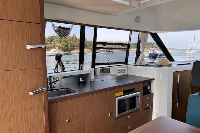 This compact cruiser has a lot of tricks up its sleave. Reinforcing a sense of intimacy and well-being, the new VELASCO 37F is just as elegant as the VELASCO 43F. Inside, every detail has been designed to increase window area, for a bright living space with magnificent 360° views. A side door, recessed side decks, an open cockpit sheltered by the flybridge, double doors and a large platform… nothing beats open-air living. True to the original concept, the flybridge offers three incomparable living spaces. Sundecks and a spacious swim platform enhance comfort on deck.