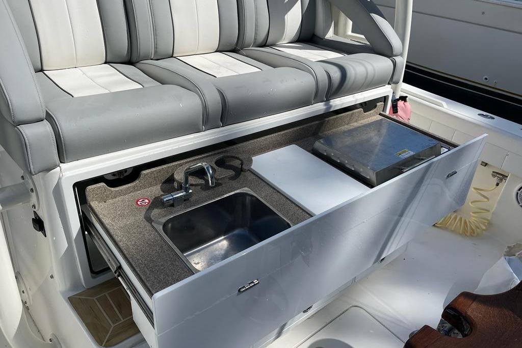 • 6X Deluxe Helm Seating with Mezzanine Seating and Prep Area with Countertop, Electric Grill, Sink, Drawers, and Tackle and Tray Storage Compartments.
