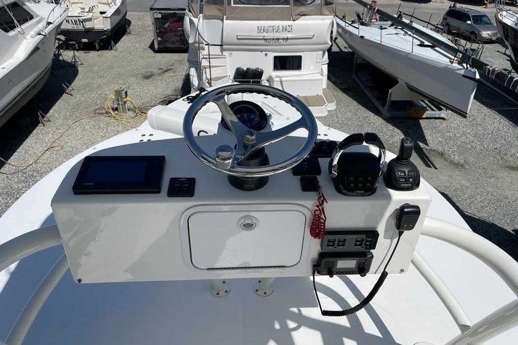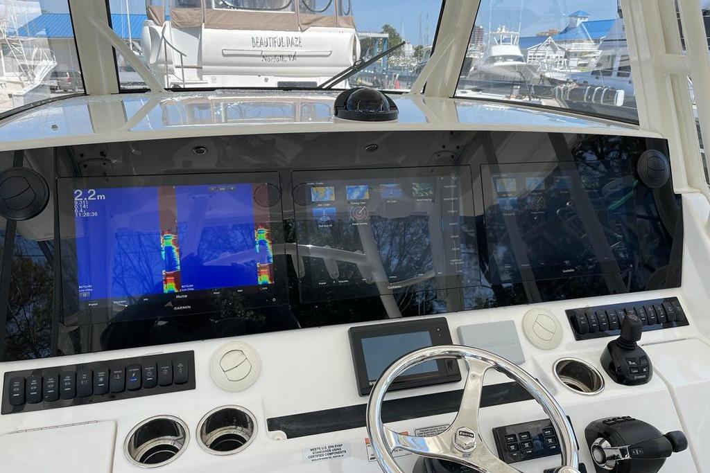 • Three 17″ Gpsmap® 8617 Multi-Touch Widescreen Chartplotter/Sonar Displays, VHF 210 AIS Radio with 8′ Digital VHF Antenna, GMR 624 xHD2 6kW Open-Array Radar, Airmar® B275LHW Broadband 1kW Chirp Transducer, and Autopilot Reactortm Steer-by-Wire. Plus Black Flushmount Electronics Face and Mic Relocation Kit.