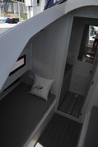 The boat also boasts a number of practical features, including an automatic cabin door, an automatic table on the bow that can be converted into a sunbed, and aft sunbeds. For even more convenience, you can add a deck ice maker, cooler, and grill. The T-top provides shade and protection from the elements.