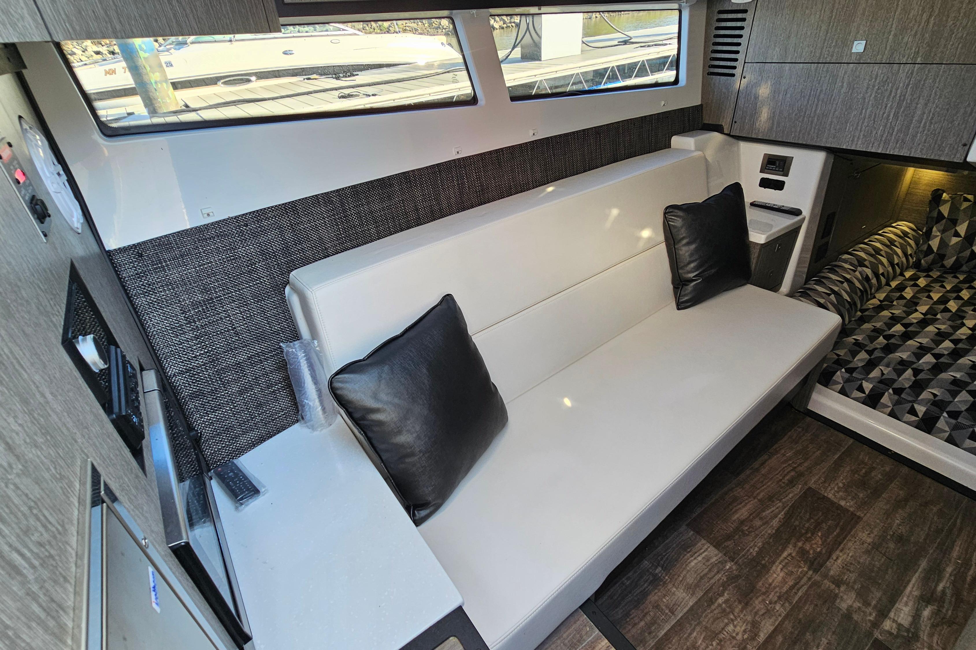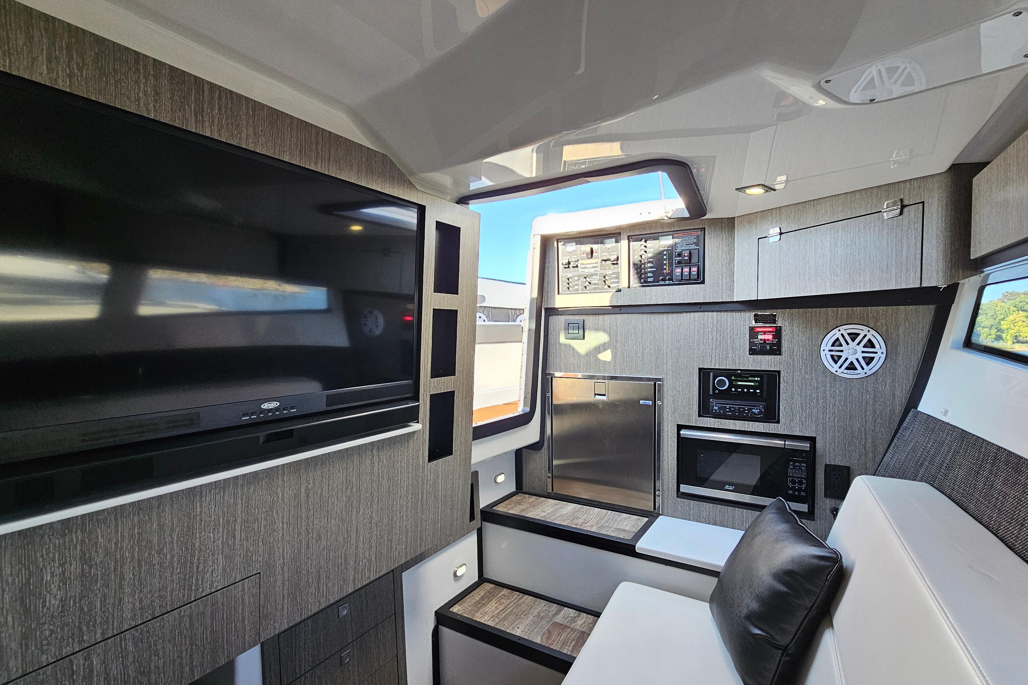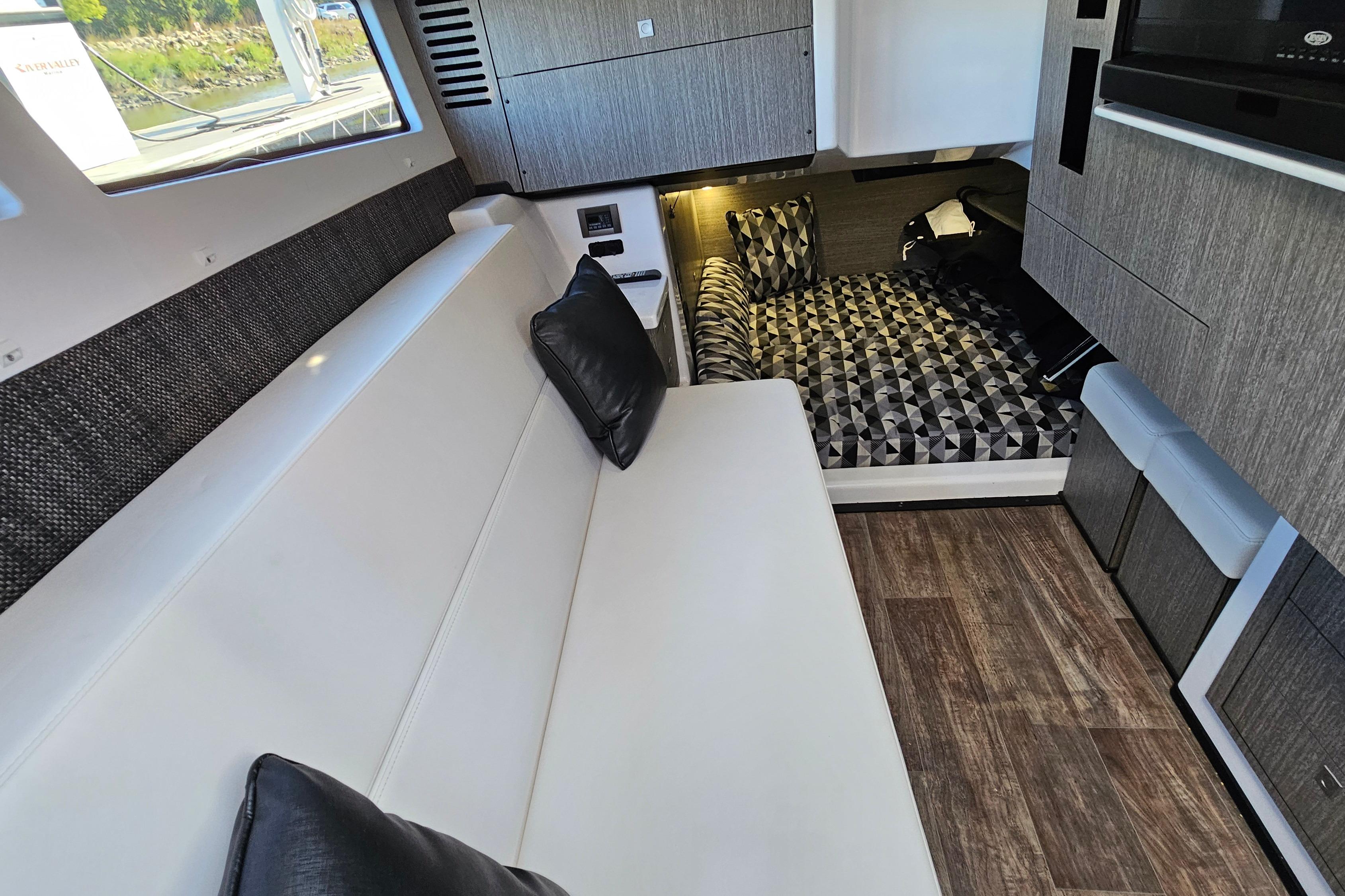 So part of what makes the 378 SS More then just a Day Boat is the Overnight Capabilities in a Open Bow, Monterey has done an amazing job using the space wisely. To the Port Side is a Wonderful Day head with nice head room and shower capabilities, fully fiberglass lined with elegant fit and finish! To the STBT Side (Under the Helm) is the Sizable Cabin featuring a Sofa with TV & Pull Out Foot Rest, the Sofa can be pulled out for additional sleeping and the Mid Cabin Berth is roomy with it’s own 22″ Flat-screen TV/DVD. The Cabin is Air Conditioned and the boat has a Westerbeke Generator if away from the dock, a Microwave & Refrigerator conveniently located inside the Cabin to really finish the need of a overnight stay!