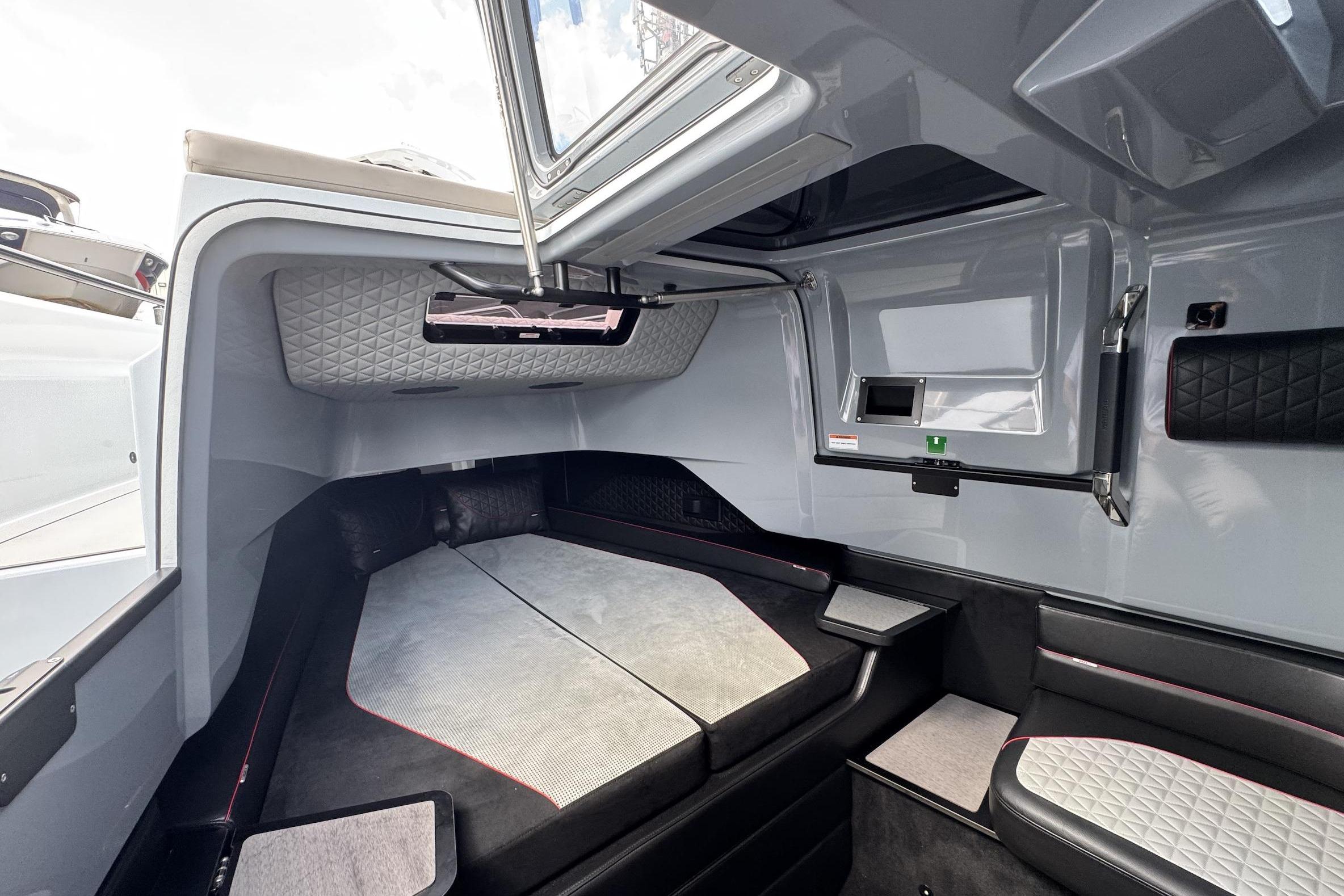 Luxurious Comfort: Gull-wing doors, an integrated electric flush toilet in a separated head, a freshwater system with a sink in the fore cabin, and a shower on the aft deck provide all the comforts of home. Relax in the fully enclosed cabin with lockable gullwing doors or enjoy the sun on the foredeck, which is configured as a sunbed. The fully enclosed canopy with a separate red sprayhood offers protection from the elements.