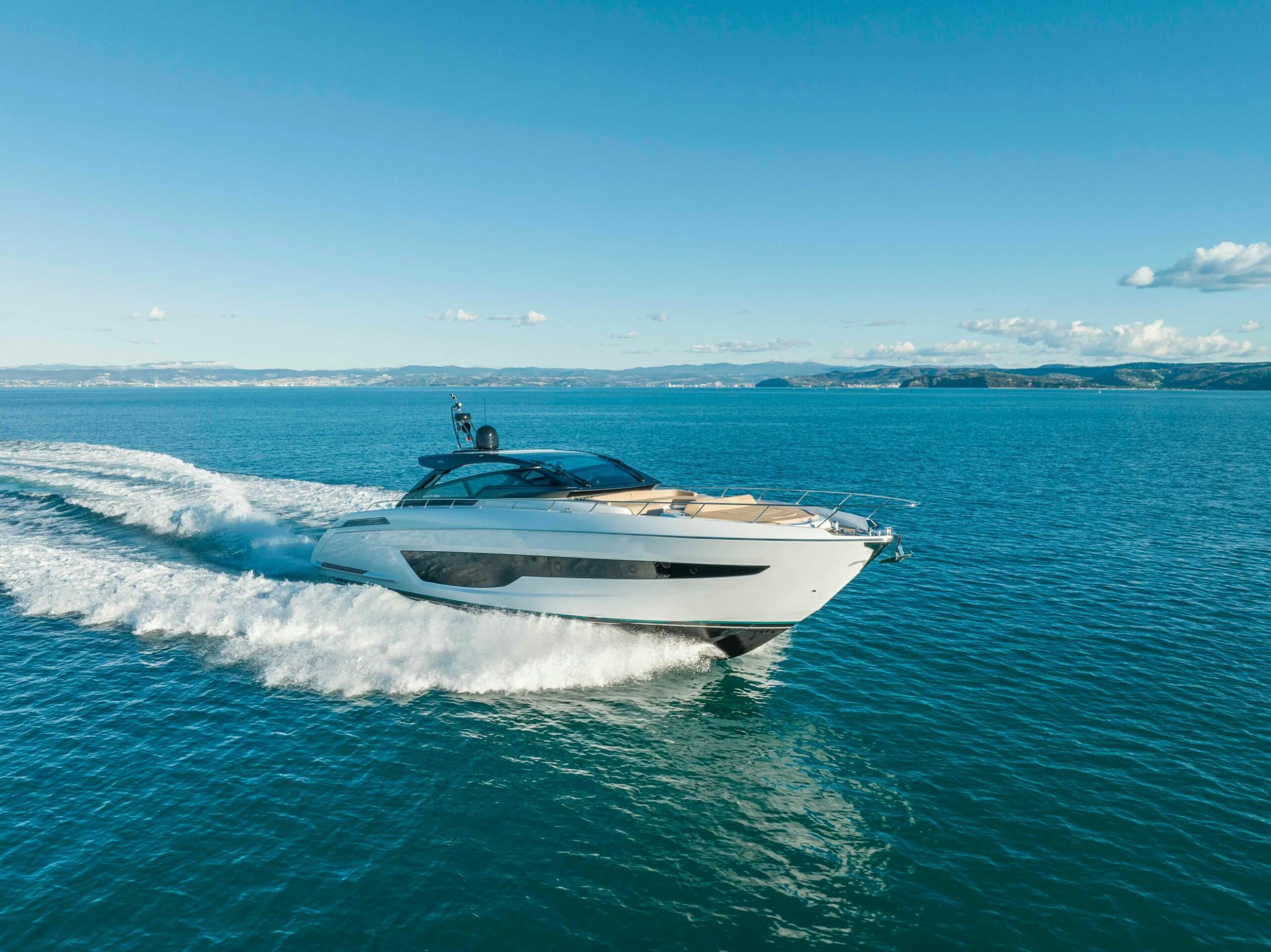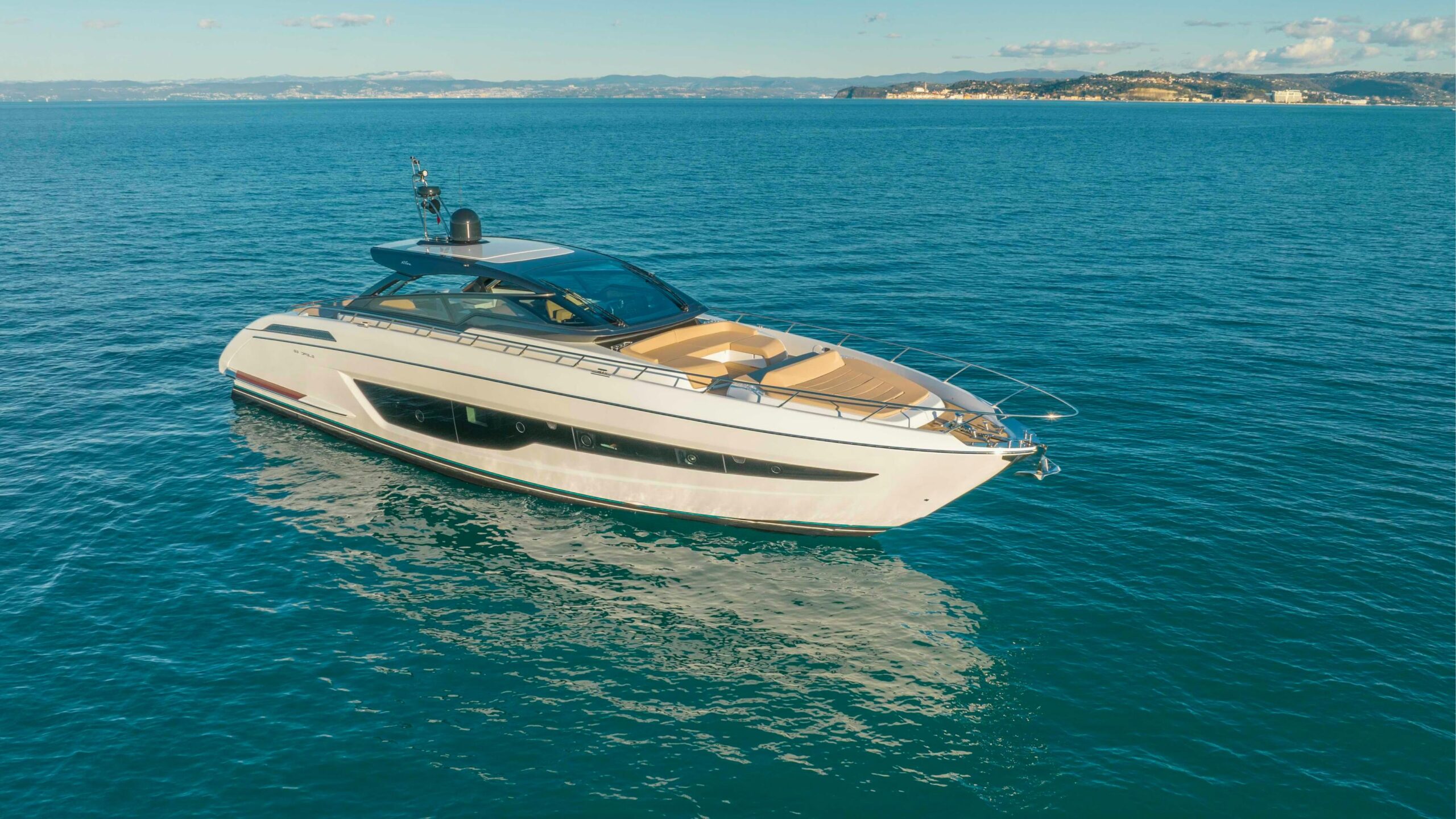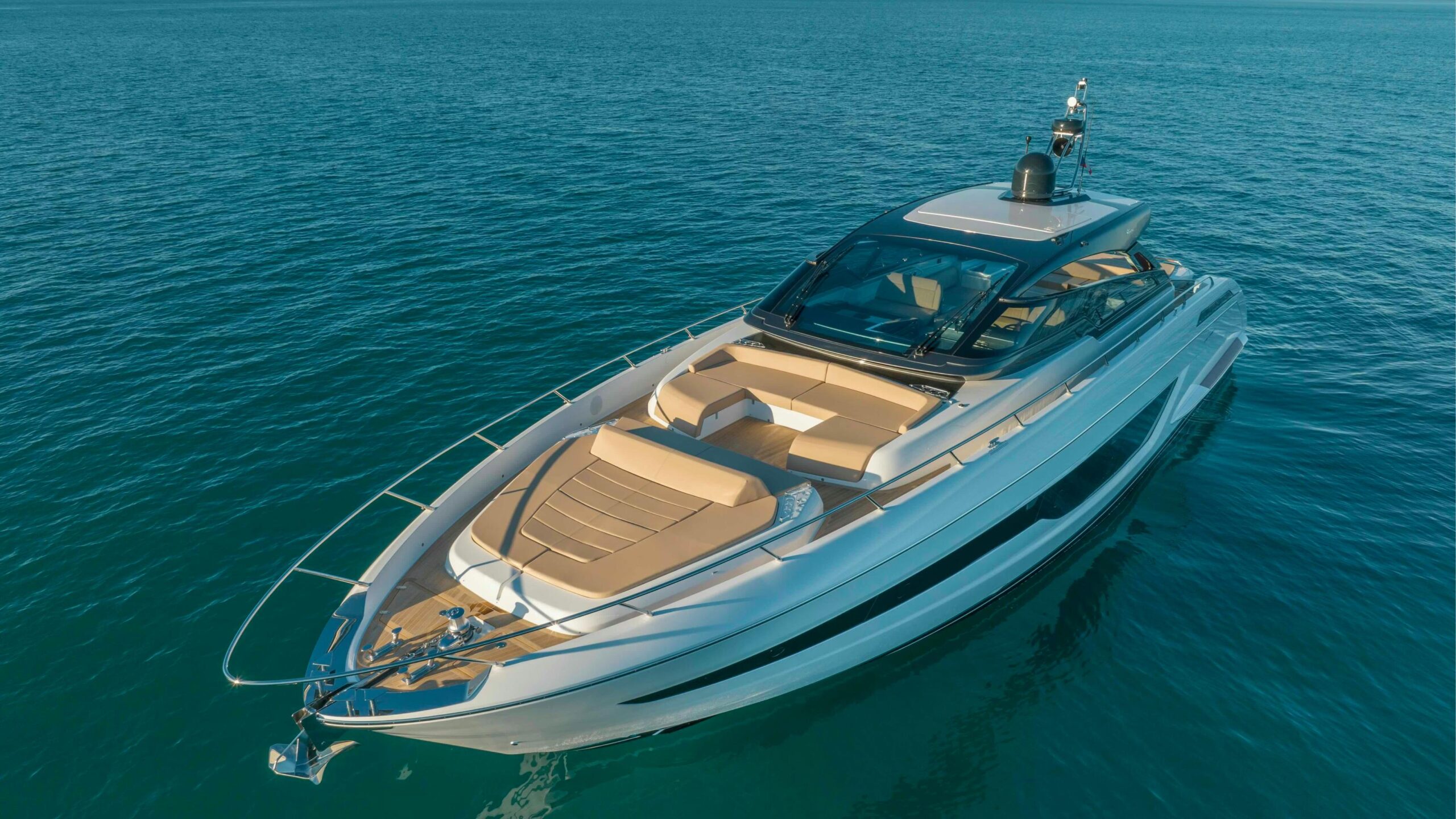 Sporty Italian Design & Expansive Exterior Spaces — Sleek, head-turning profile with iconic sporty lines, a distinctive white hull, large sunpads, dual lounging areas, and a carbon-fiber hardtop with sunroof for luxurious outdoor enjoyment.