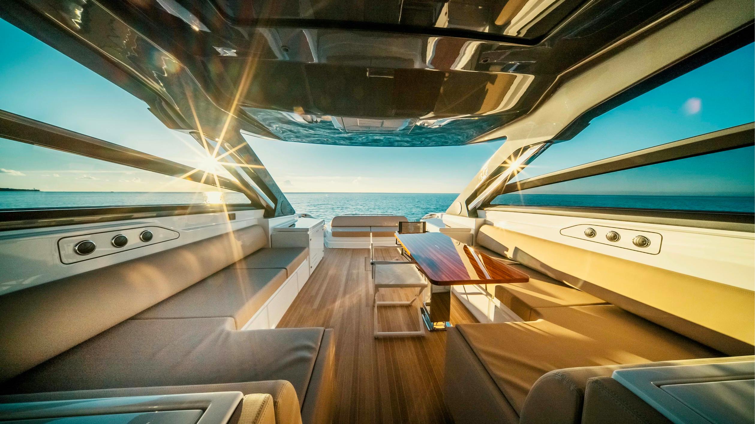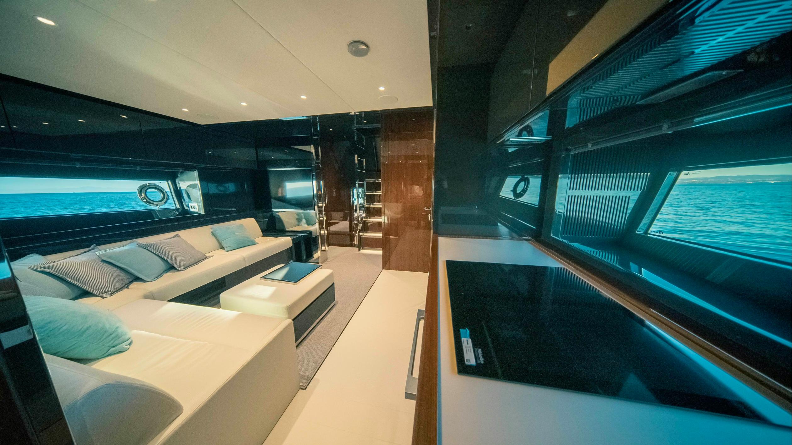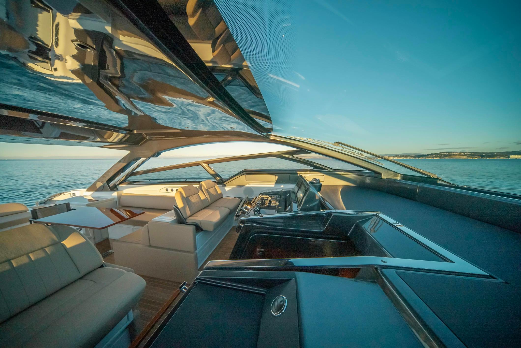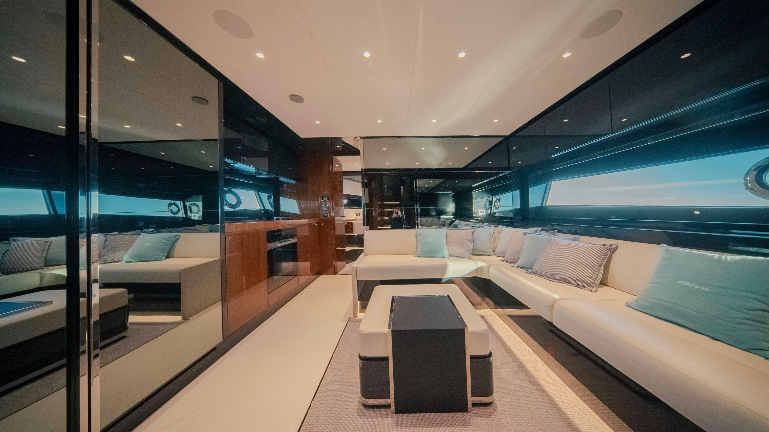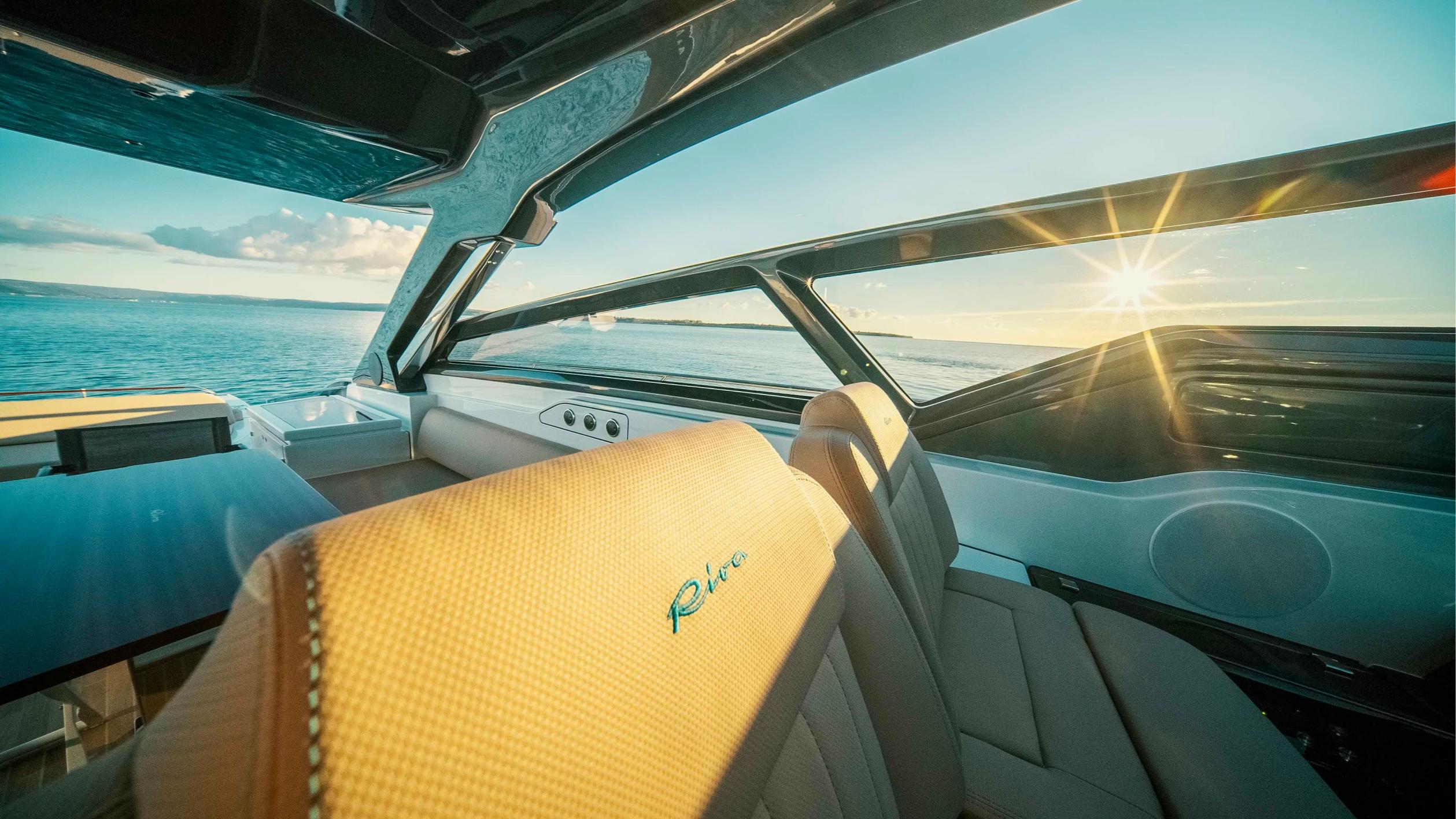 Luxury Finishes & Premium Amenities — Glossy mahogany interior, ambient lighting, electric curtains, premium entertainment systems, and bespoke upholstery with Riva turquoise stitching elevate onboard comfort and style.