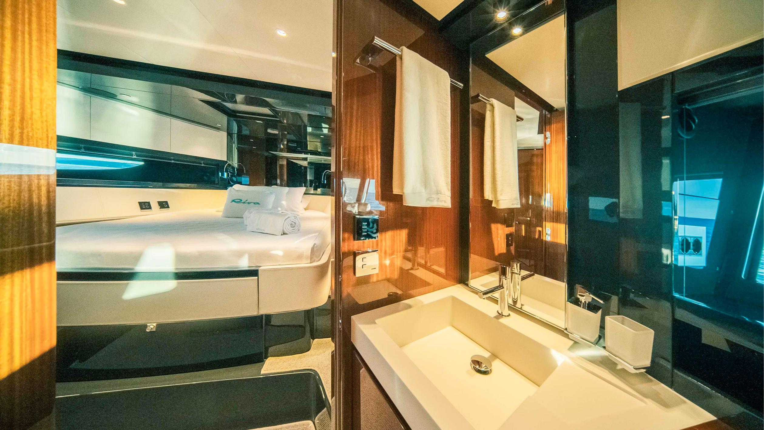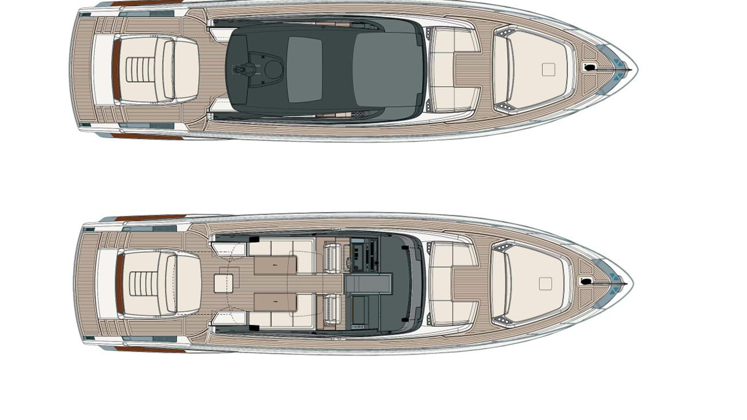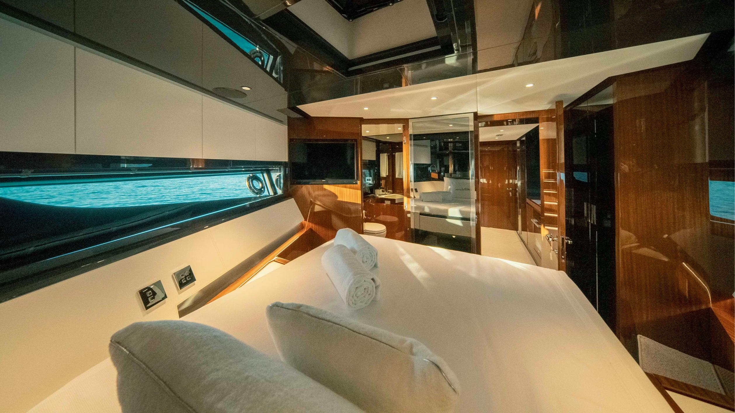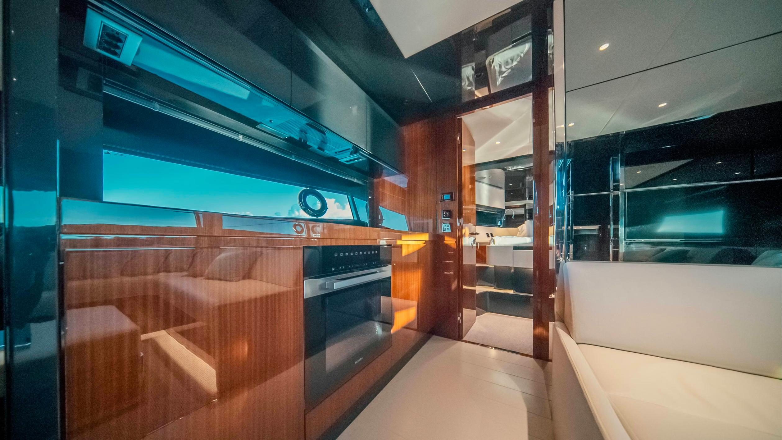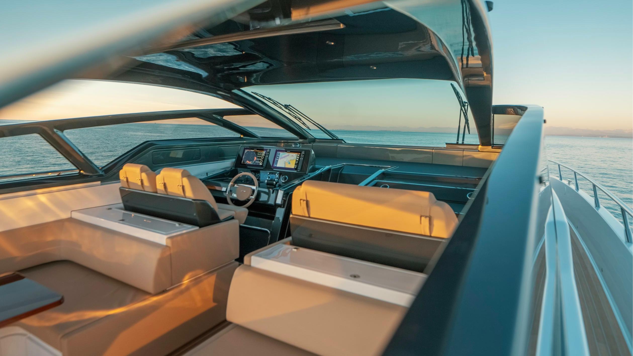 Luxury Finishes & Premium Amenities — Glossy mahogany interior, ambient lighting, electric curtains, premium entertainment systems, and bespoke upholstery with Riva turquoise stitching elevate onboard comfort and style.