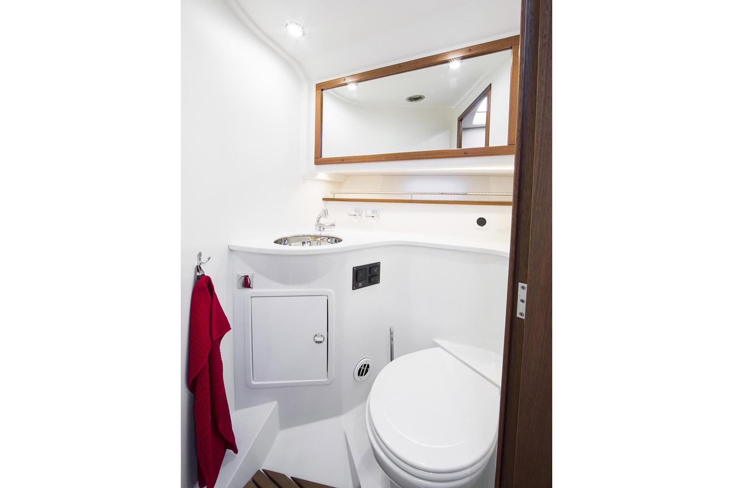 The boat has many similarities to her smaller sisters but offers several new features. The Nimbus Design Team has added several interesting aesthetic and functionally integrated details. These include twin touch screens at the helm, room for five to ride facing forward, a new D-pillar with integrated ventilation, fully glazed aft deck door, electric powered table on the aft deck and a “granny hatch” that conceals a main power plug on the stern. Other innovations include newly designed engine room ventilation in the hull sides with powered extractors, galley with ceramic gas hob and dark composite worktop, 120-liter capacity fridge plus extra cool storage in pull-out drawers beneath the salon sofa and much more.