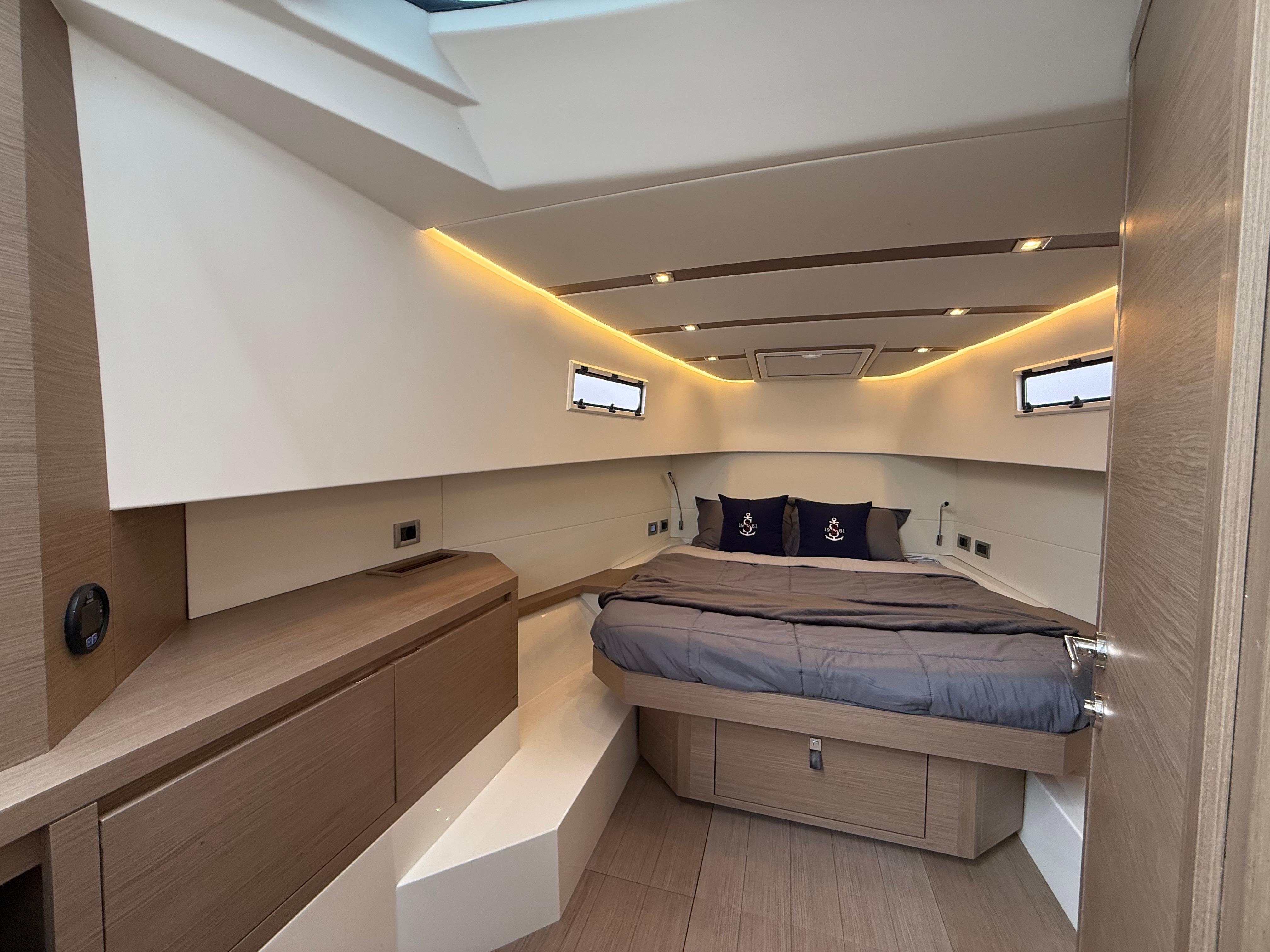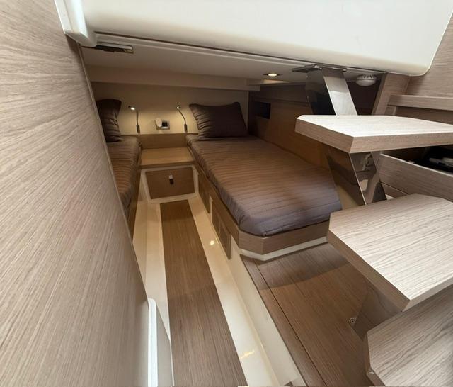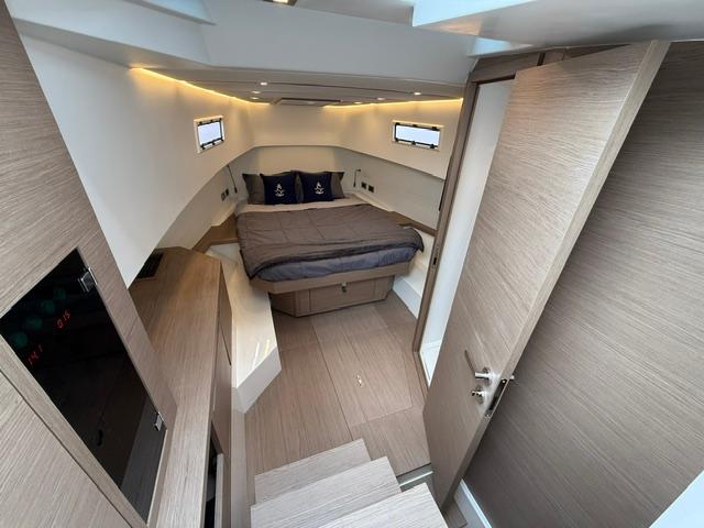 The interior can be configurated with two different layouts: standard layout includes one cabin with a double bed and a separate shower/head area. As another option, the Pardo 38 offers a second cabin with two single beds. Its bright and spacious interior volume, generous heights and excellent natural ventilation, allows Pardo 38 to reach perfect space distribution for a 38-footer.