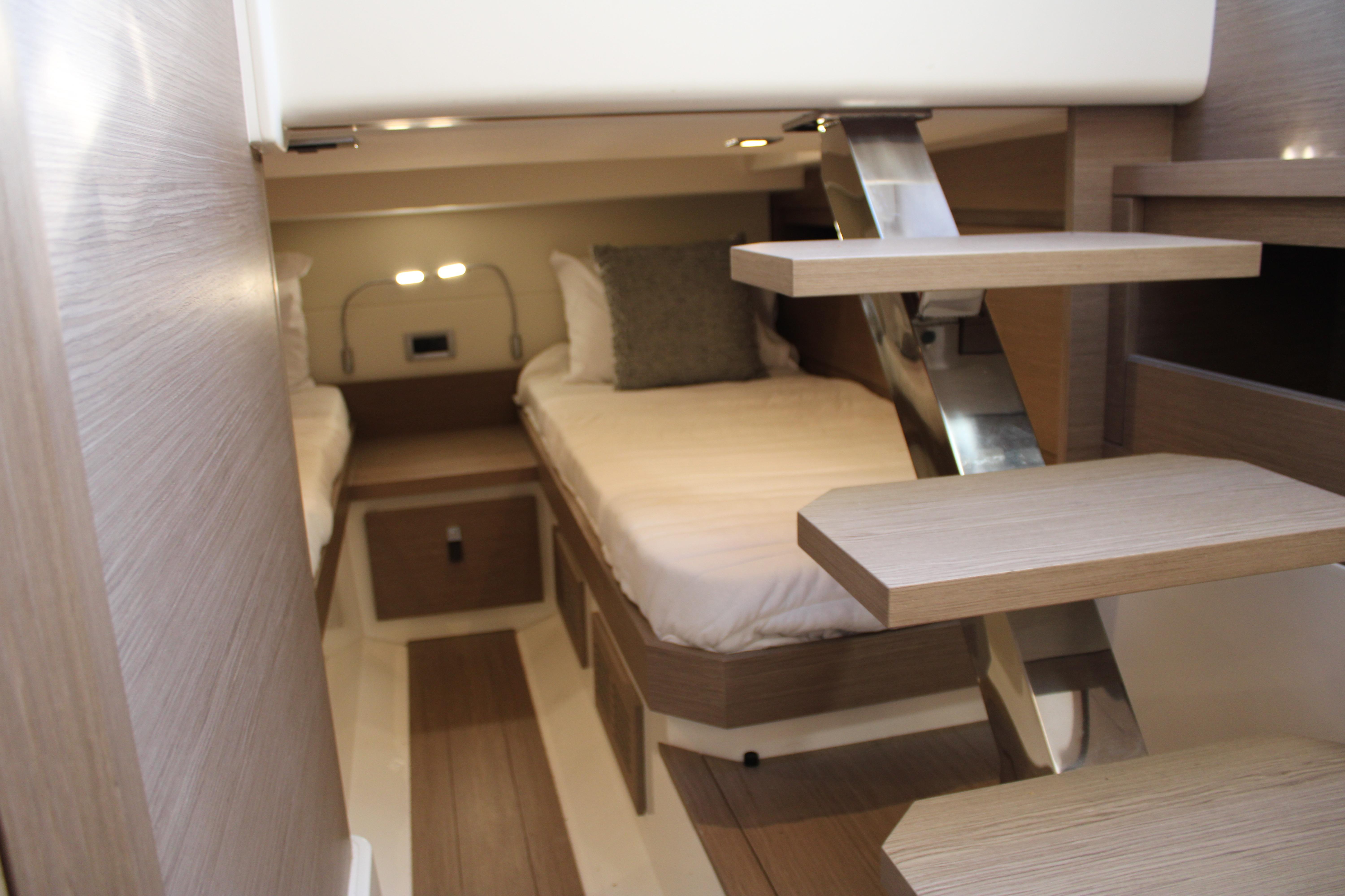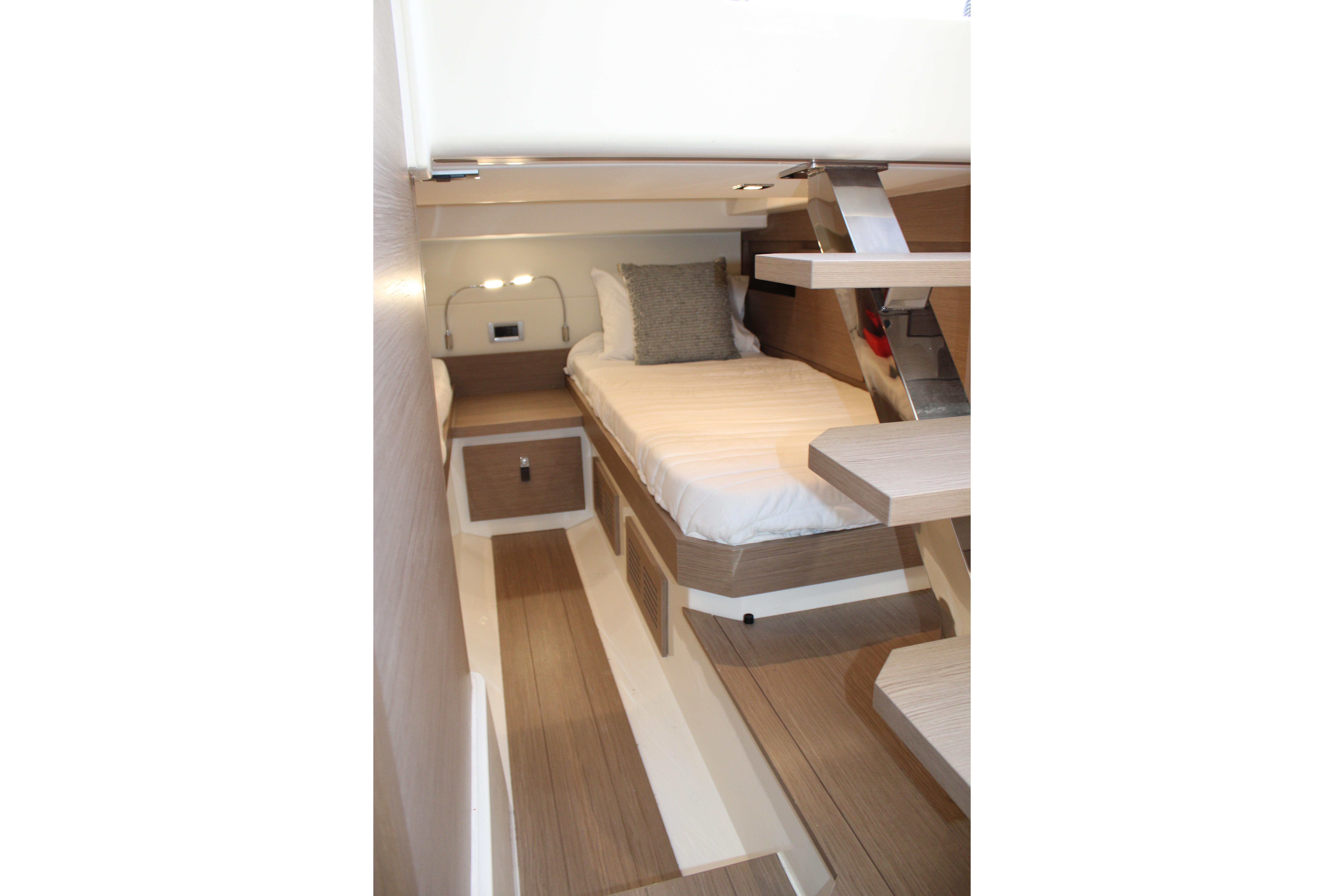 The lounging areas are located both at the bow with a large and comfortable sunbathing area for three people, and at the stern with two settees and a foldable table allowing the space for six. The linearity and refinement of the furnishings are enhanced by the careful choice of the woods and the attention to details that make the interiors of the Pardo 38 true excellence.