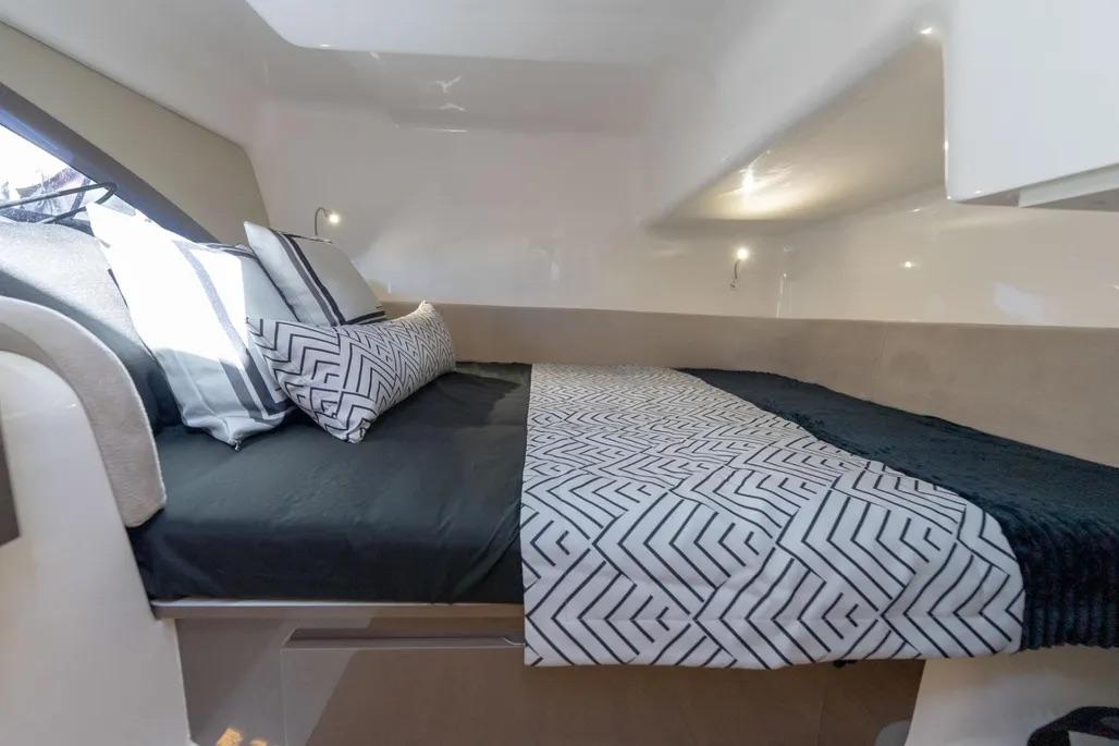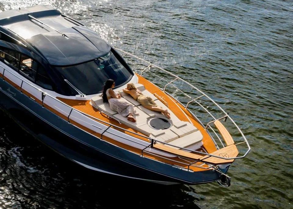 Below deck, three cabins and two heads sleep six, with A/C, a watermaker, and full galley options extending your time aboard. With generous tankage, a choice of tops and deck shades, and a 5-year hull warranty, the 415 Outboard is engineered for family cruising and weekend escapes, finished to your spec.