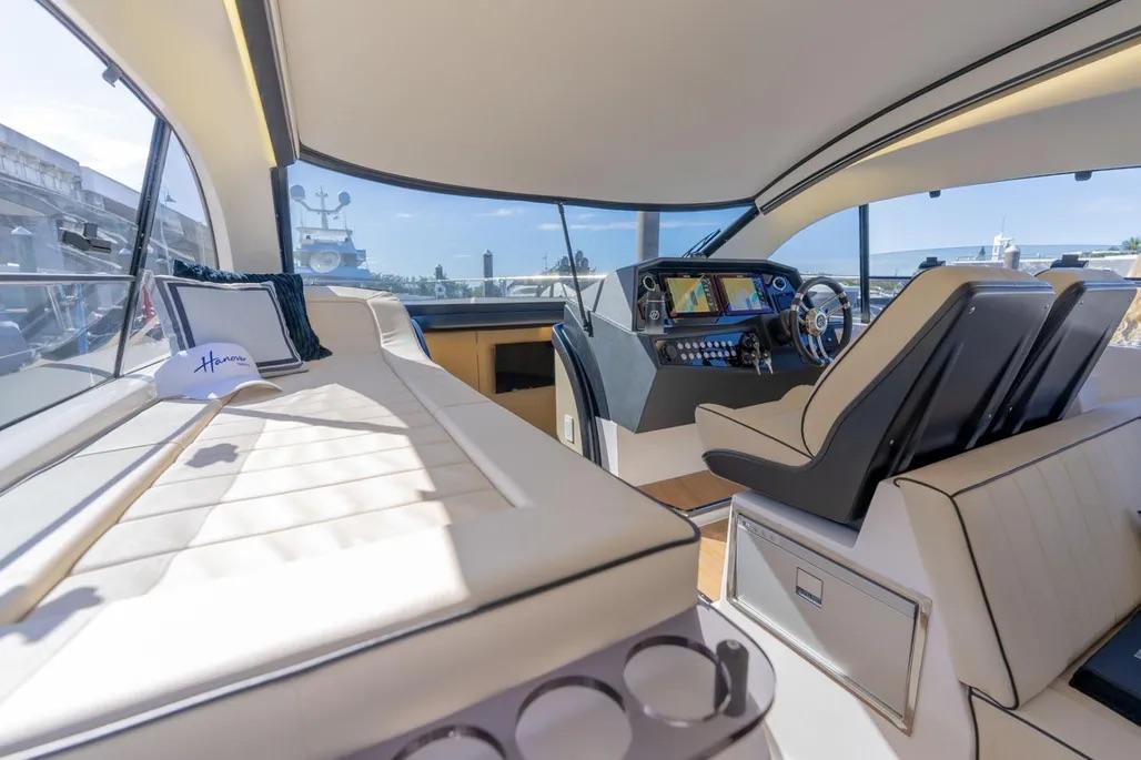 All additional info Base spec (indicative): Modified V-hull · LOA 43 ft · Beam 12 ft 2 in · Draft 2 ft 7 in · Deadrise 17° · Dry weight 20,547 lb · Cruise 25 mph · Top 40 mph · Fuel 315 gal · Water 118 gal · Holding 20 gal · Sleeps 6 in 3 cabins · 2 heads · Max 14 persons · 5-year hull warranty · Designed & built by Hanover Yachts