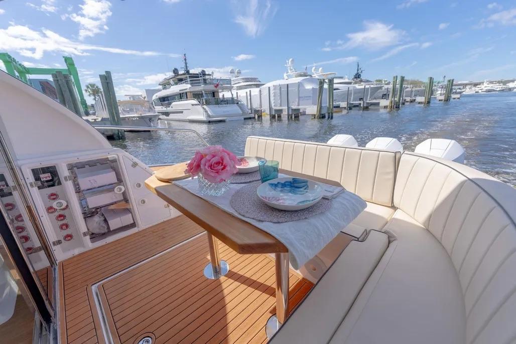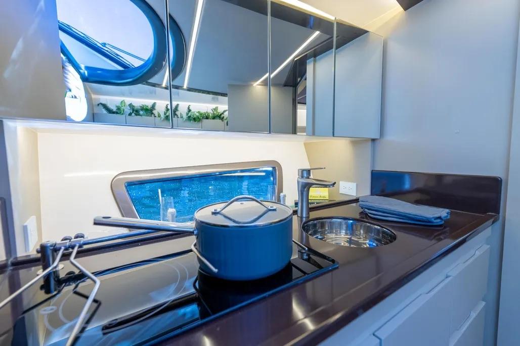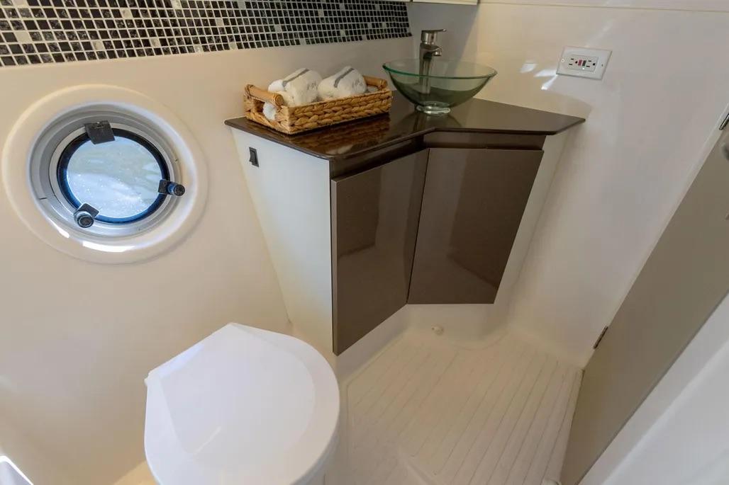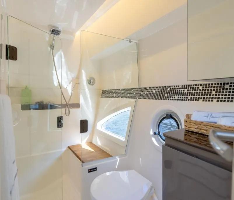 Additional equipment/features Popular add-ons: Bimini & hard top · Cockpit cover · Generator & inverter · Shore-power inlet · A/C · Battery charger · Electric bilge pump · Fresh-water maker · Marine head · Microwave & refrigerator · Cockpit cushions · Hydraulic bathing platform · Radar reflector · Solar panel · Swimming ladder · Teak cockpit