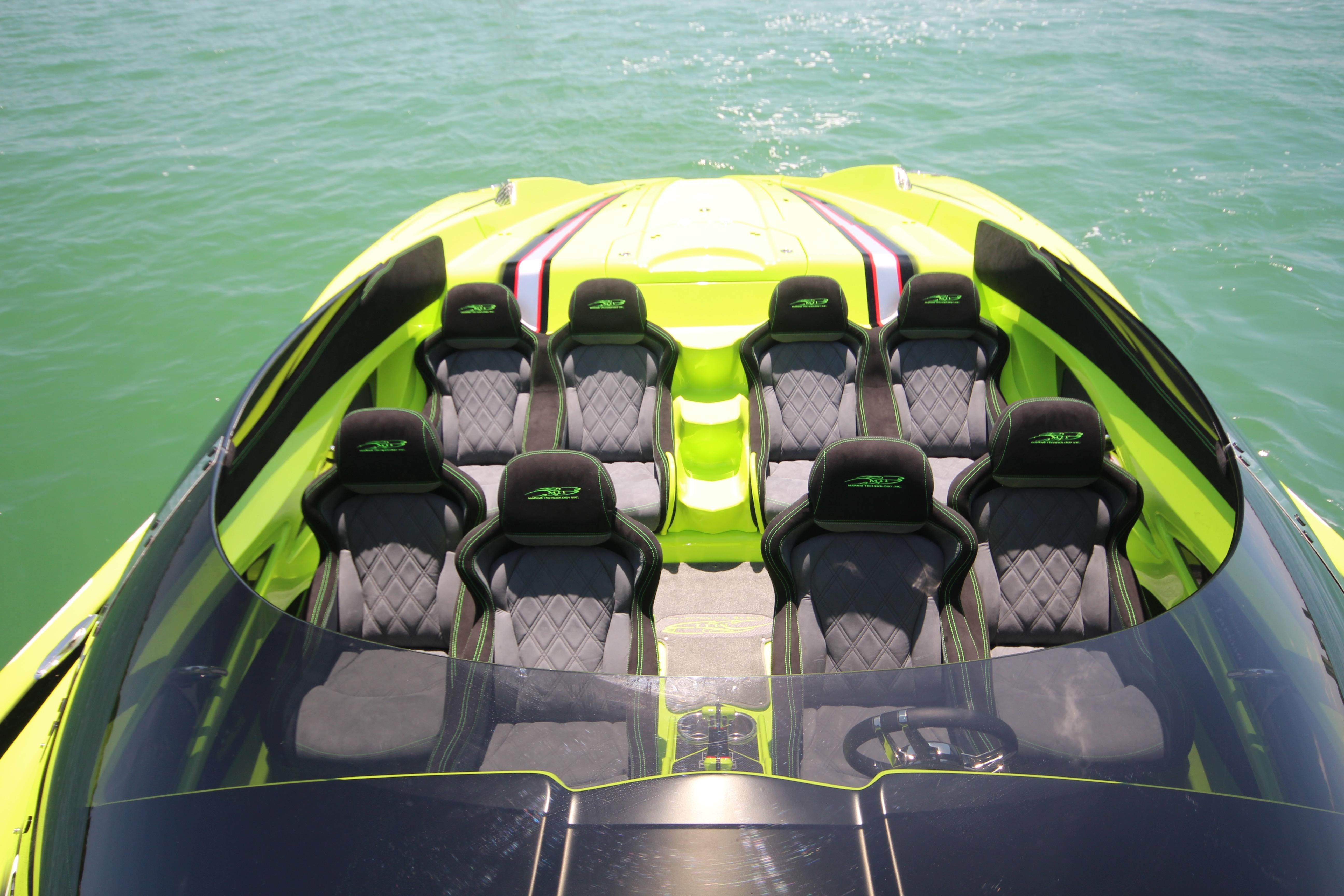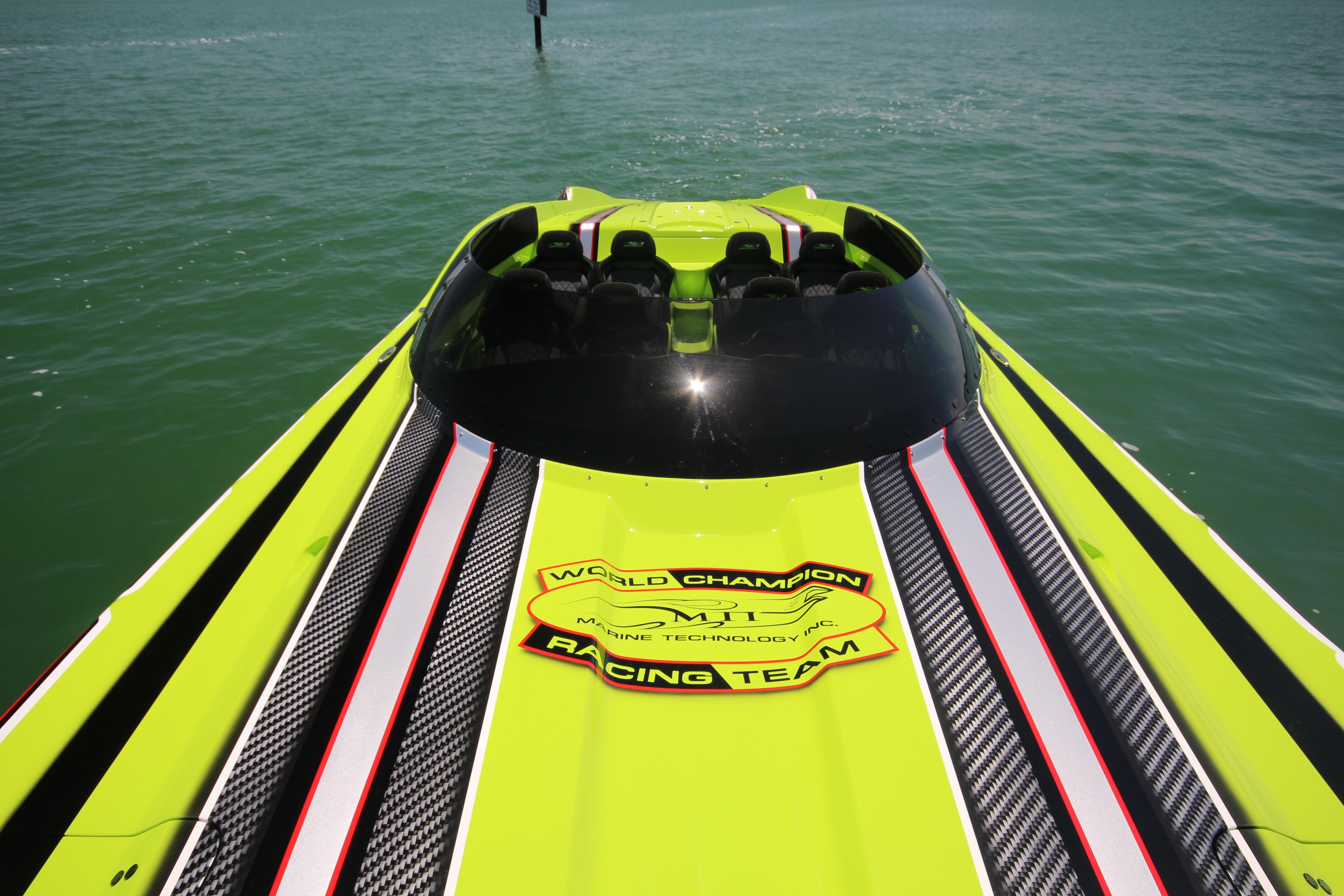 The MTI 48 is now available in a CE/EC approved model for European markets. The green boat in the photos has passed all CE qualifications and is powered by CE approved Mercury Racing 1100s for performance and reliability.