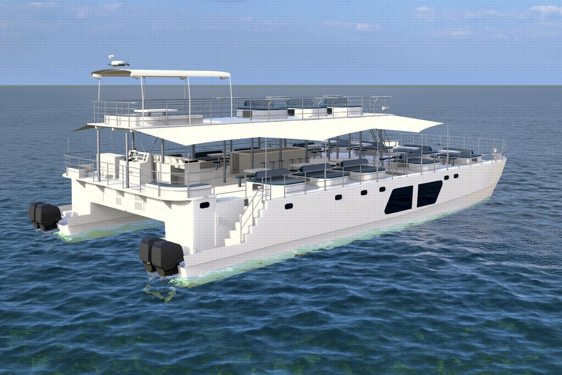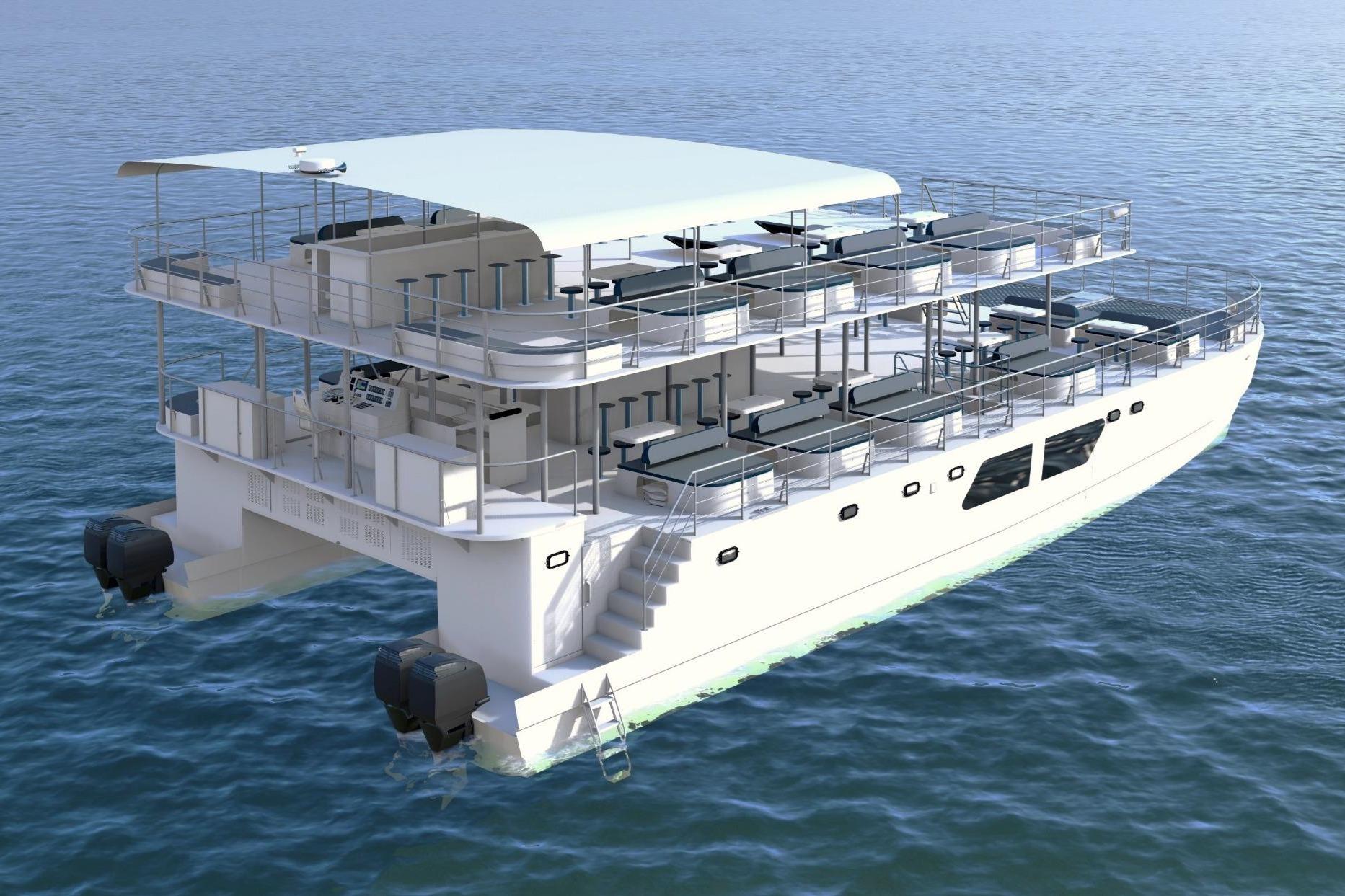 This is a 180pax commercial passenger vessel powered by quad outboards that can be diesel or gasoline.