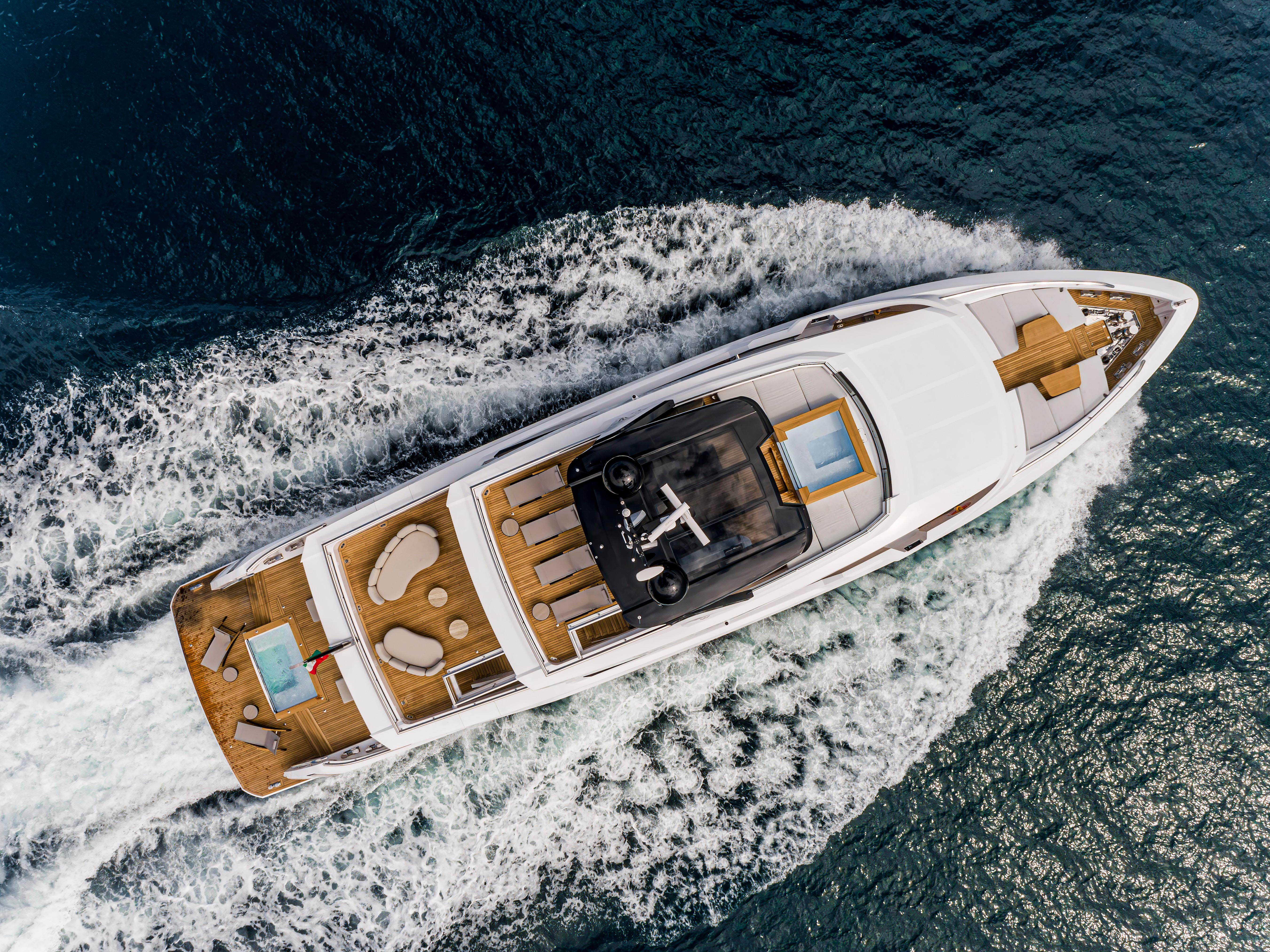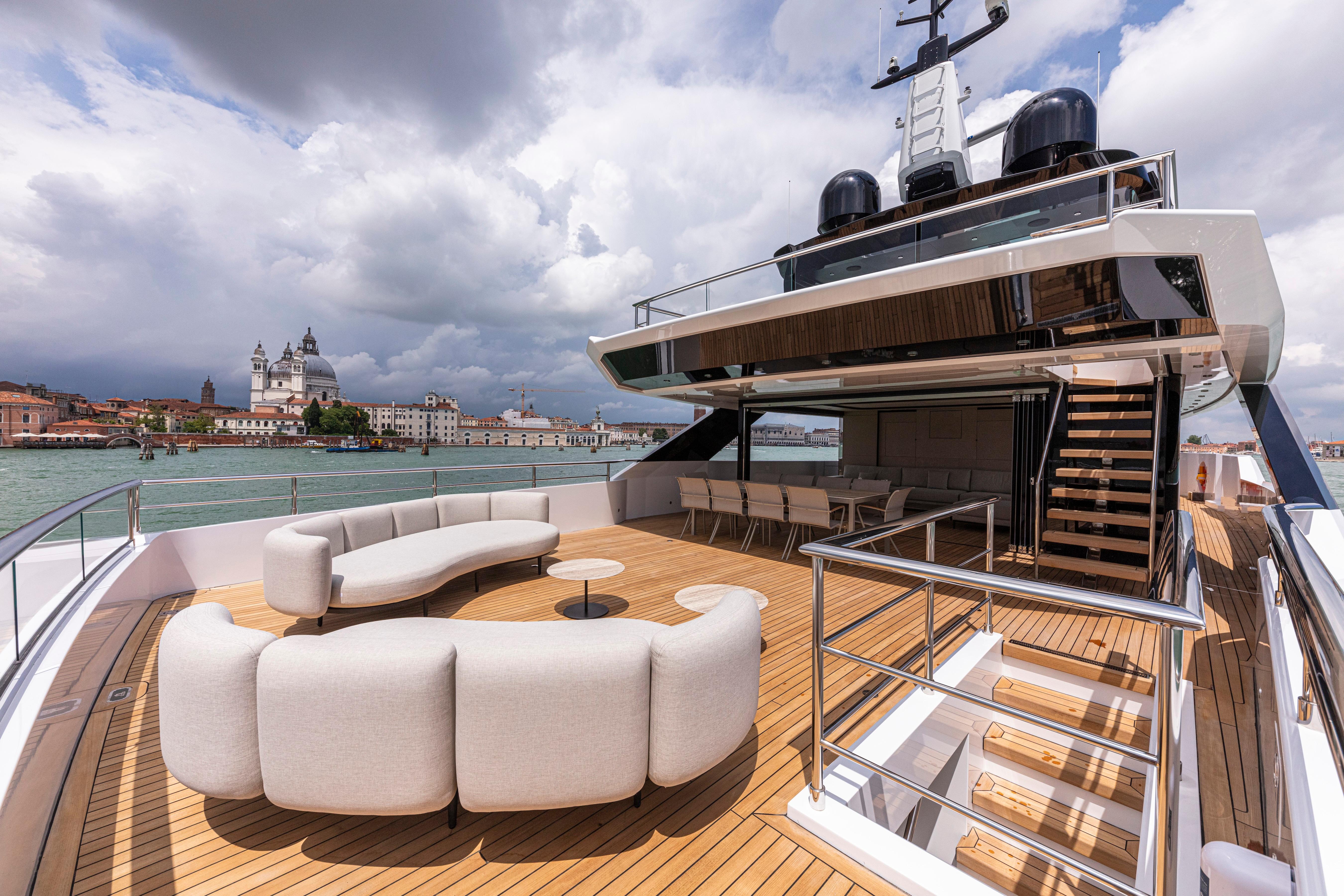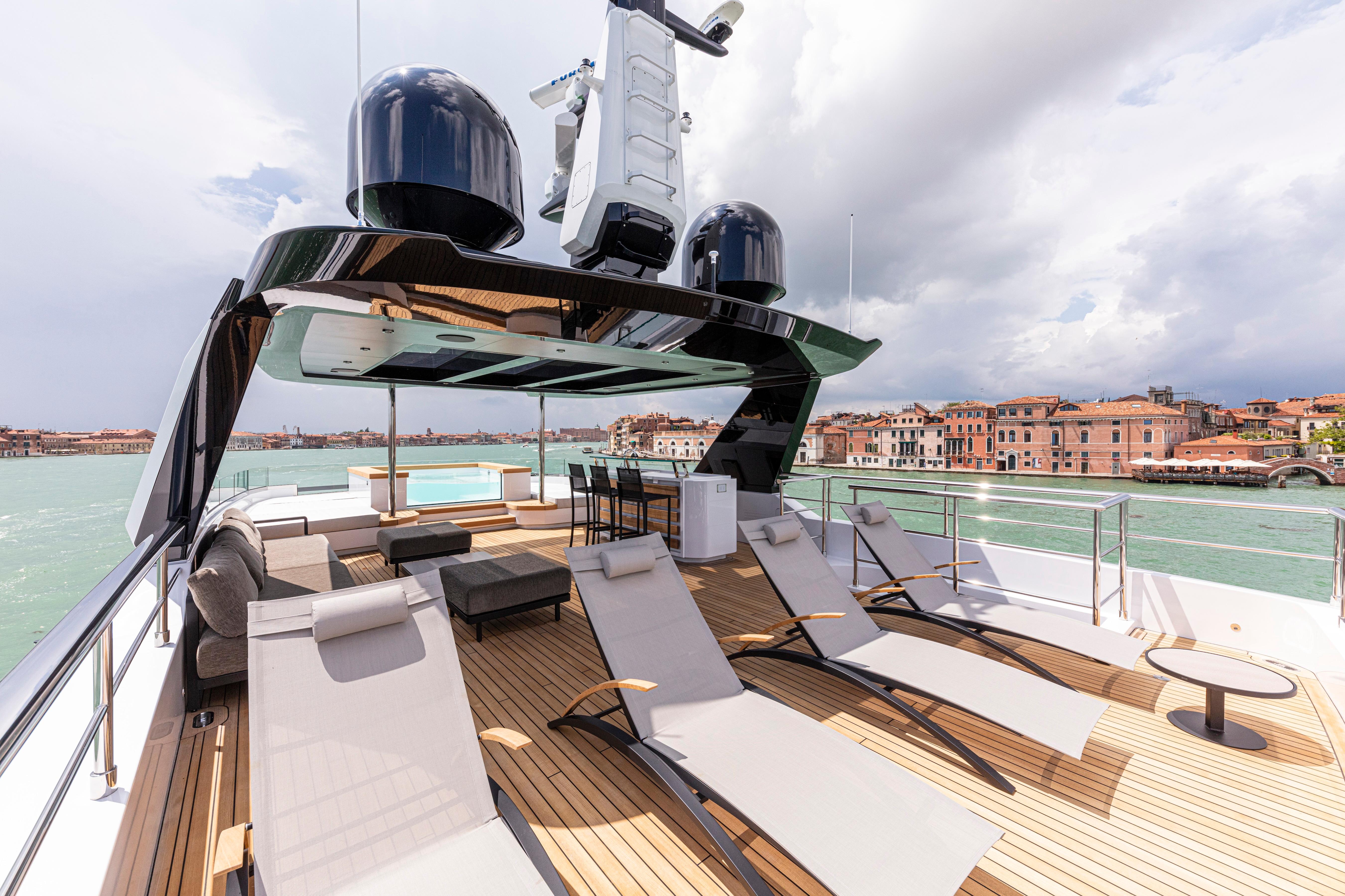The sun deck on the Ducale 120 offers a serene escape, perfect for private parties or unwinding in absolute tranquility.