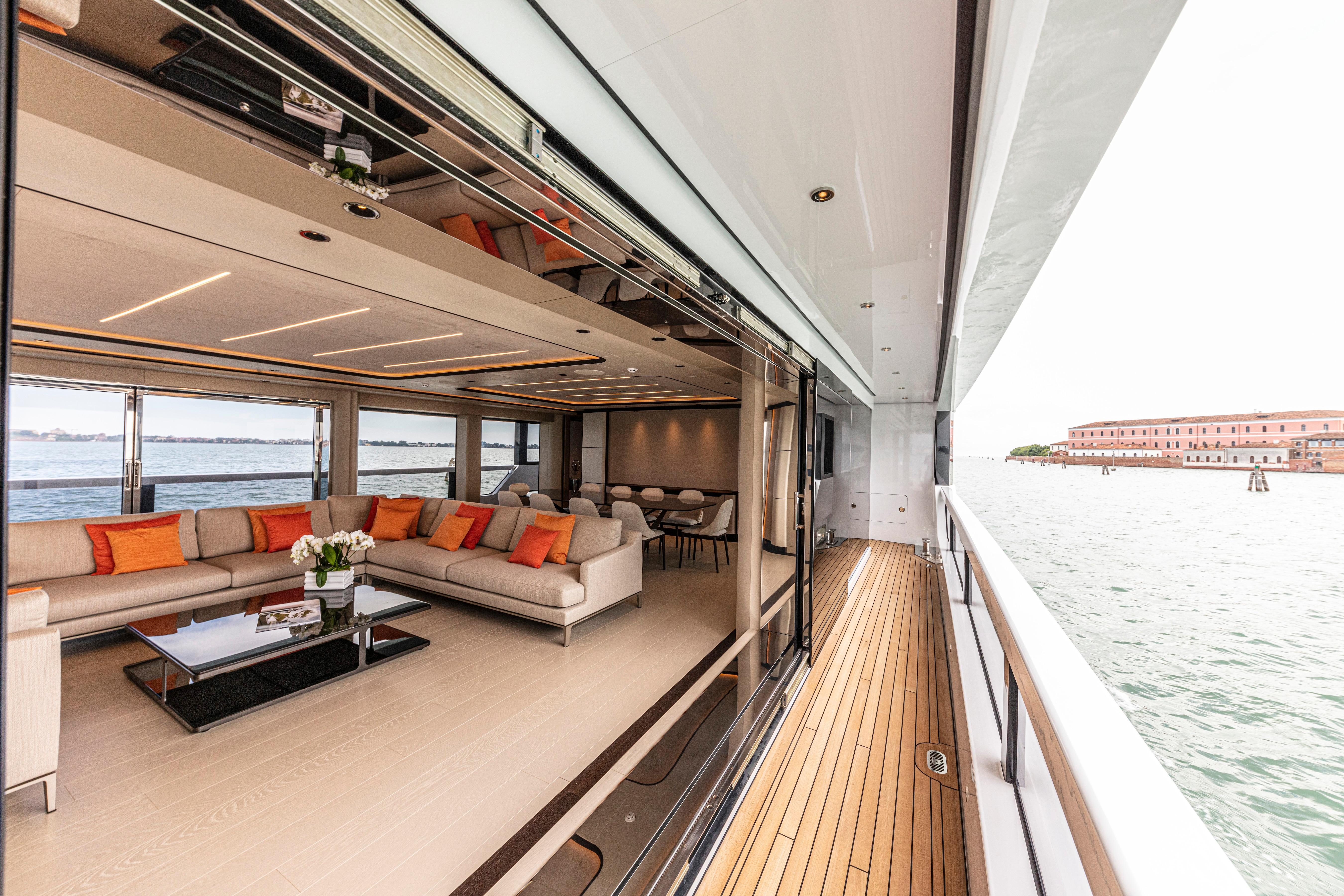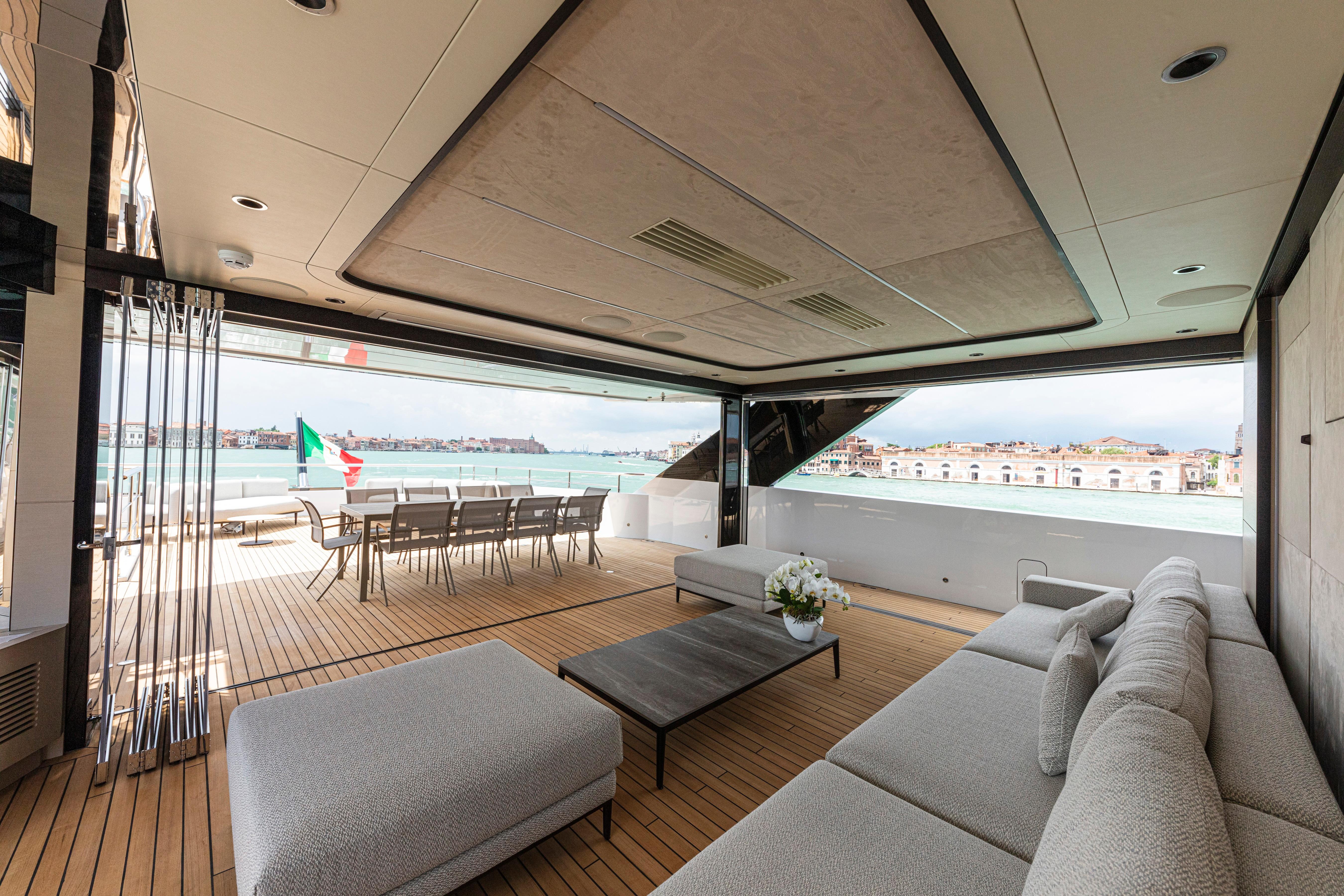 In the upper deck, the interior and exterior area are blended masterfully thanks to opening sliding glass doors.