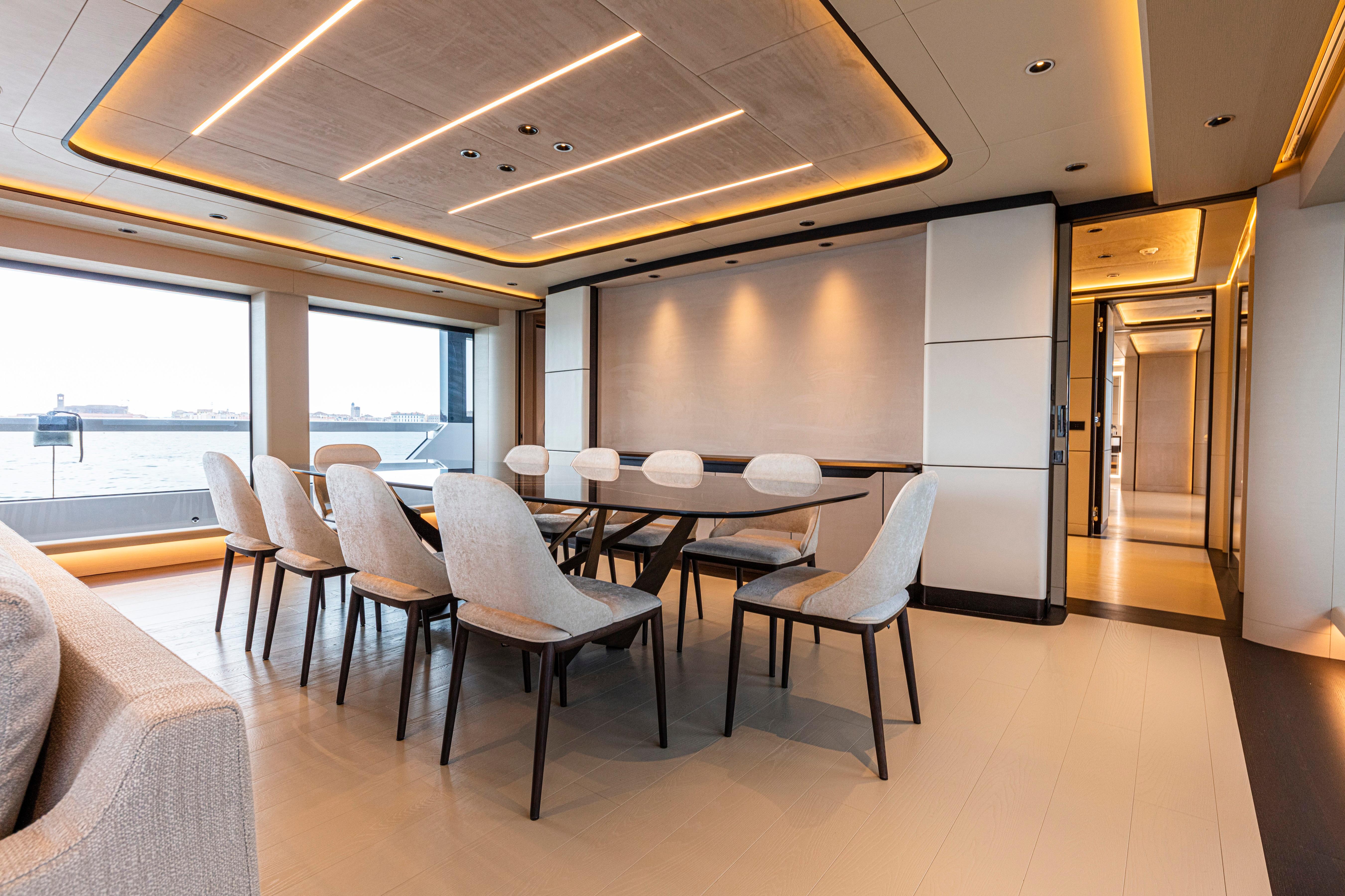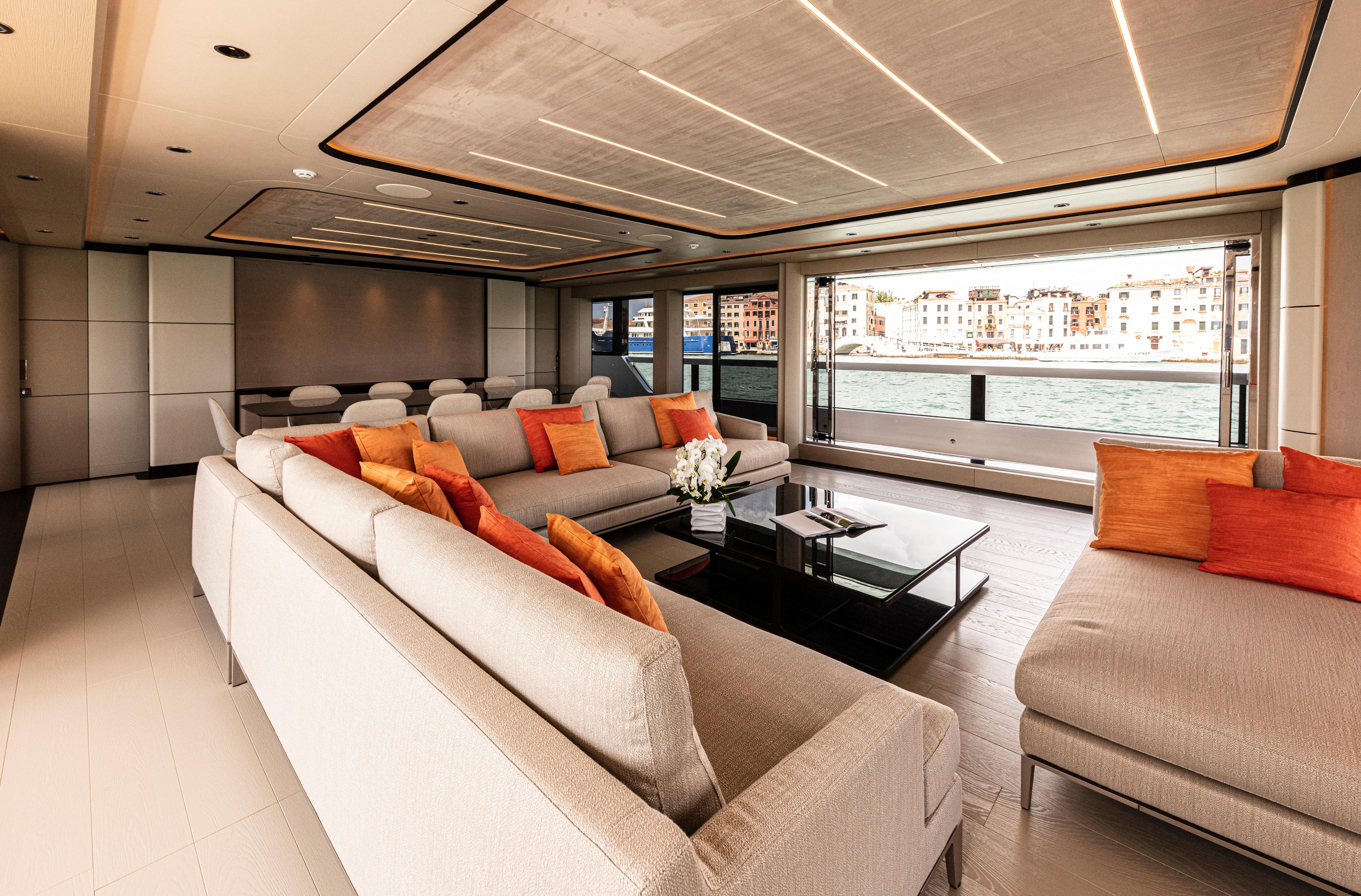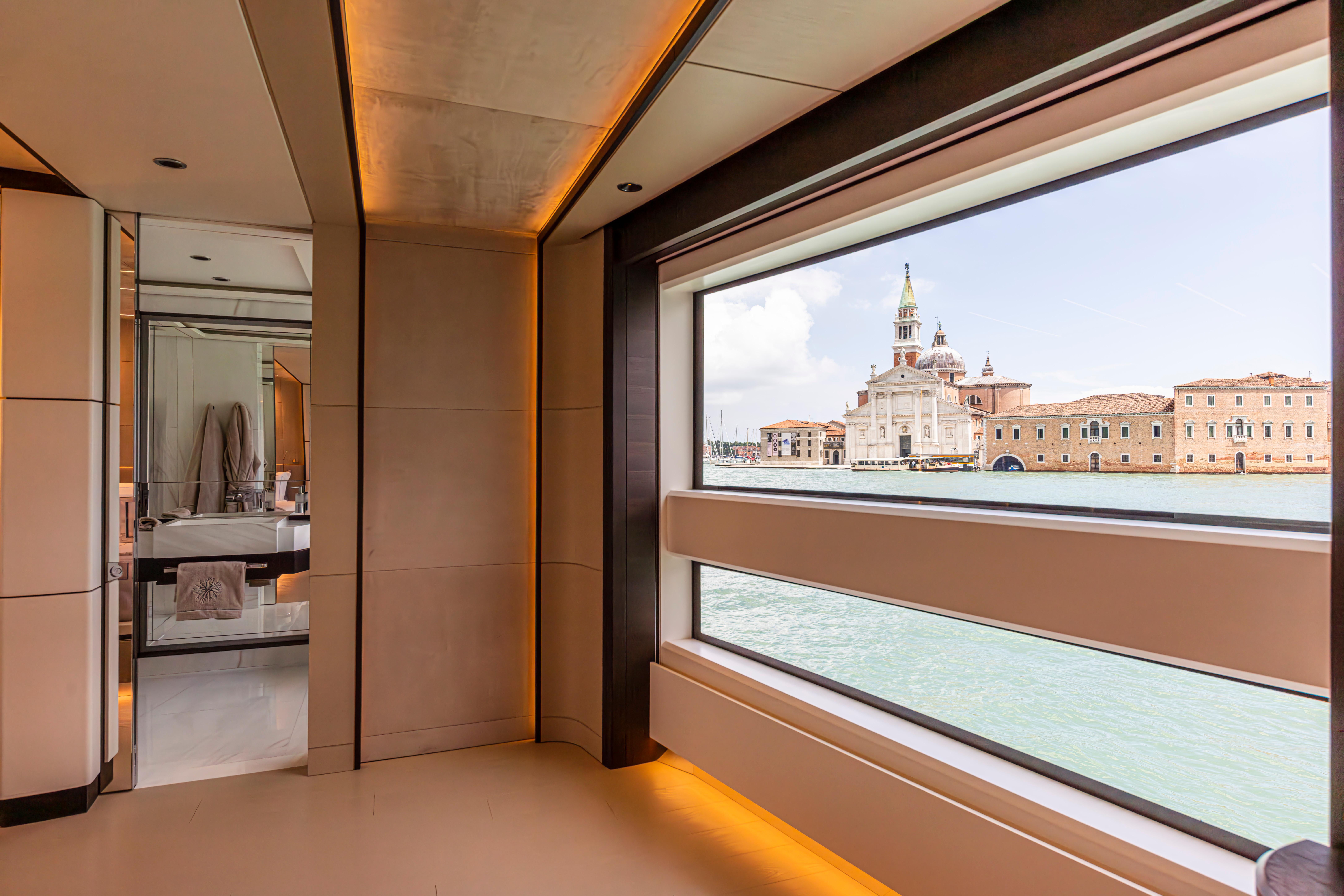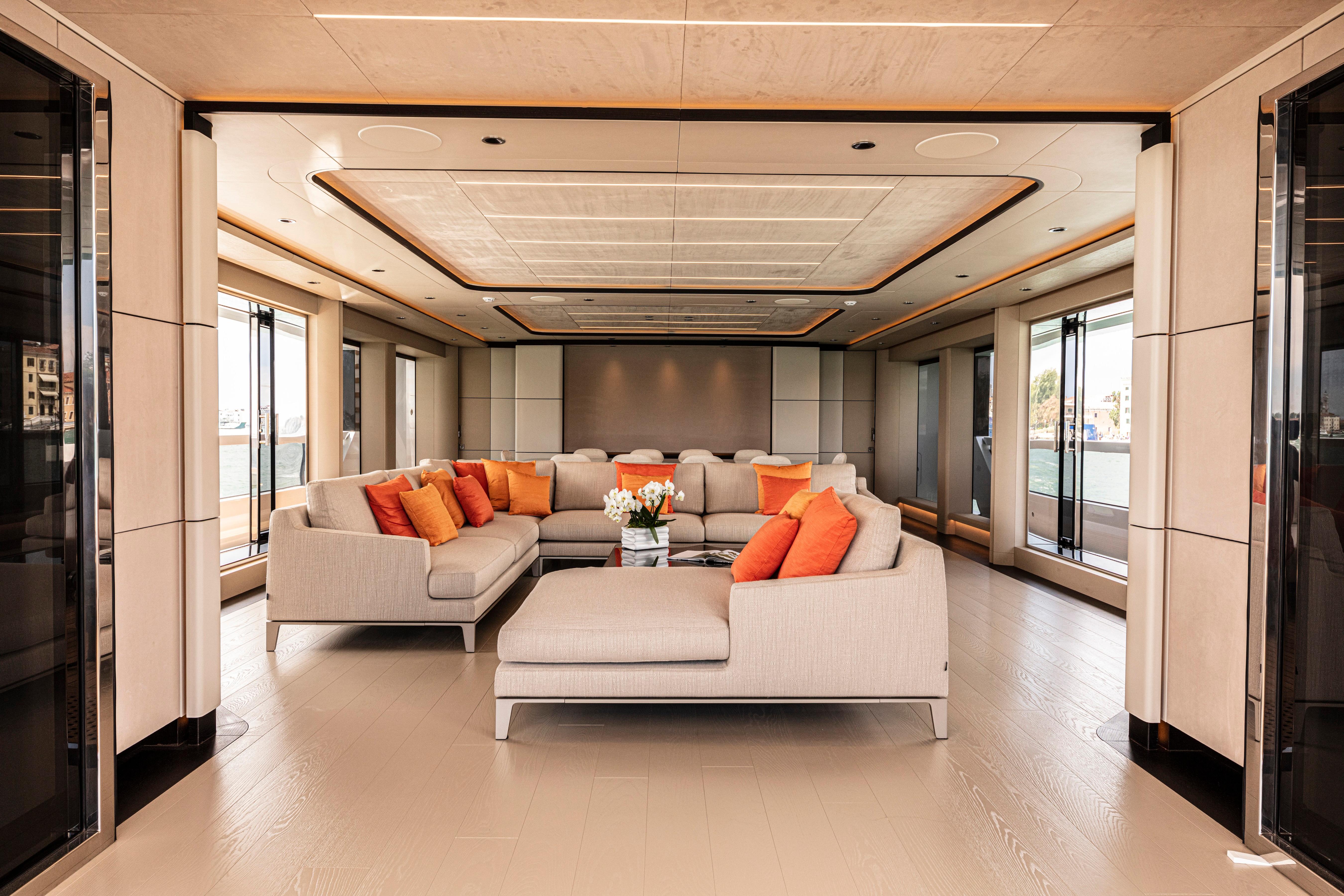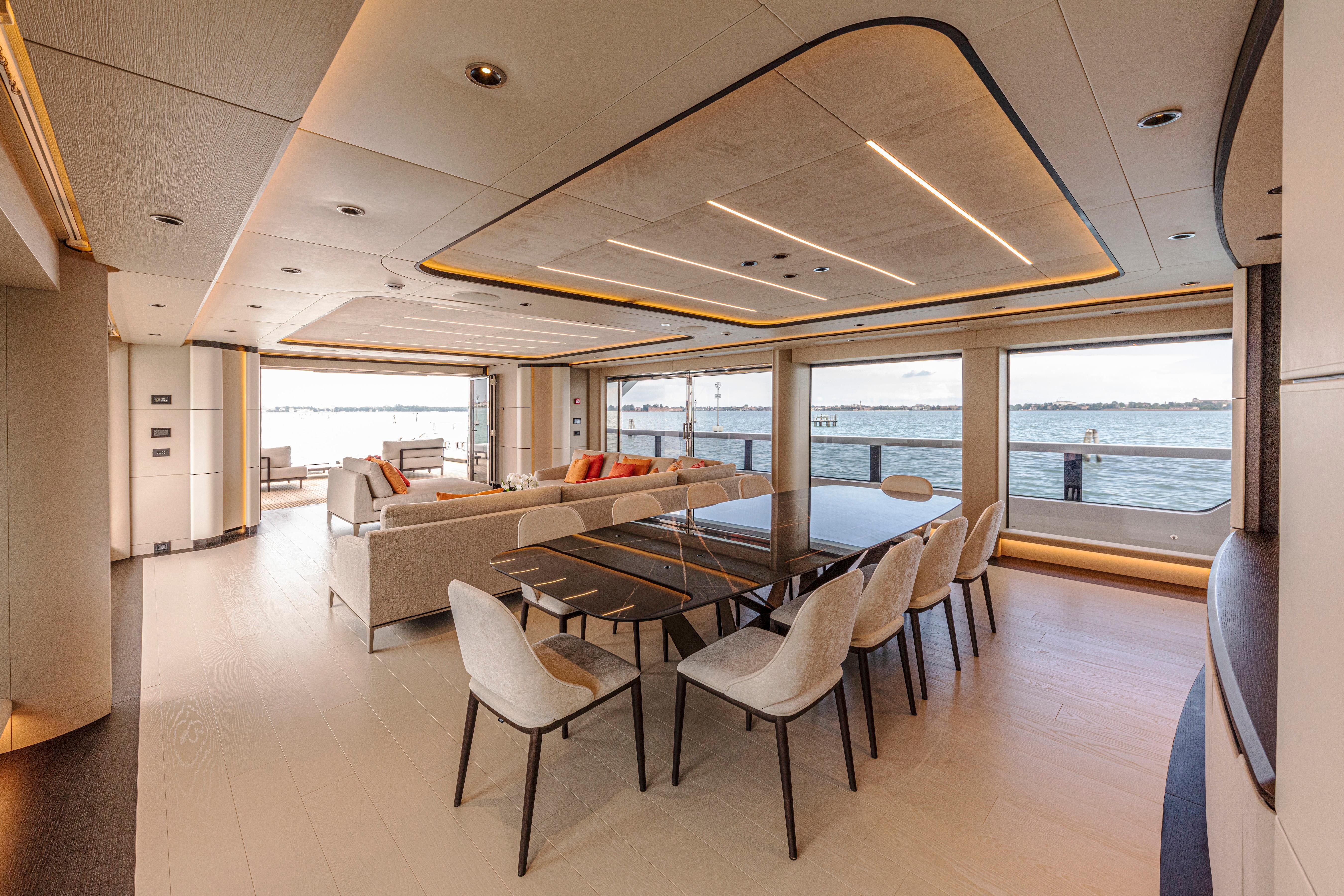 A highlight of the design is the main and upper salons, conceived to be fully openable, allowing for an adaptable living space that merges seamlessly with the exterior, blurring the boundaries between the inside and out. The owner's cabin, transformed into a spacious private apartment, offers expansive sea views and generous sense of space.